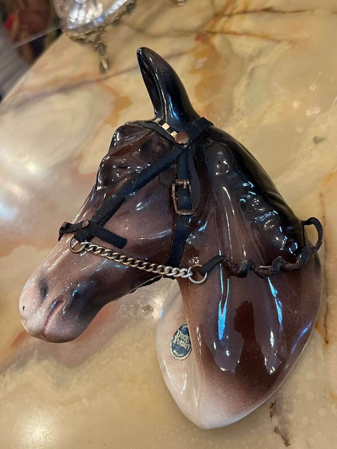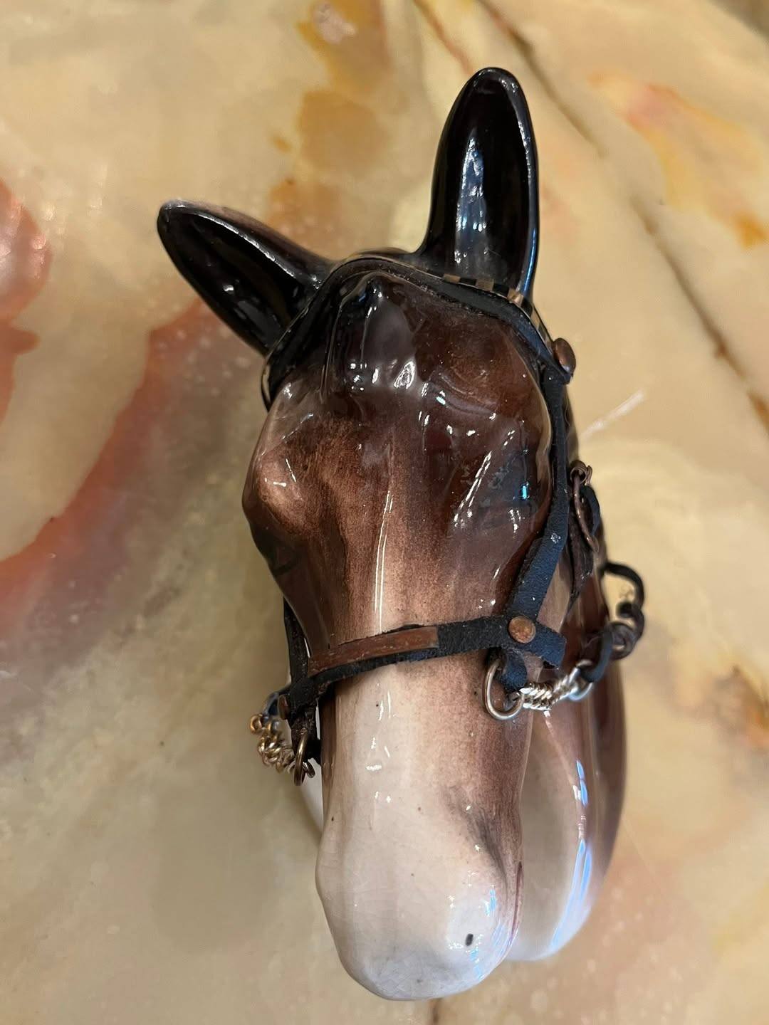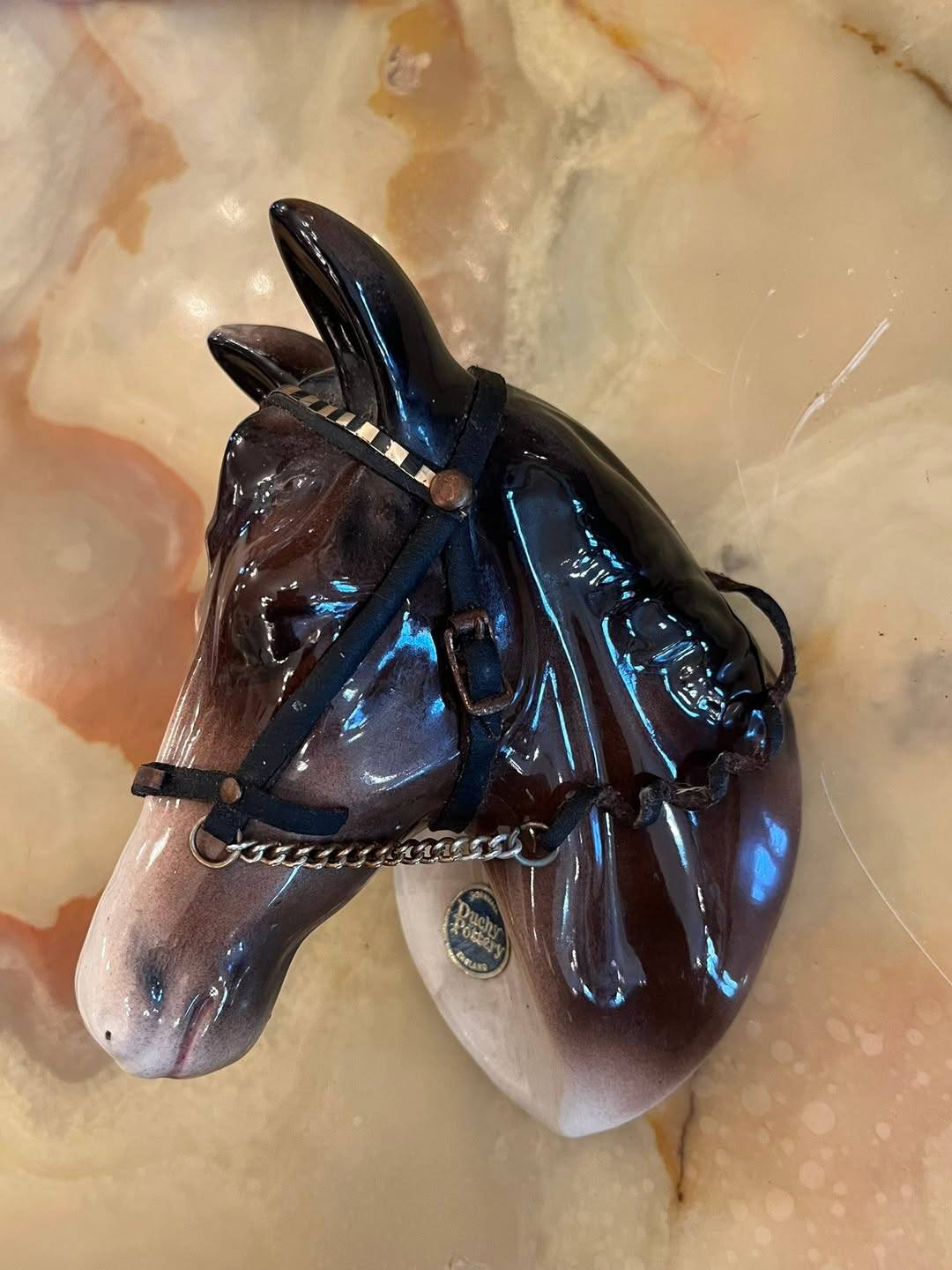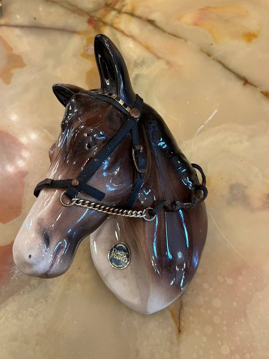 Figurină decorativă reprezentând capul unui cal, realizată din porțelan glazurat, cu ham decorativ din piele și lanț metalic. Piesa este marcată „Duckhamp Pottery – England”, fiind o piesă vintage de colecție.