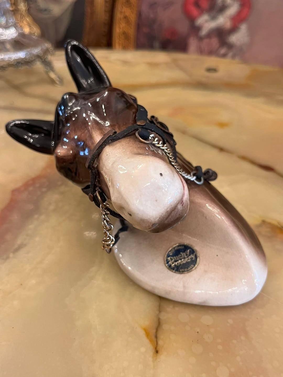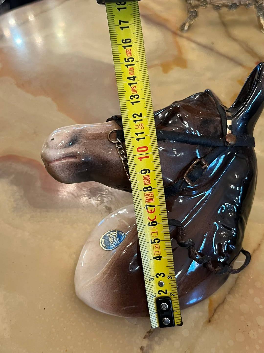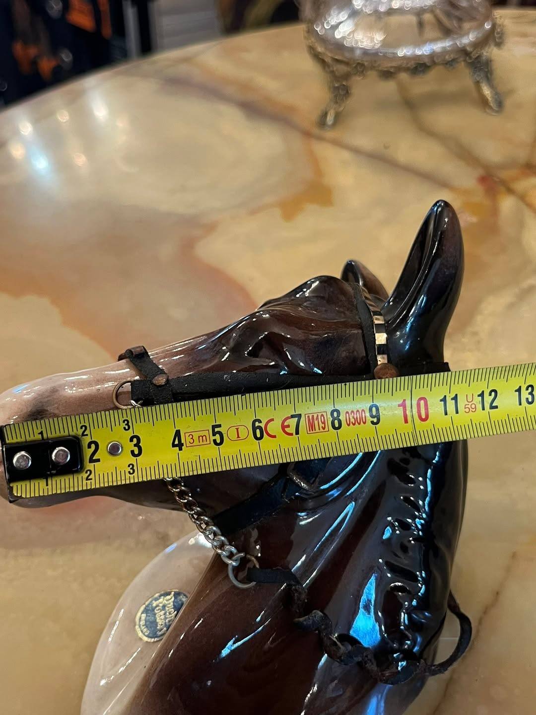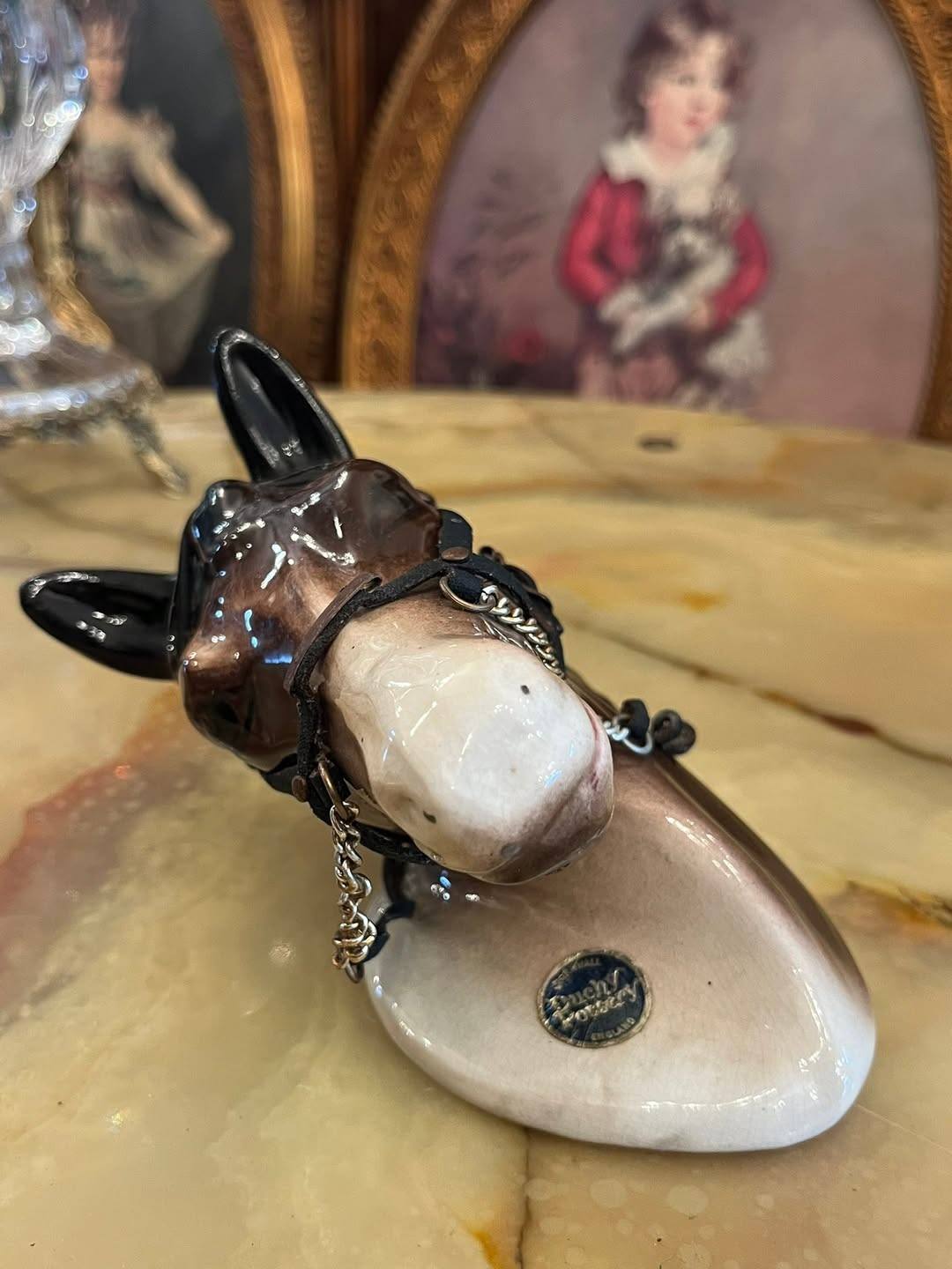 Figurină decorativă reprezentând capul unui cal, realizată din porțelan glazurat, cu ham decorativ din piele și lanț metalic. Piesa este marcată „Duckhamp Pottery – England”, fiind o piesă vintage de colecție.