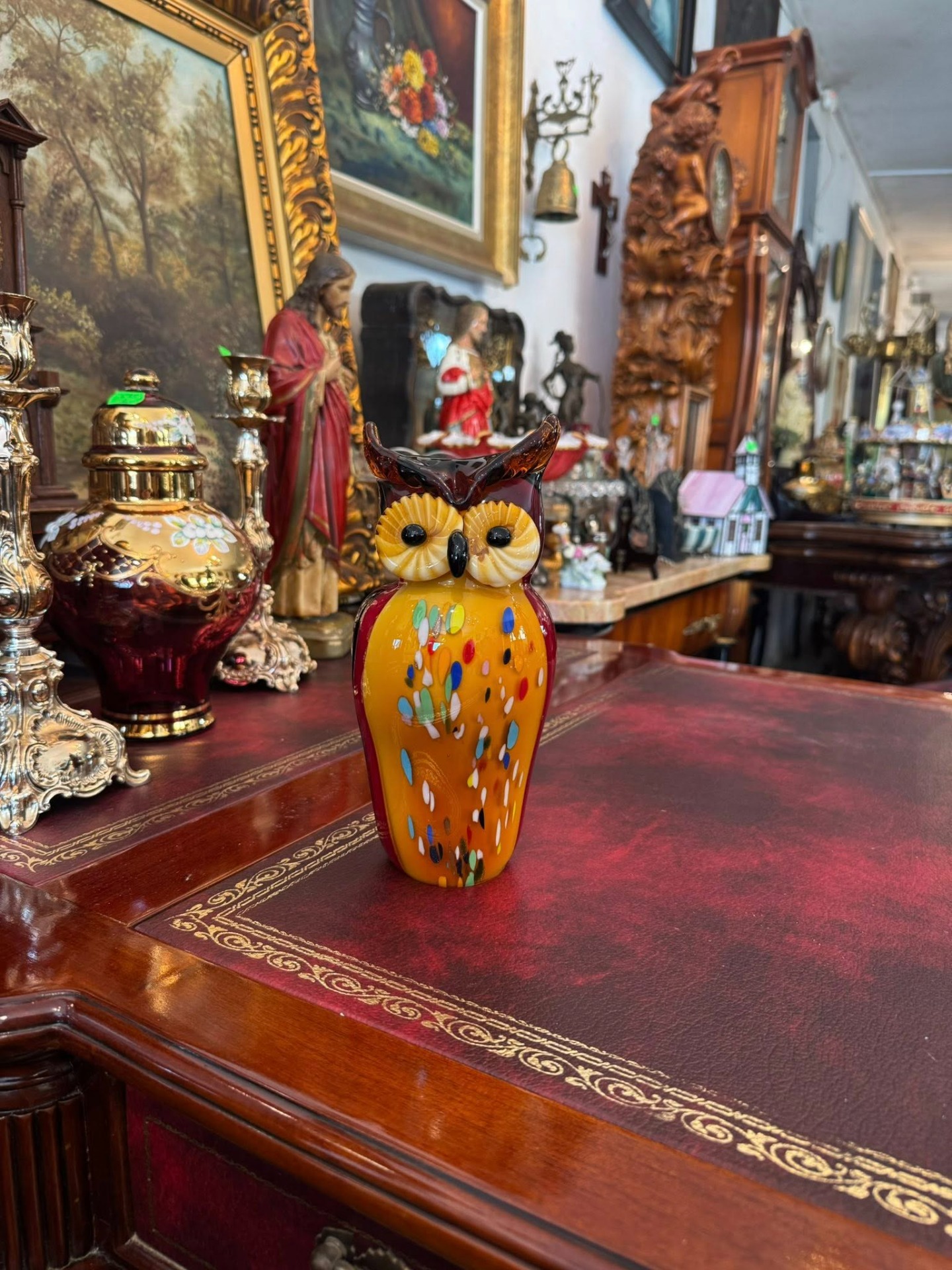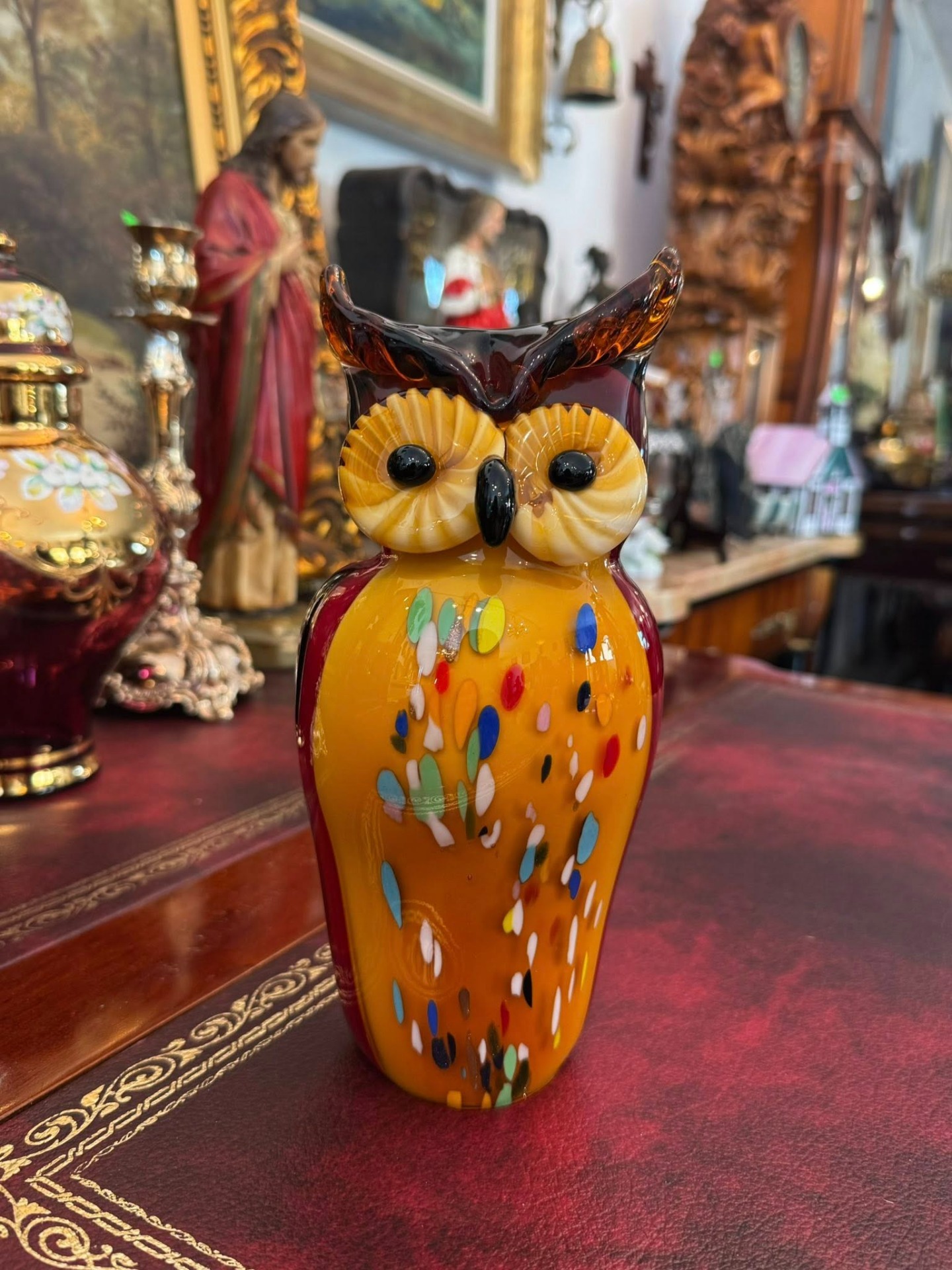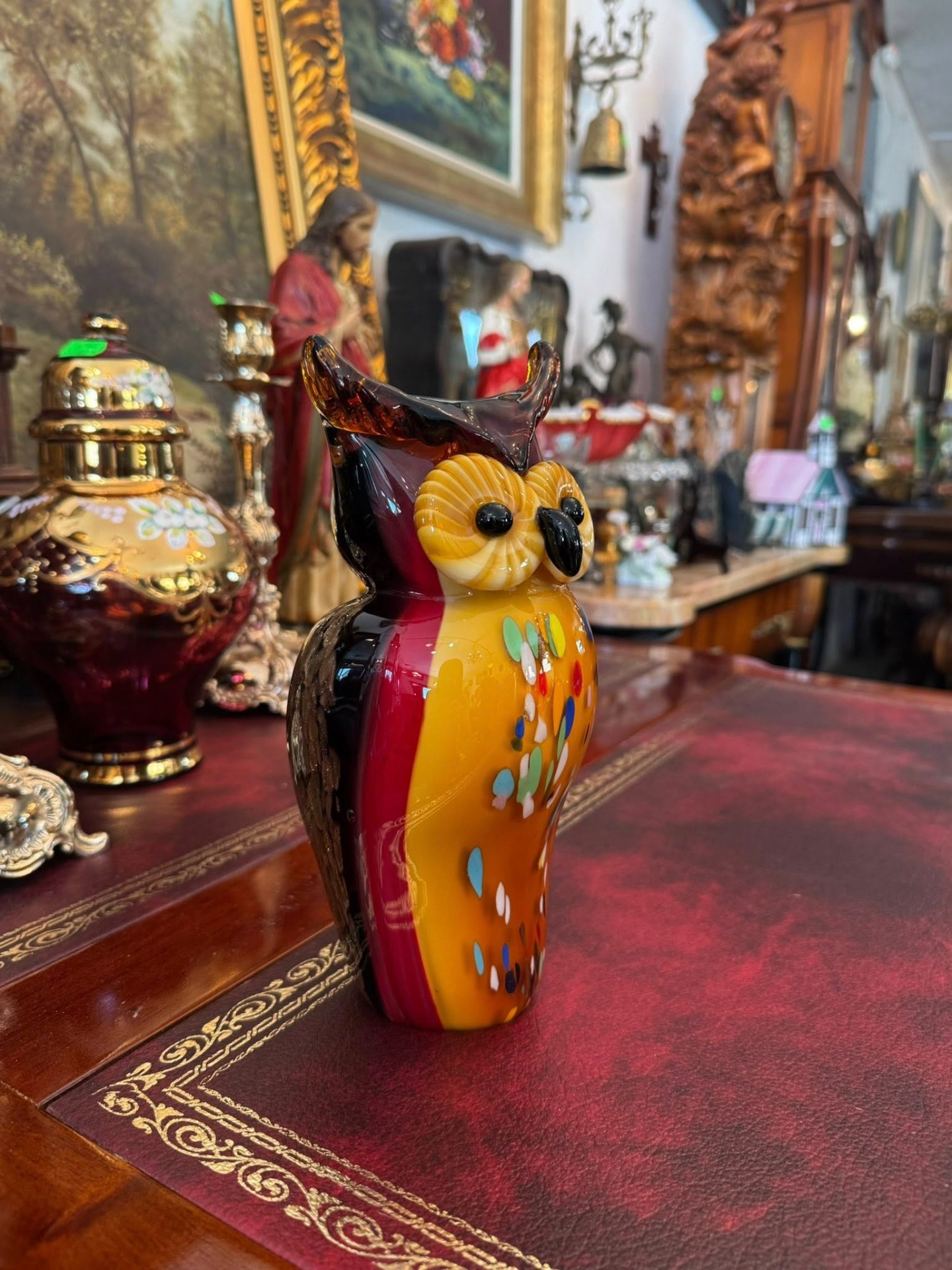 Figurină decorativă sub formă de bufniță, realizată manual din sticlă în stil Murano, având o paletă de culori extrem de bogată și caldă.