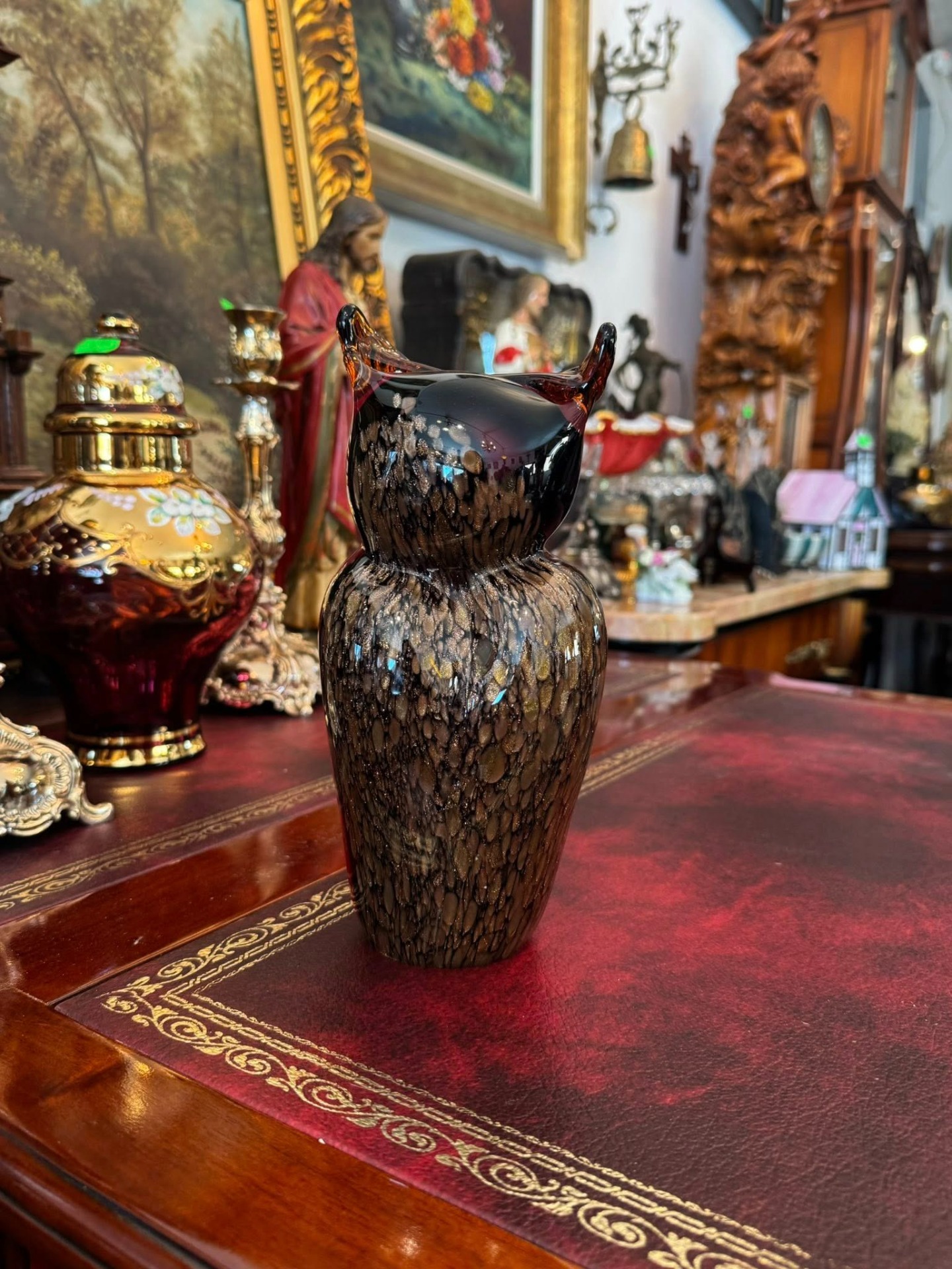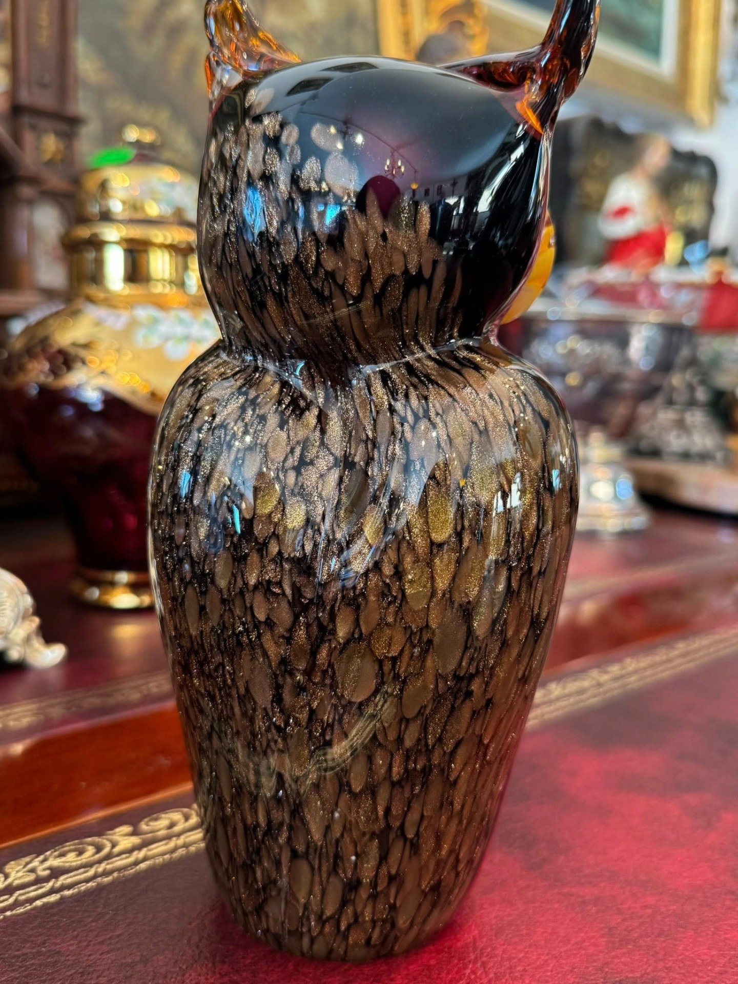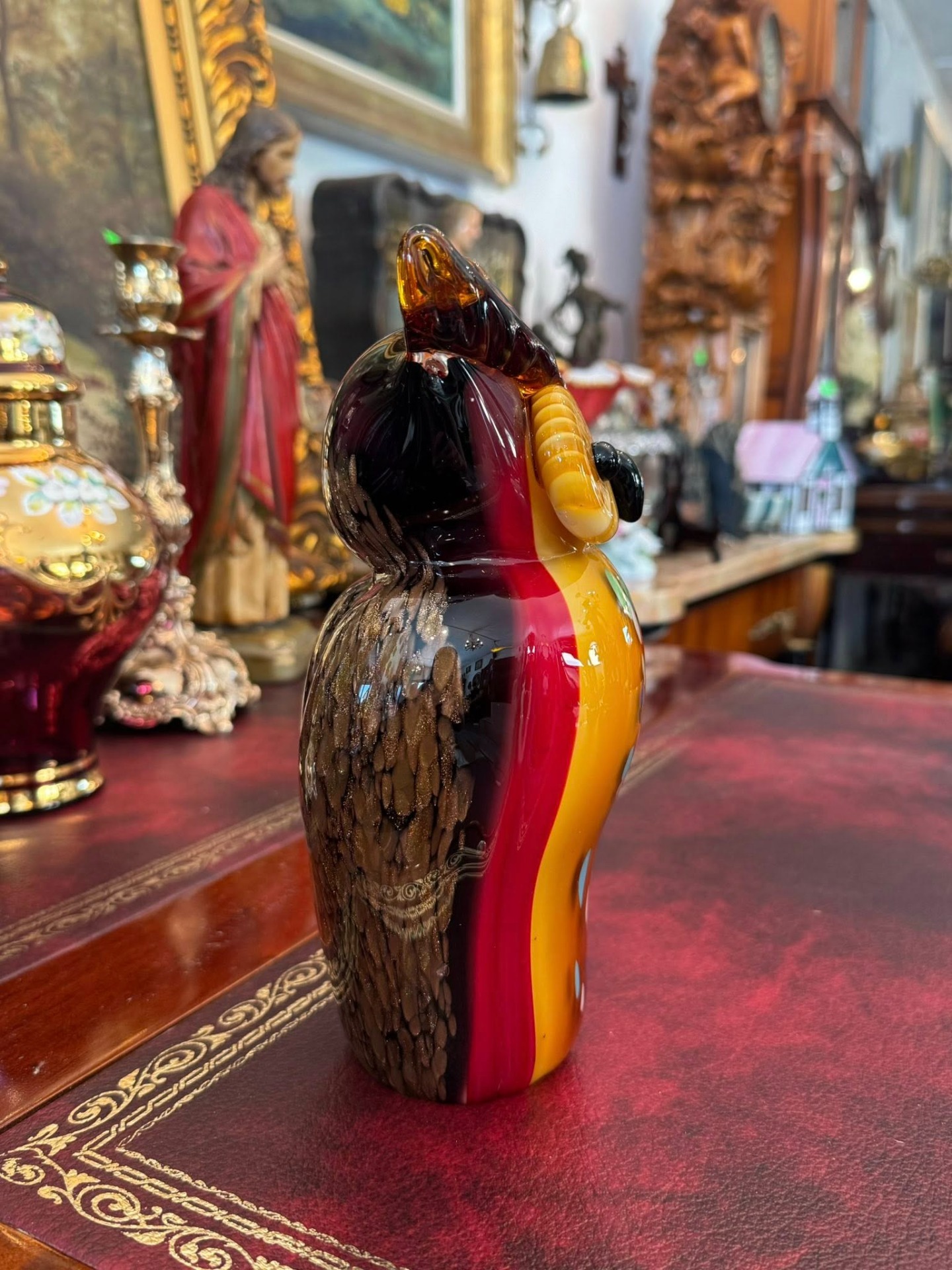 Figurină decorativă sub formă de bufniță, realizată manual din sticlă în stil Murano, având o paletă de culori extrem de bogată și caldă.