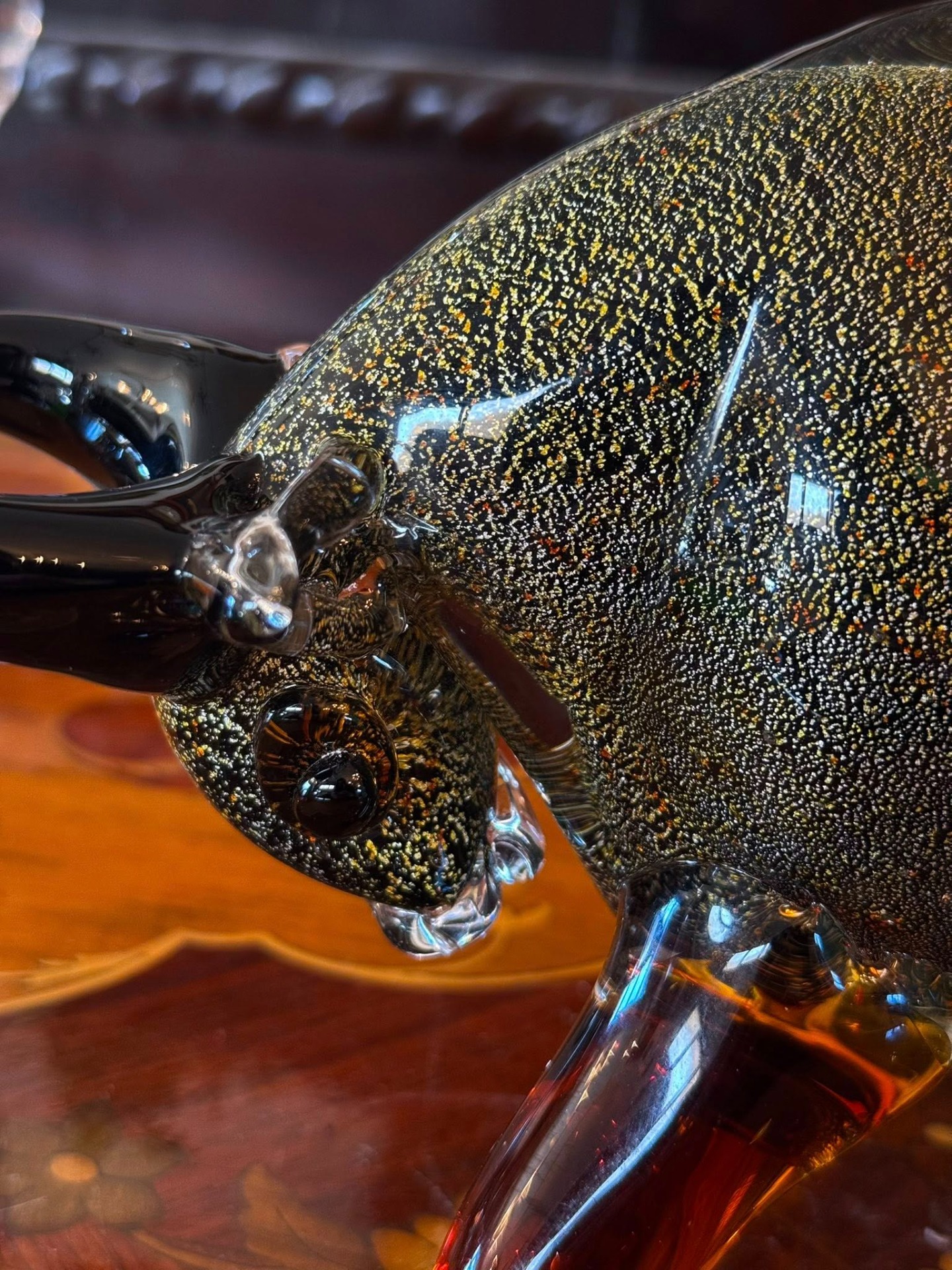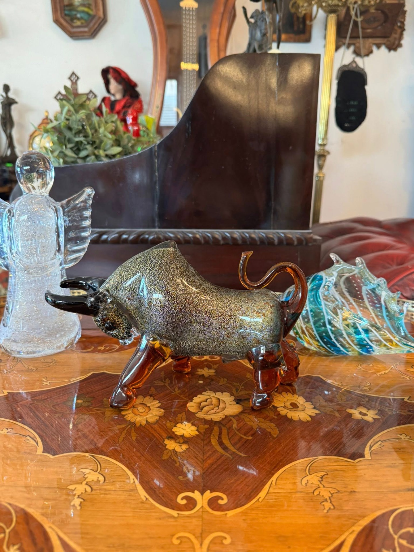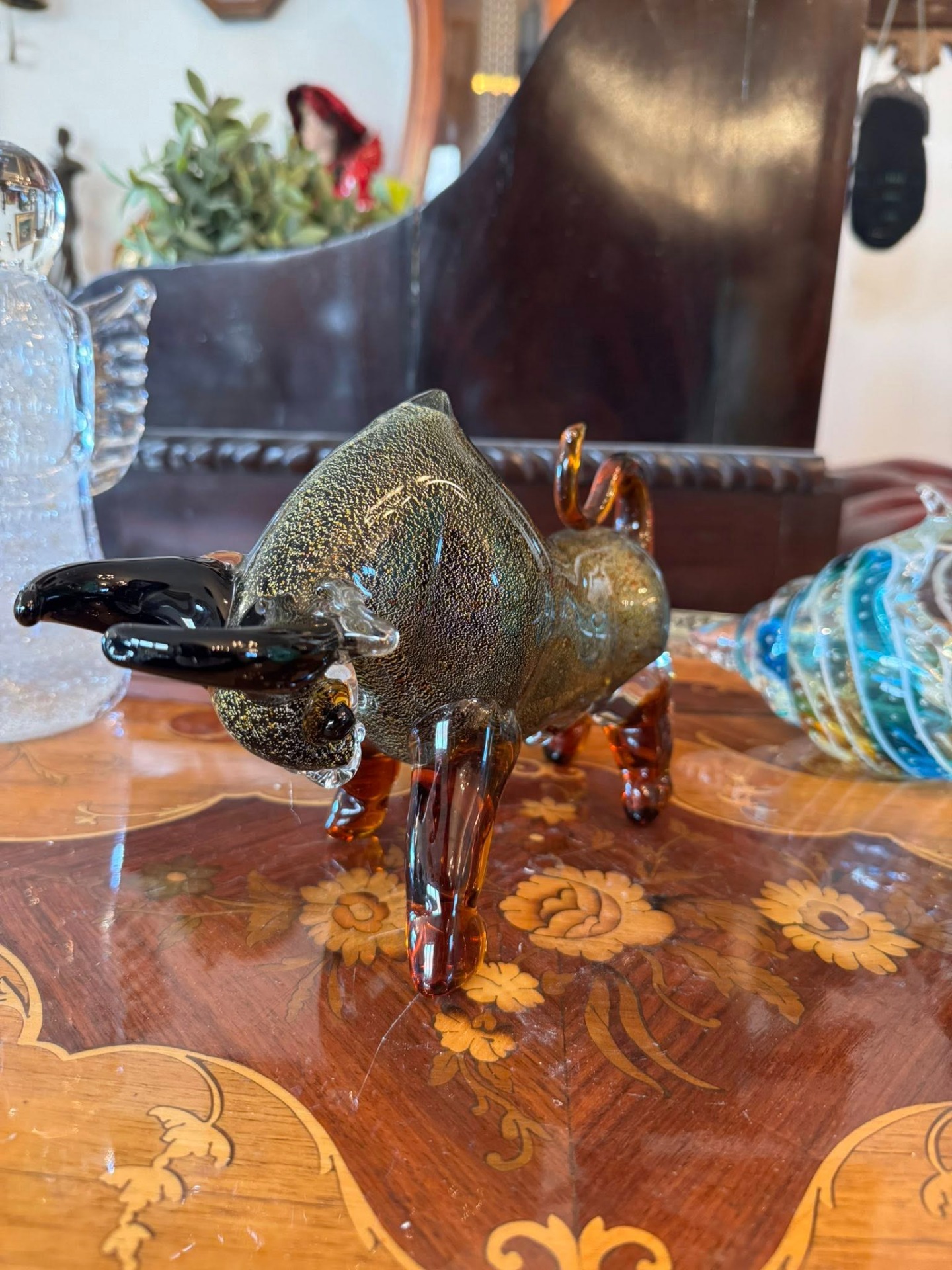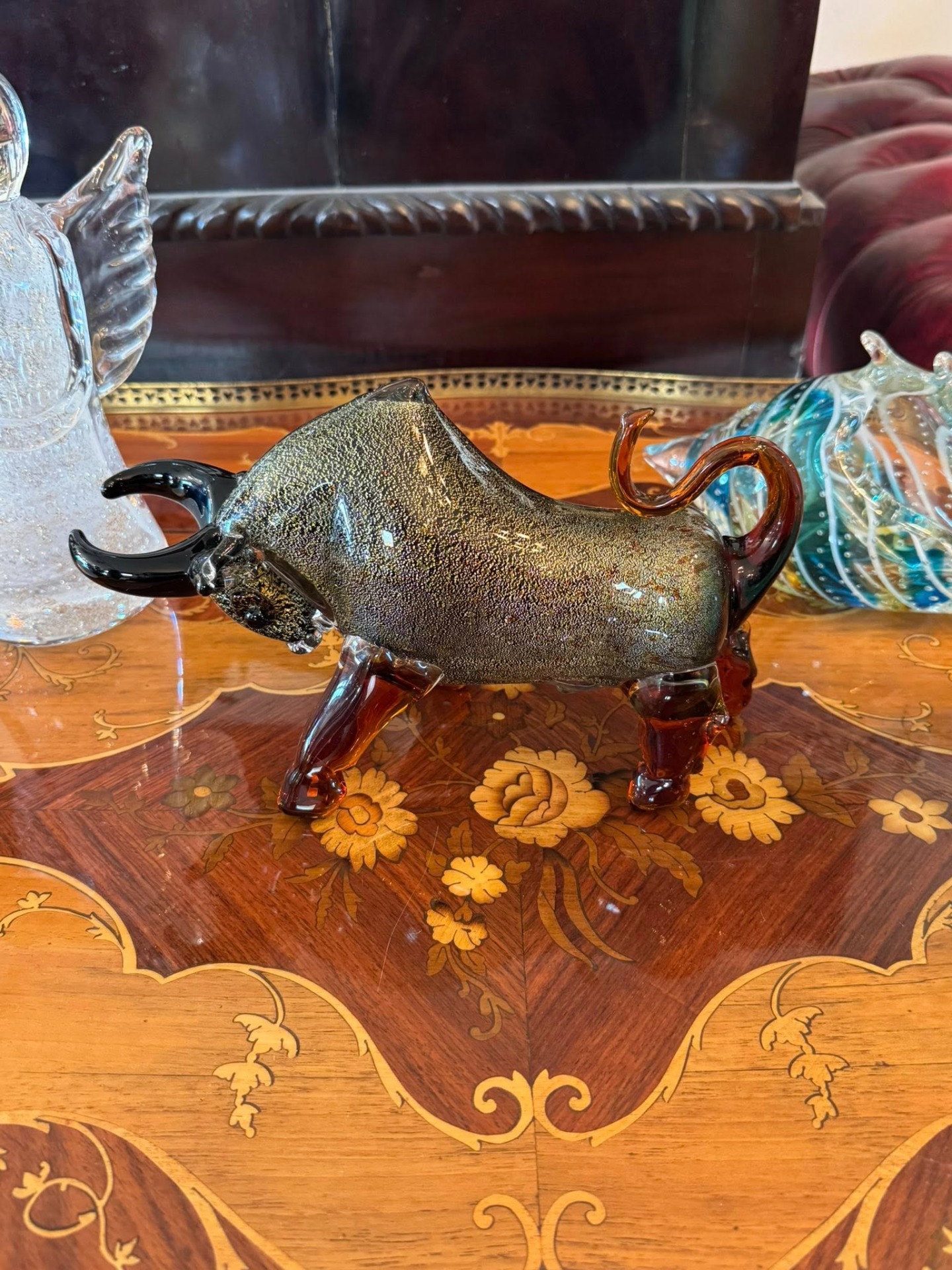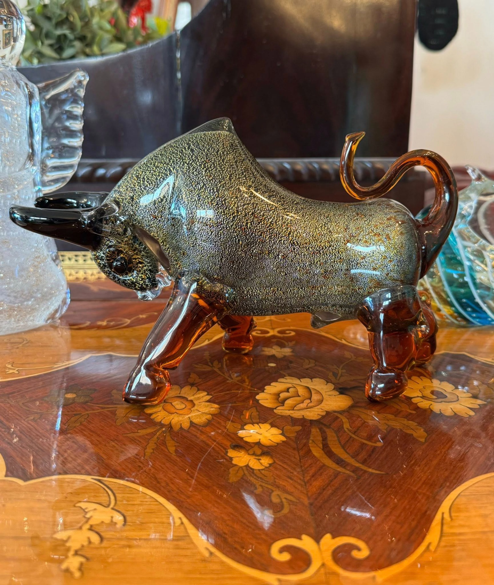 Figurină din sticlă în stil Murano, stilizată sub forma unui taur.