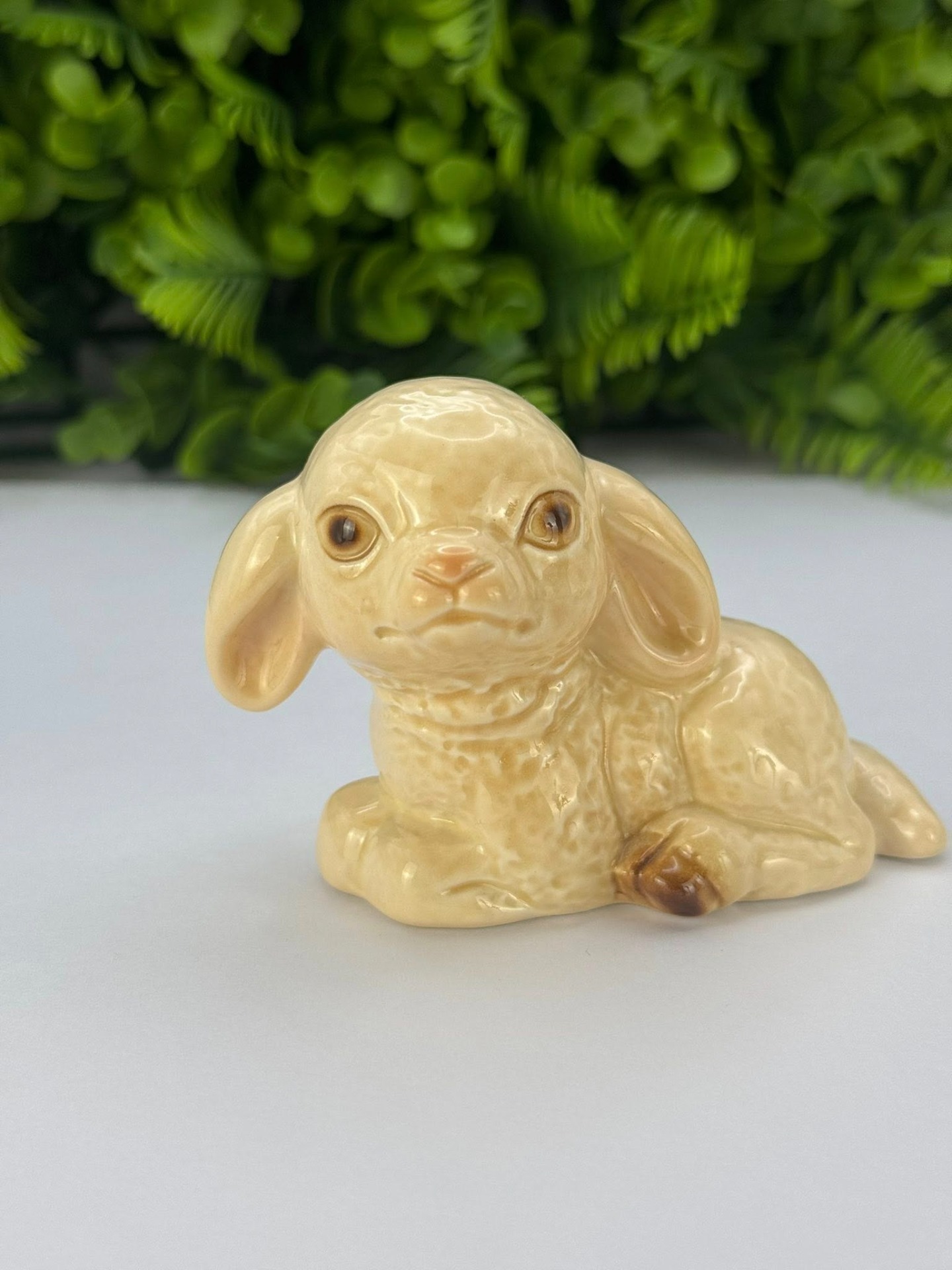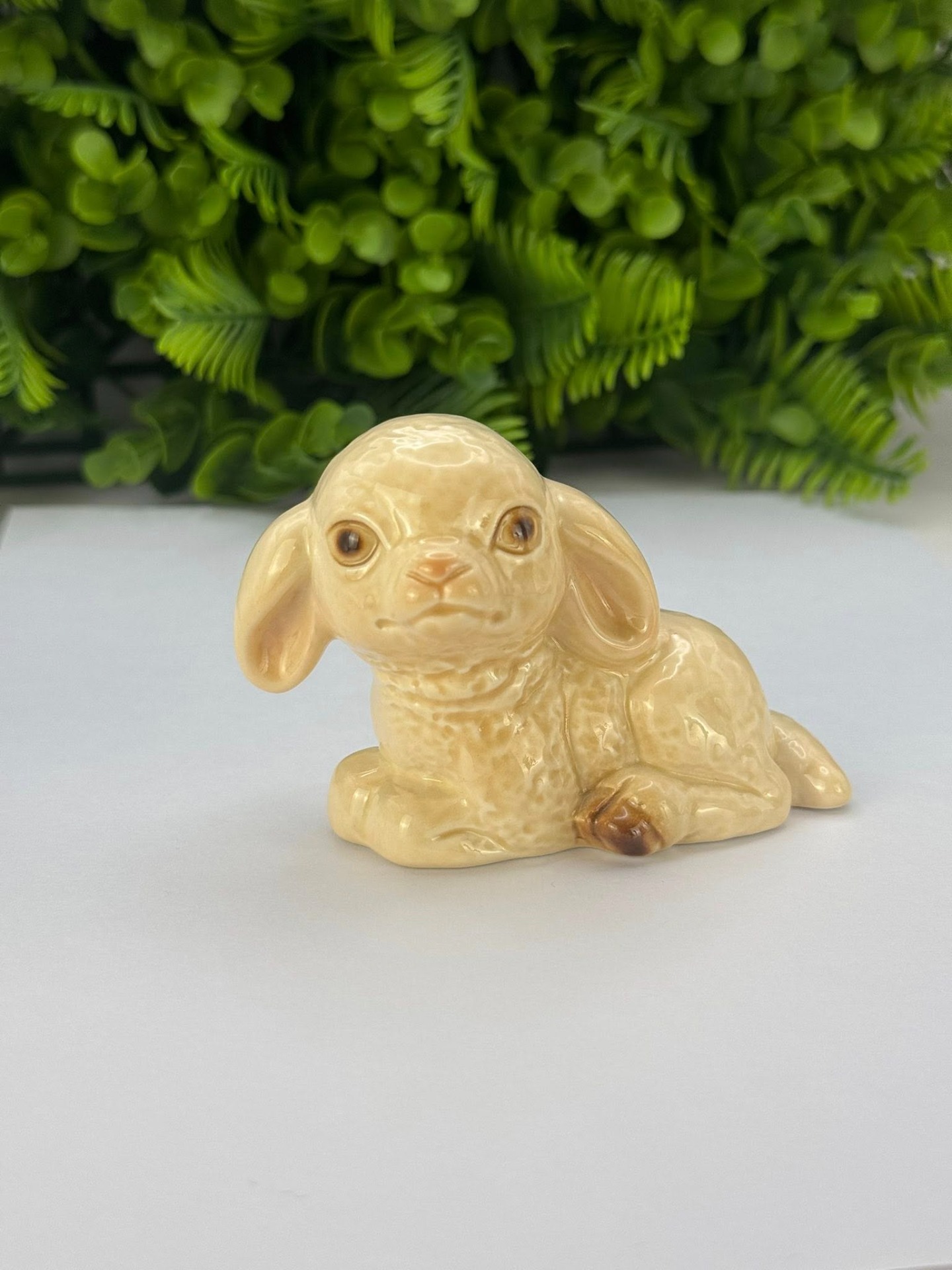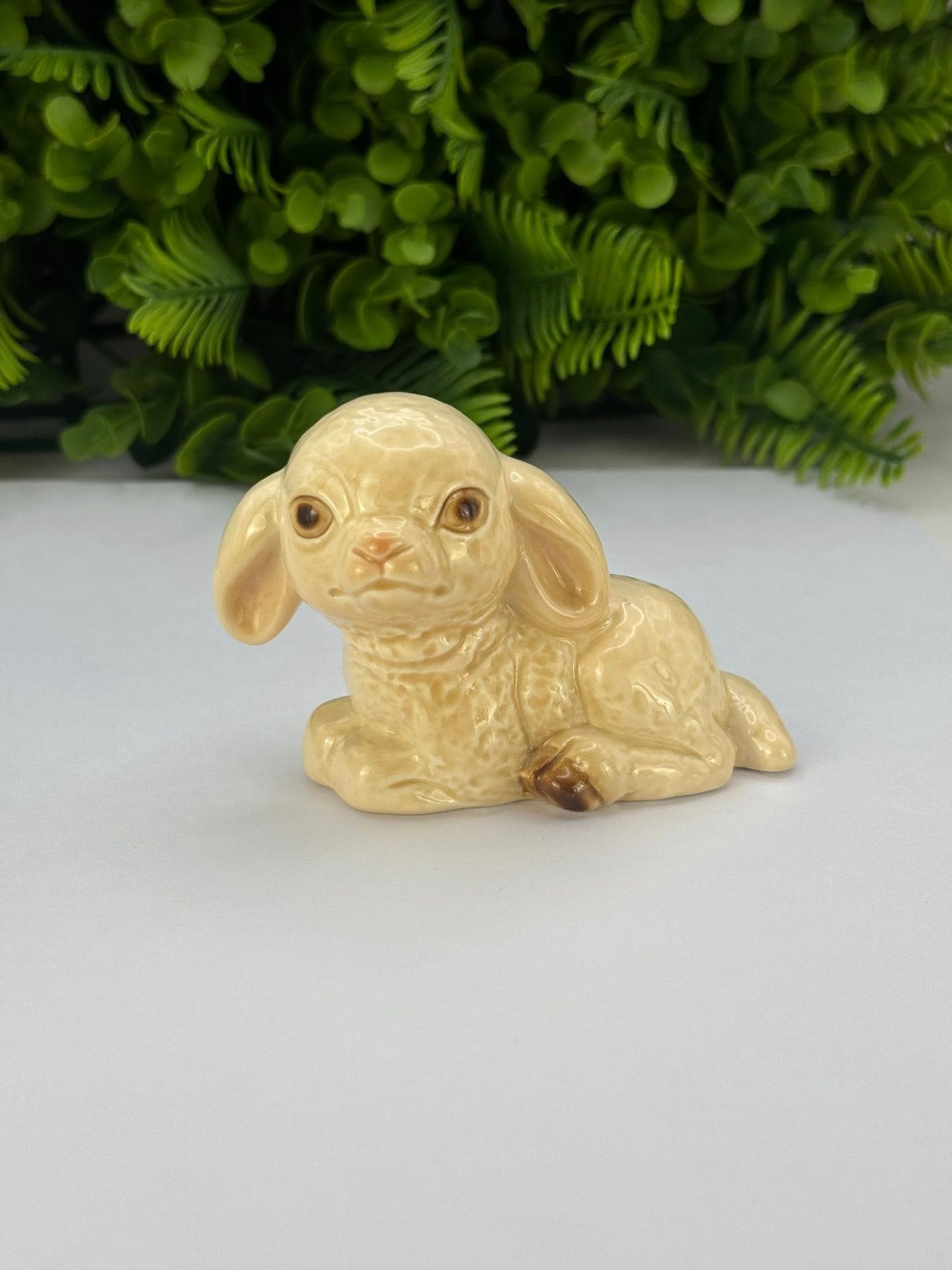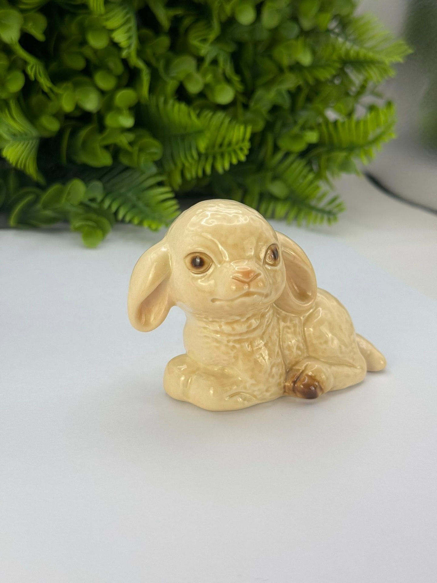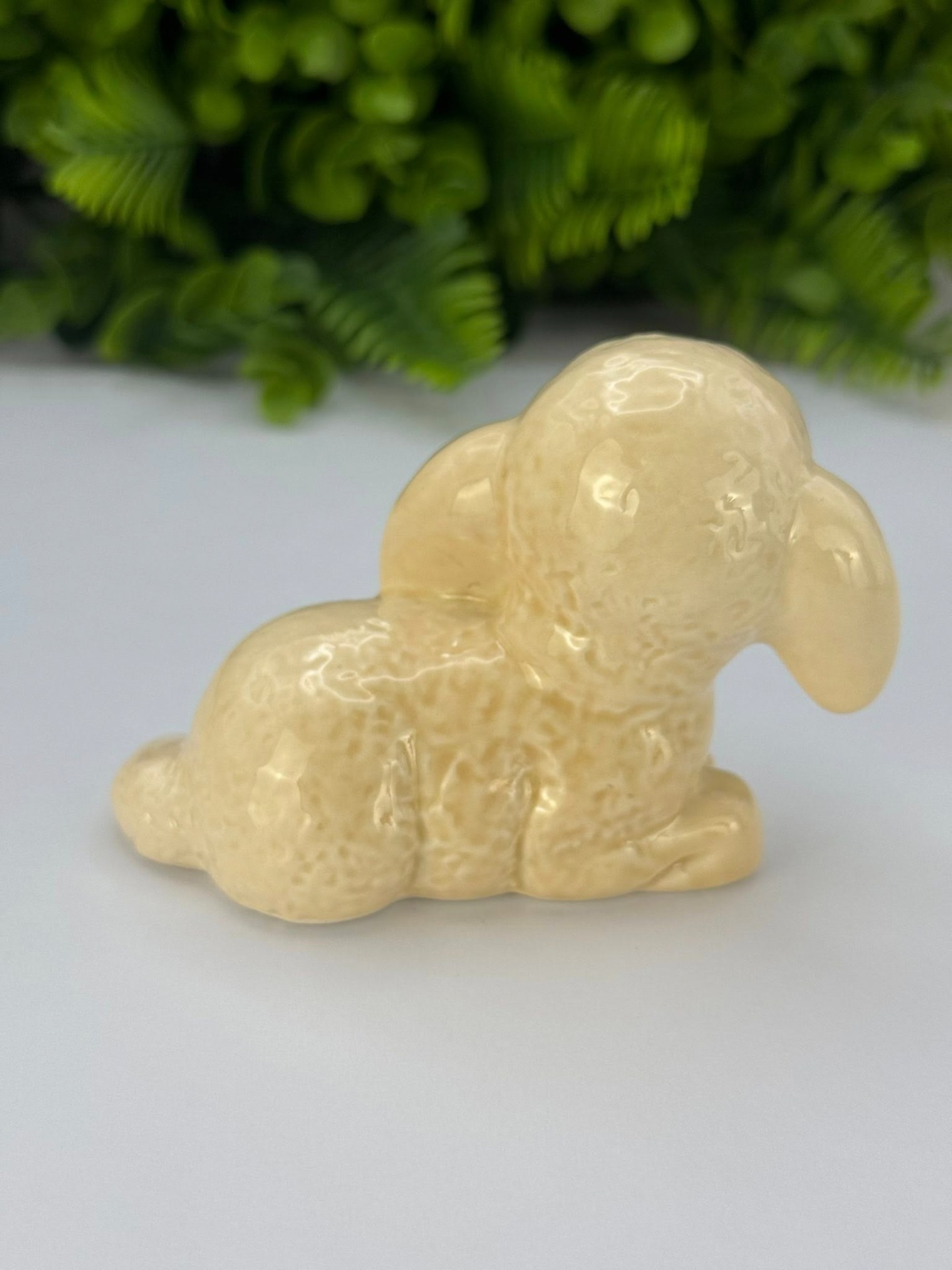 Figurină mielușel, realizată din porțelan glazurat (pictat manual) de calitate superioară, cu un finisaj lucios în nuanțe calde de bej și detalii maronii la