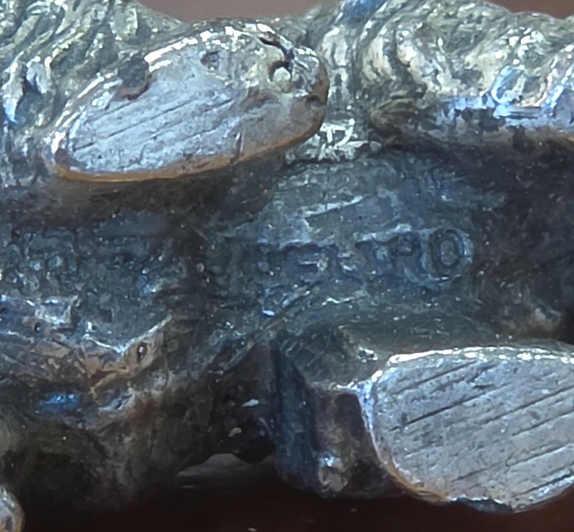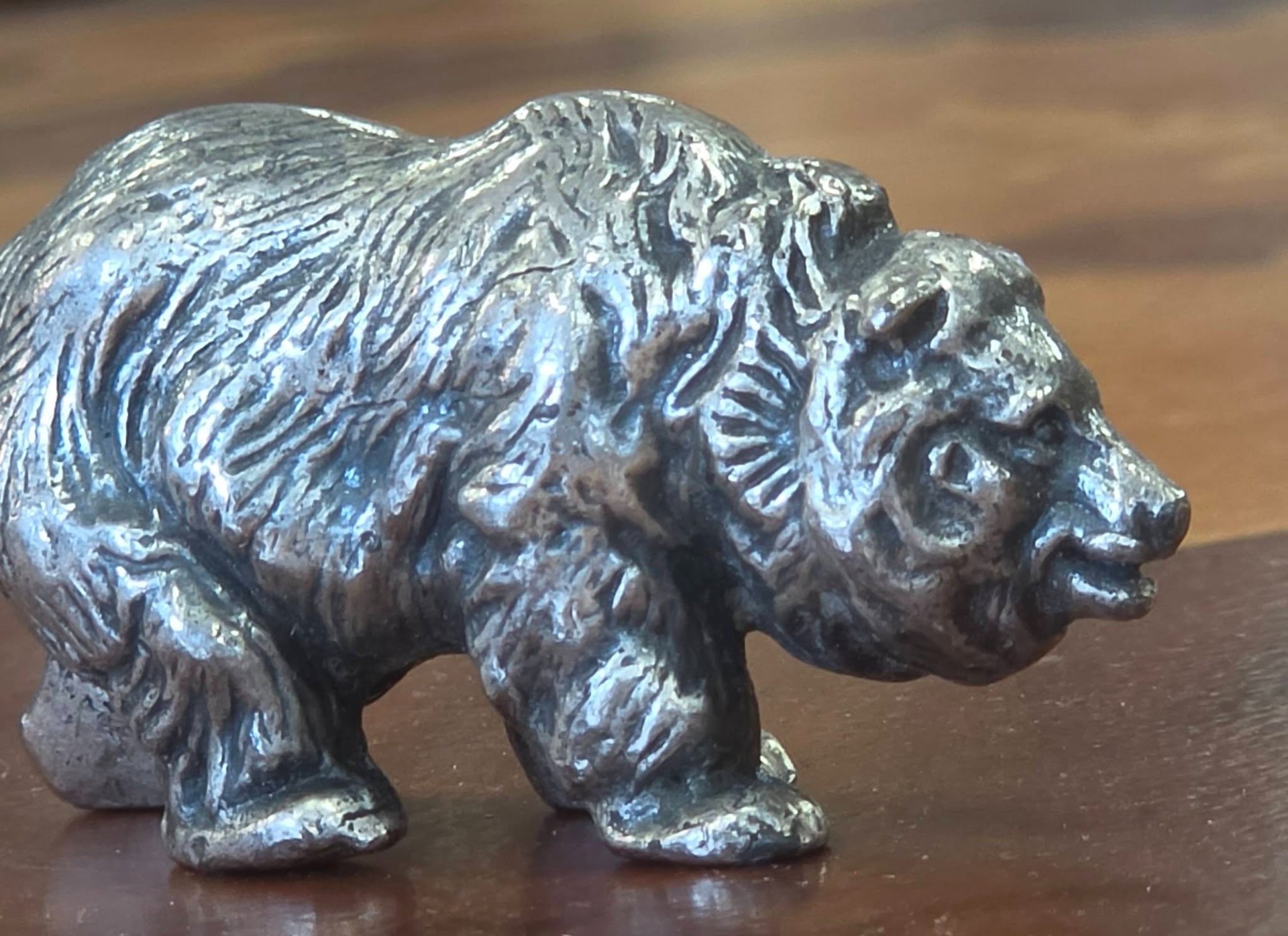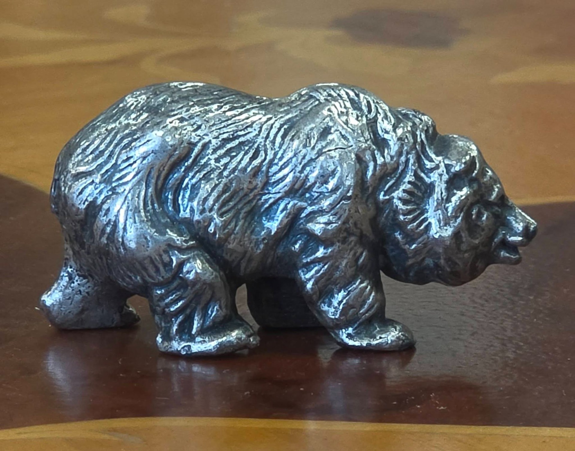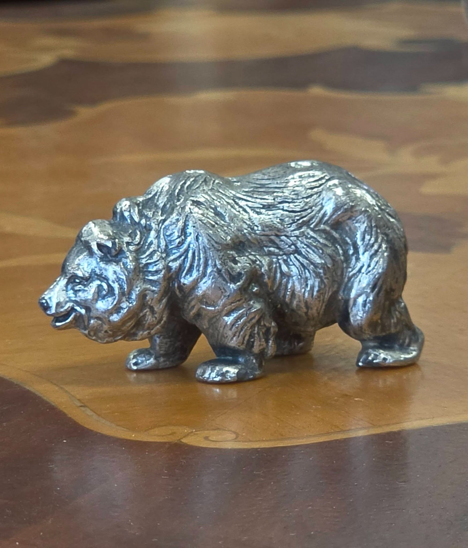 Figurină vintage de colecție, urs din cositor (Peltro), cu detalii deosebite, textura blănii și musculatura fiind reliefate realist, piesă de o greutate considerabilă pentru dimensiunea ei (178g), ideală pentru colecționari, decor birou (poate fi folosită și ca prespapir) sau cadou pentru pasionații de vânătoare.