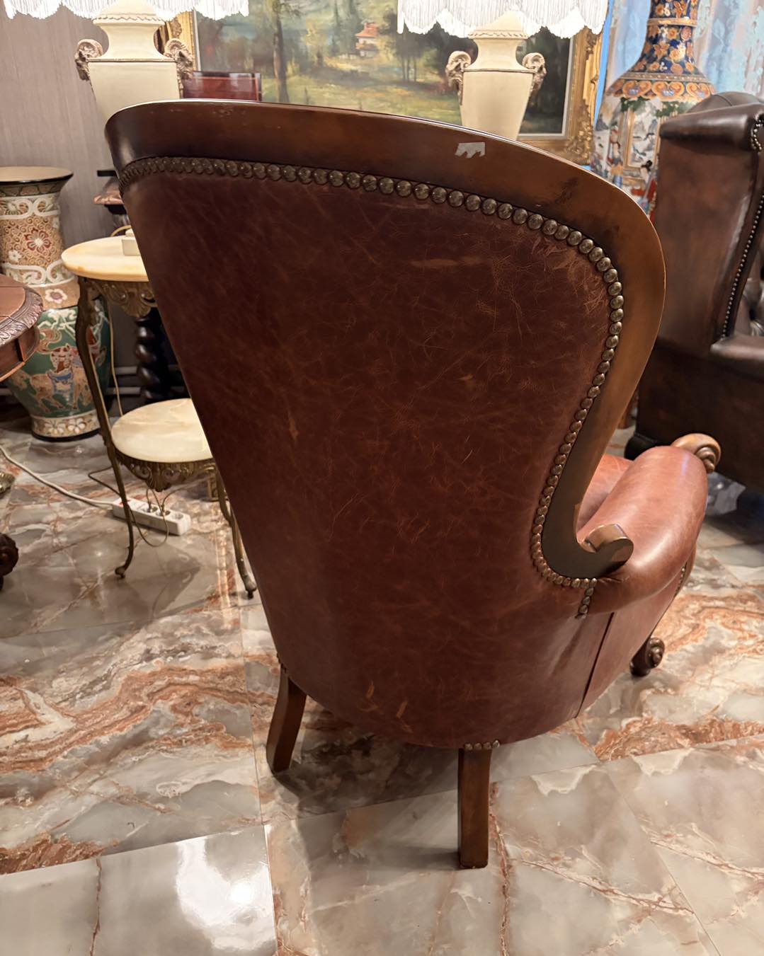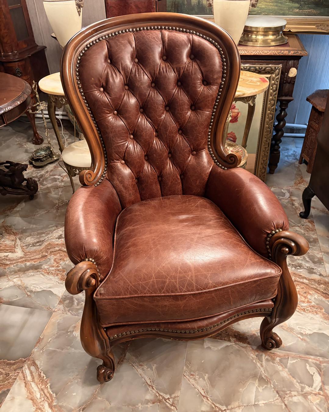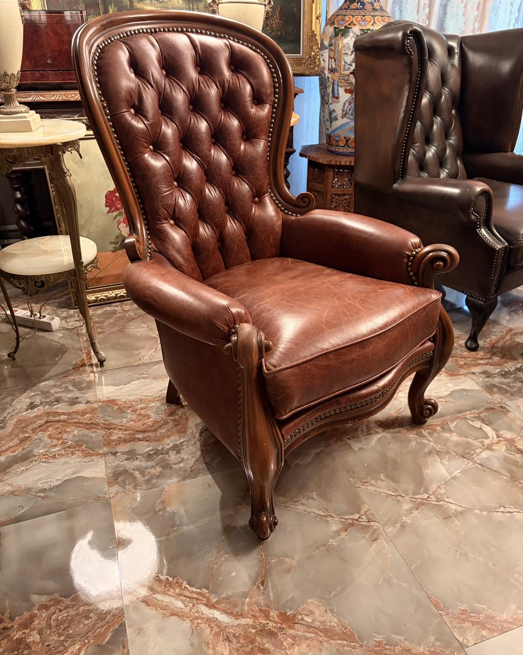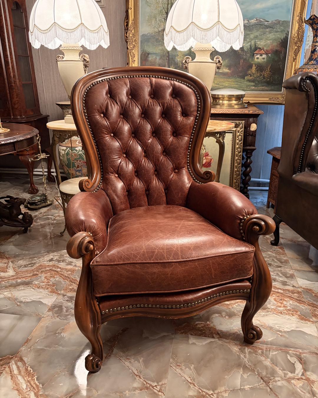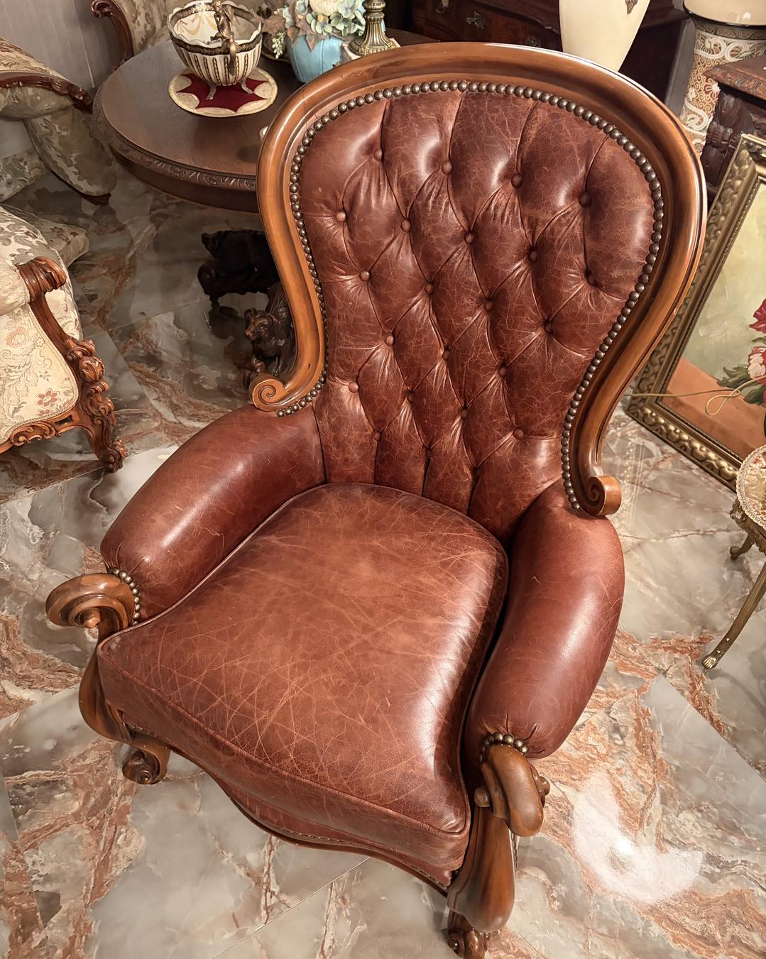 Materiale Cheie: Piele maro patinată (distressed leather) și lemn sculptat, cel mai probabil nuc