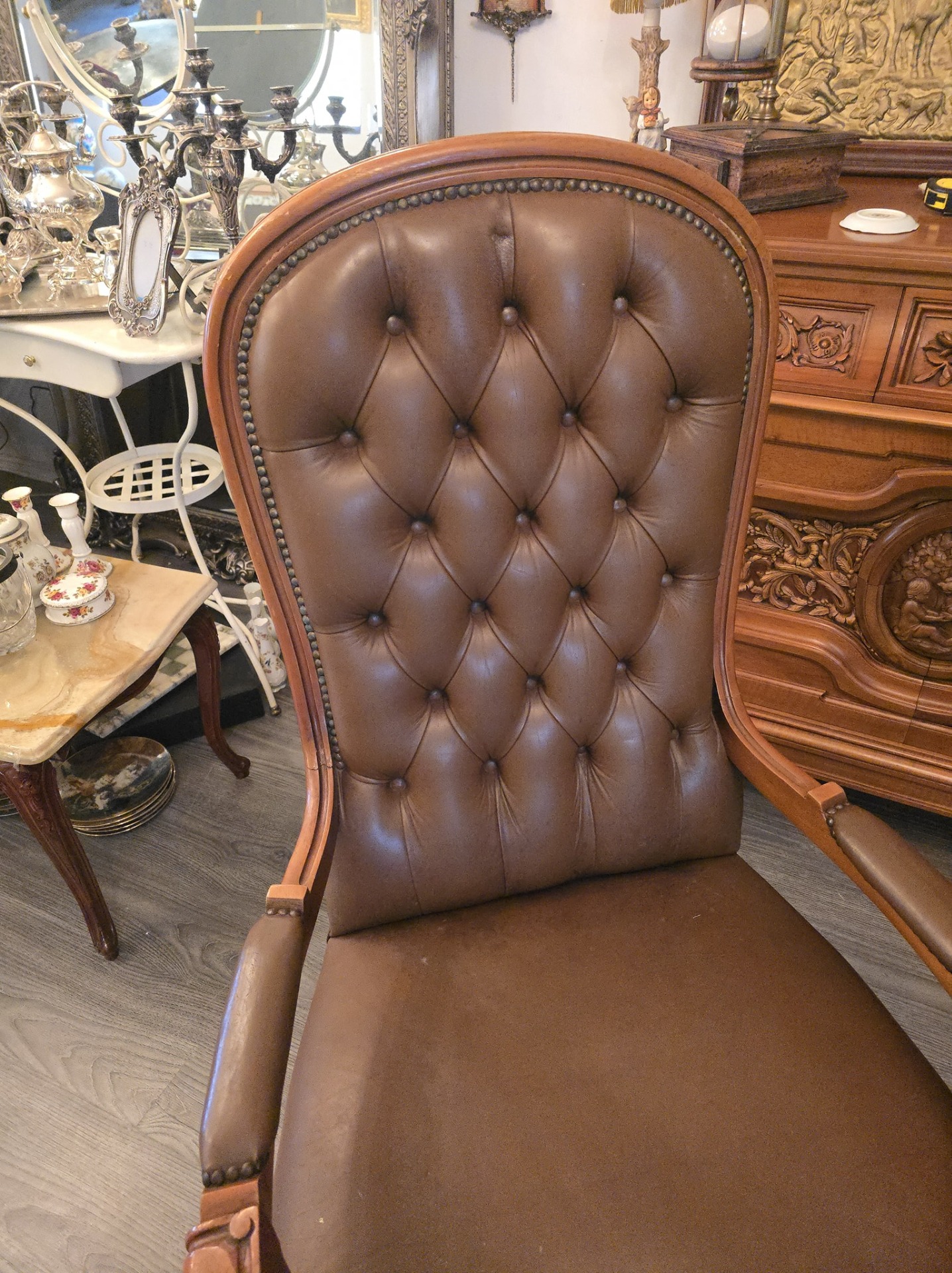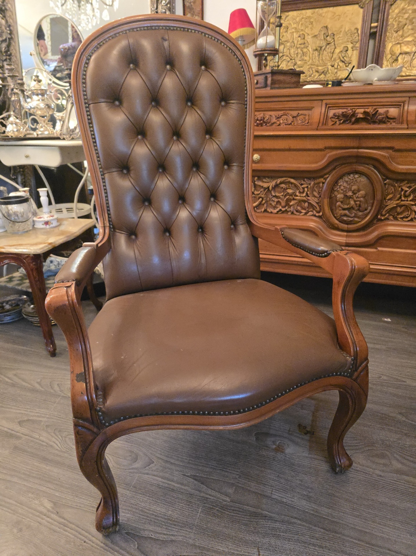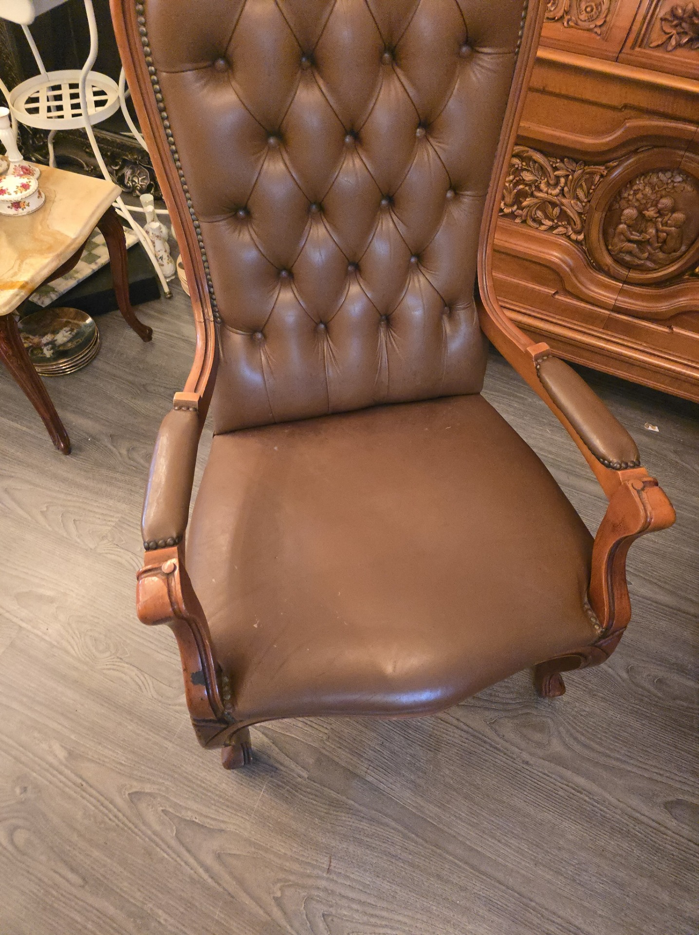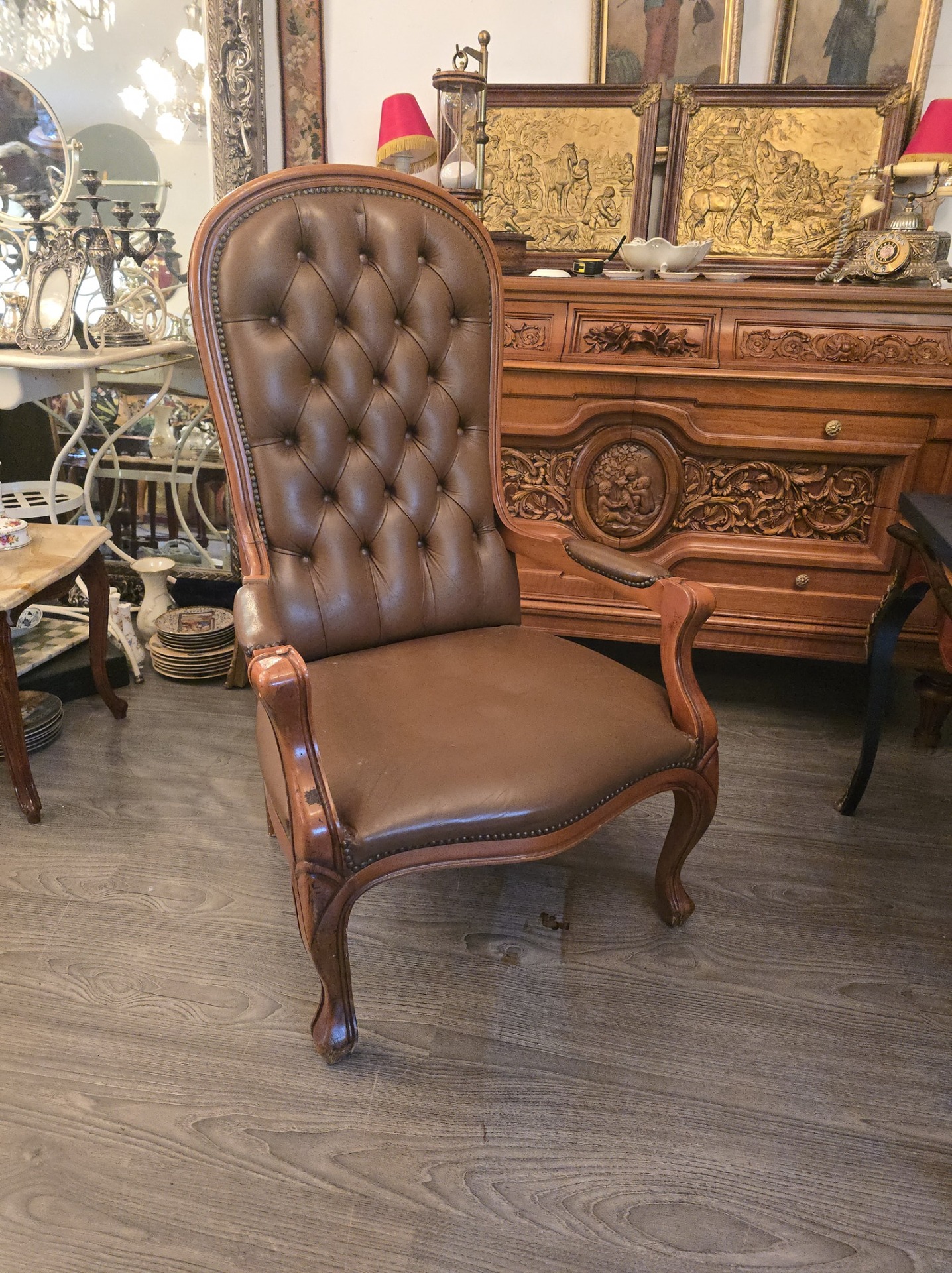 Fotoliu Tradițional (Stil Louis XV) sau Fotoliu cu Spătar Înalt din Piele, în Stil Provincial Francez. Este o piesă elegantă, formală și confortabilă.