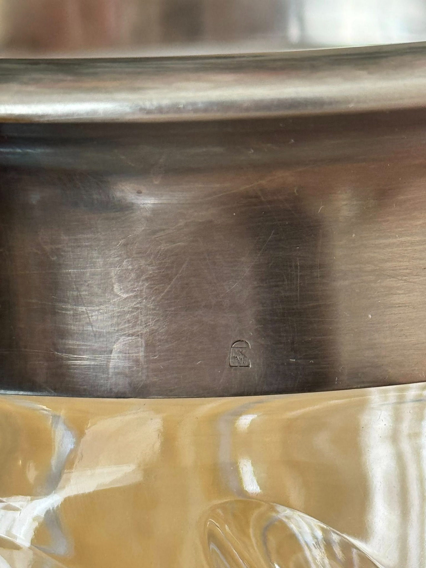 Pe bordura metalică se poate observa un marcaj de autenticitate (un scut cu inițiale), specific atelierelor europene de orfevrerie.