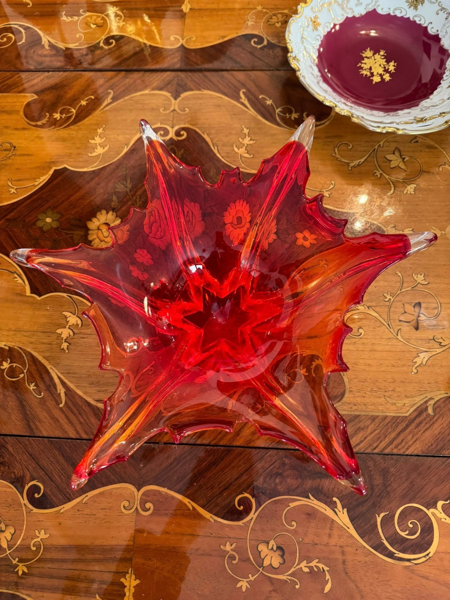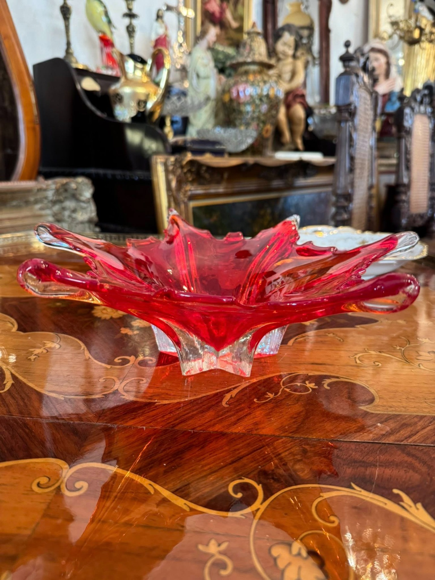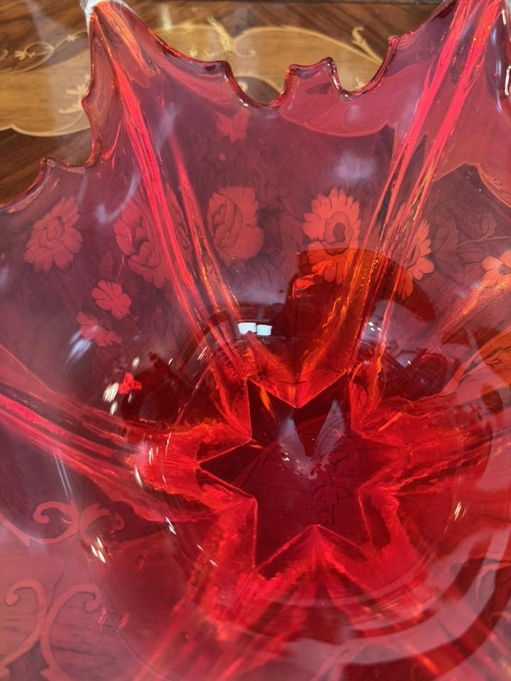 Fructieră decorativă spectaculoasă, realizată din sticlă în stil Murano, de culoare rubinie. Se încadrează în curentul Mid-Century Modern (anii '50 - '70)- Italia.