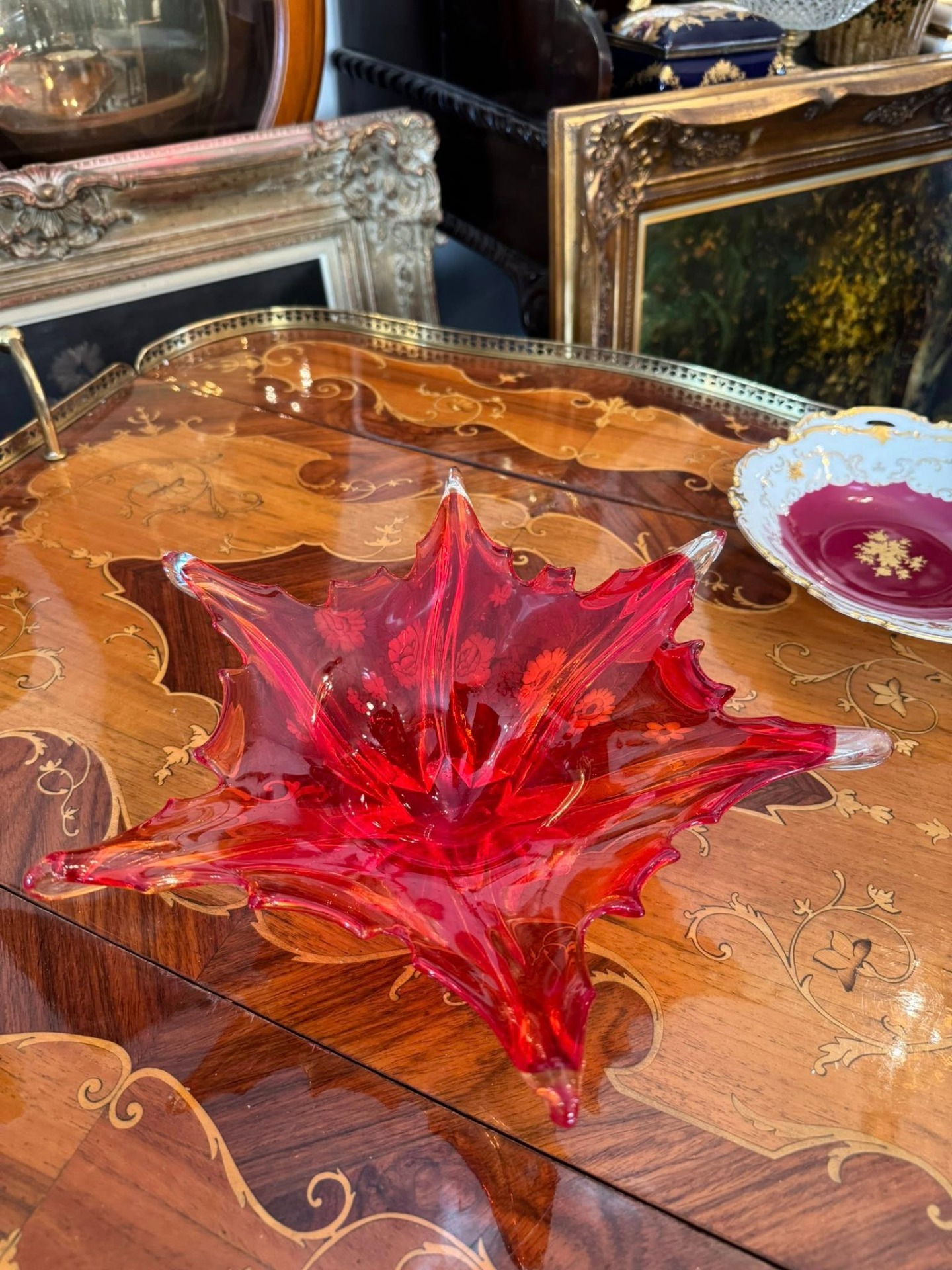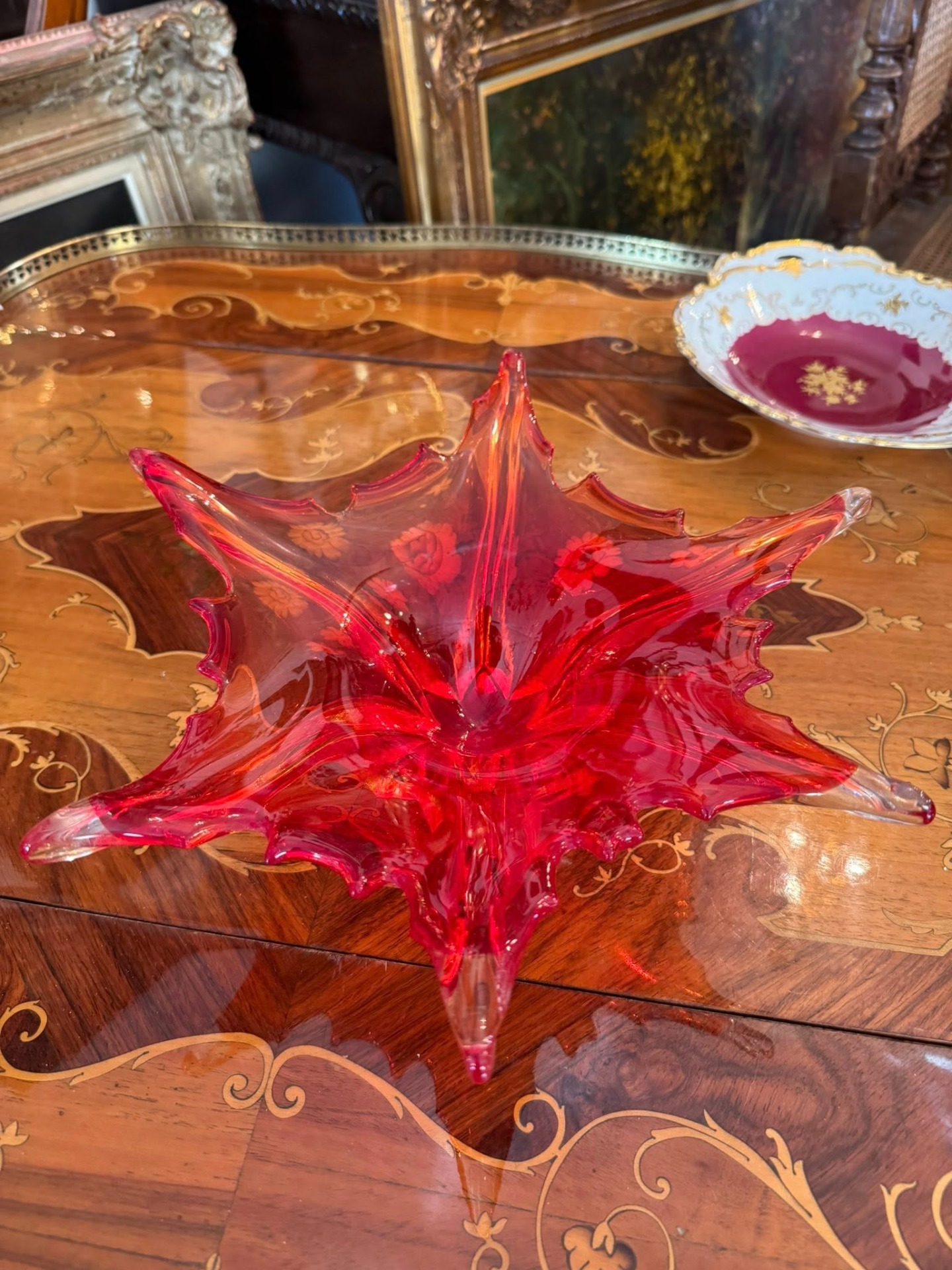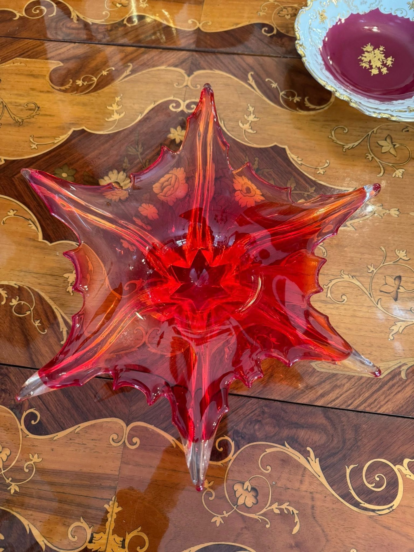 Fructieră decorativă spectaculoasă, realizată din sticlă în stil Murano, de culoare rubinie. Se încadrează în curentul Mid-Century Modern (anii '50 - '70)- Italia.