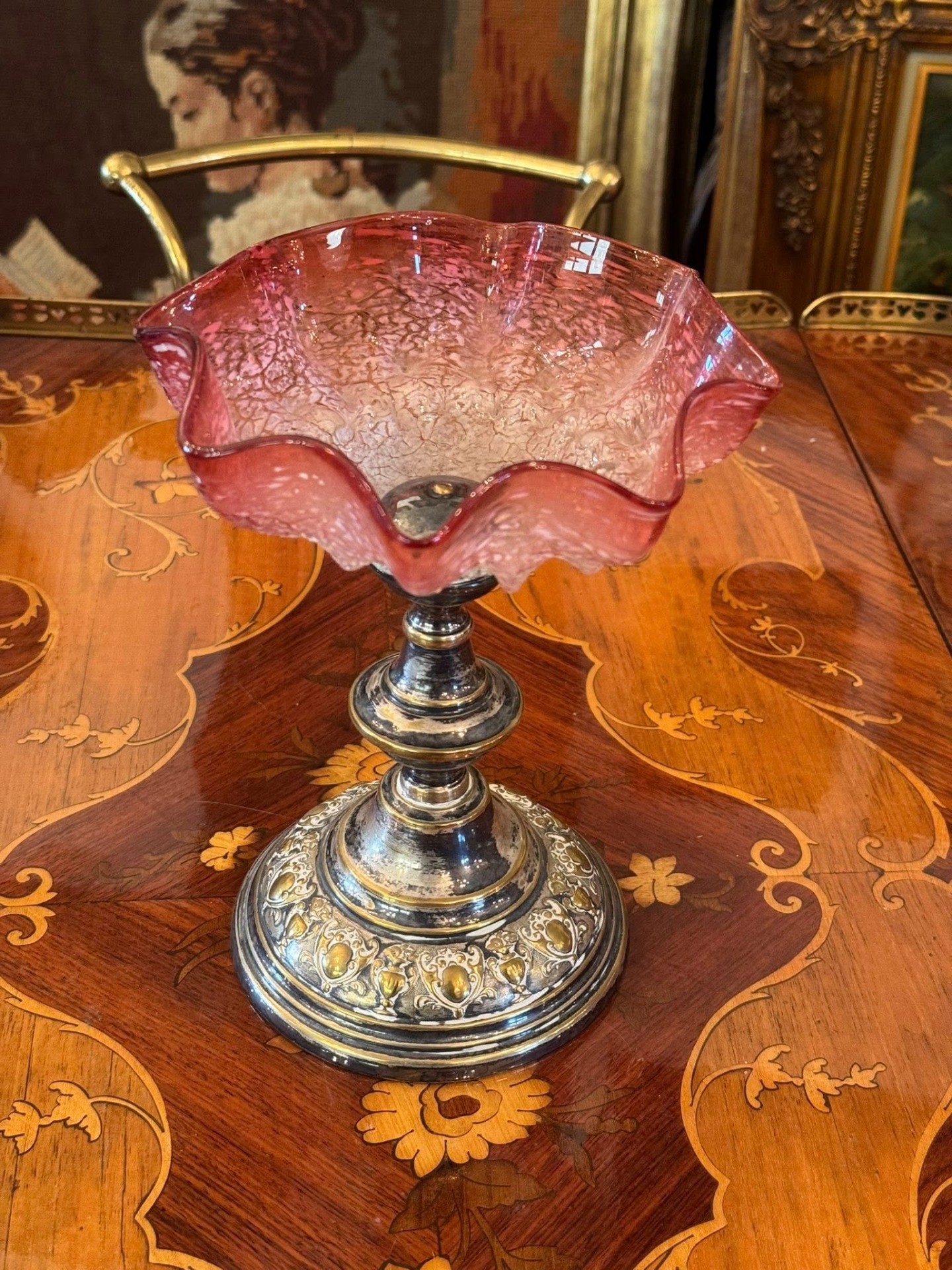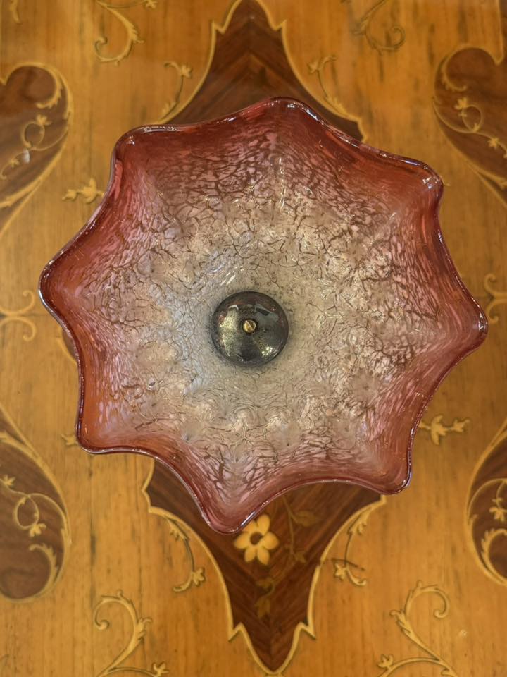 Fructieră delicată Art Nouveau cu cupă din sticlă „Craquelé”. Marginile sunt ondulate (festonate), amintind de forma unei flori deschise, iar culoarea trece treptat de la un roz-trandafir intens pe margini către un roz pal.