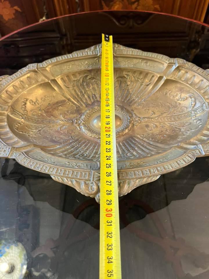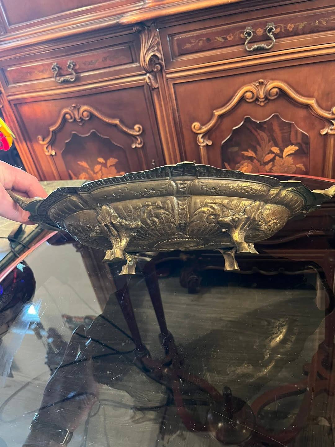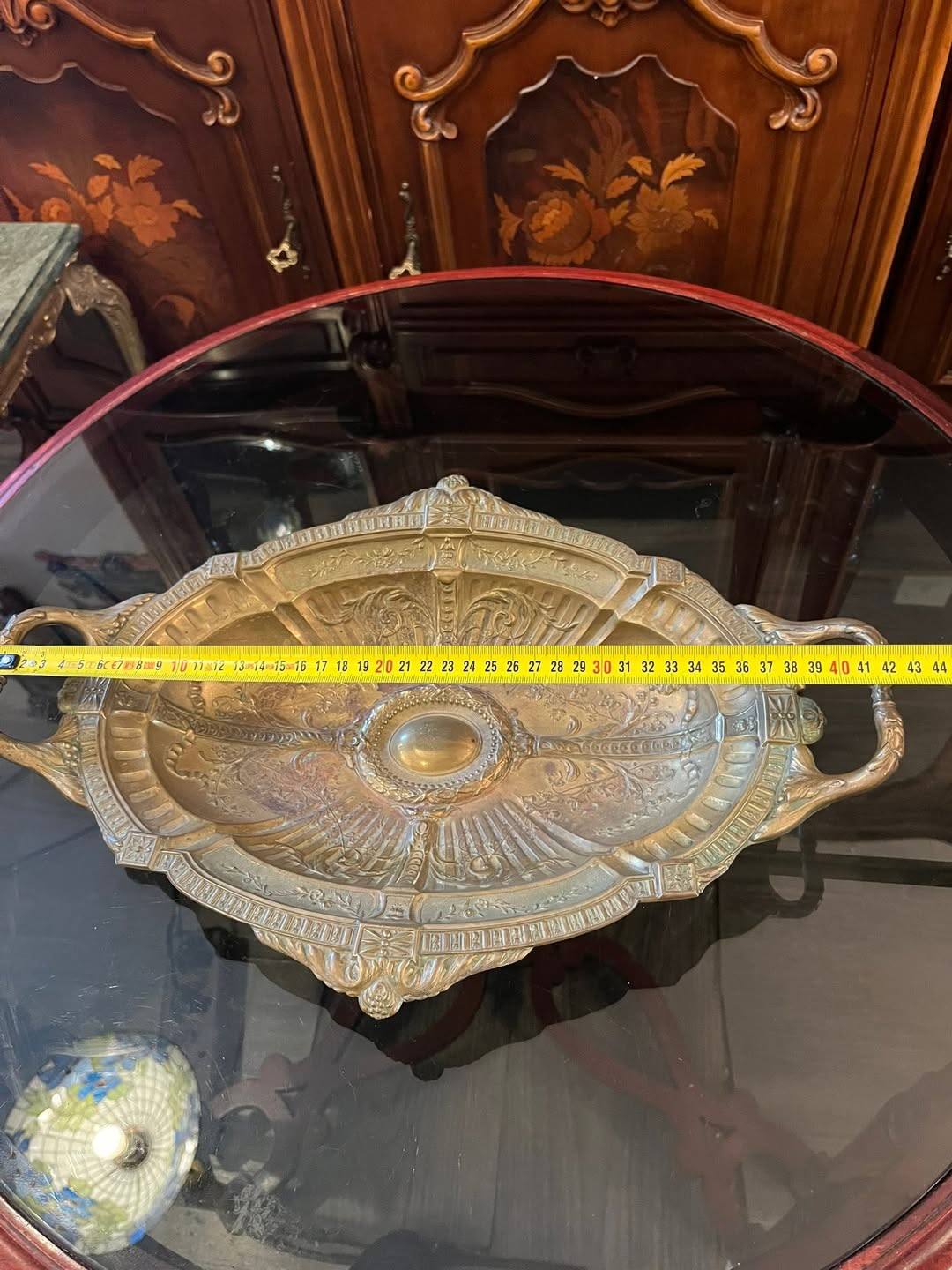 Stil baroc / rococo. Piesa este lucrată în relief, cu detalii florale și geometrice, având două mânere laterale și picioare decorative, ceea ce îi oferă stabilitate și un aspect aristocratic.