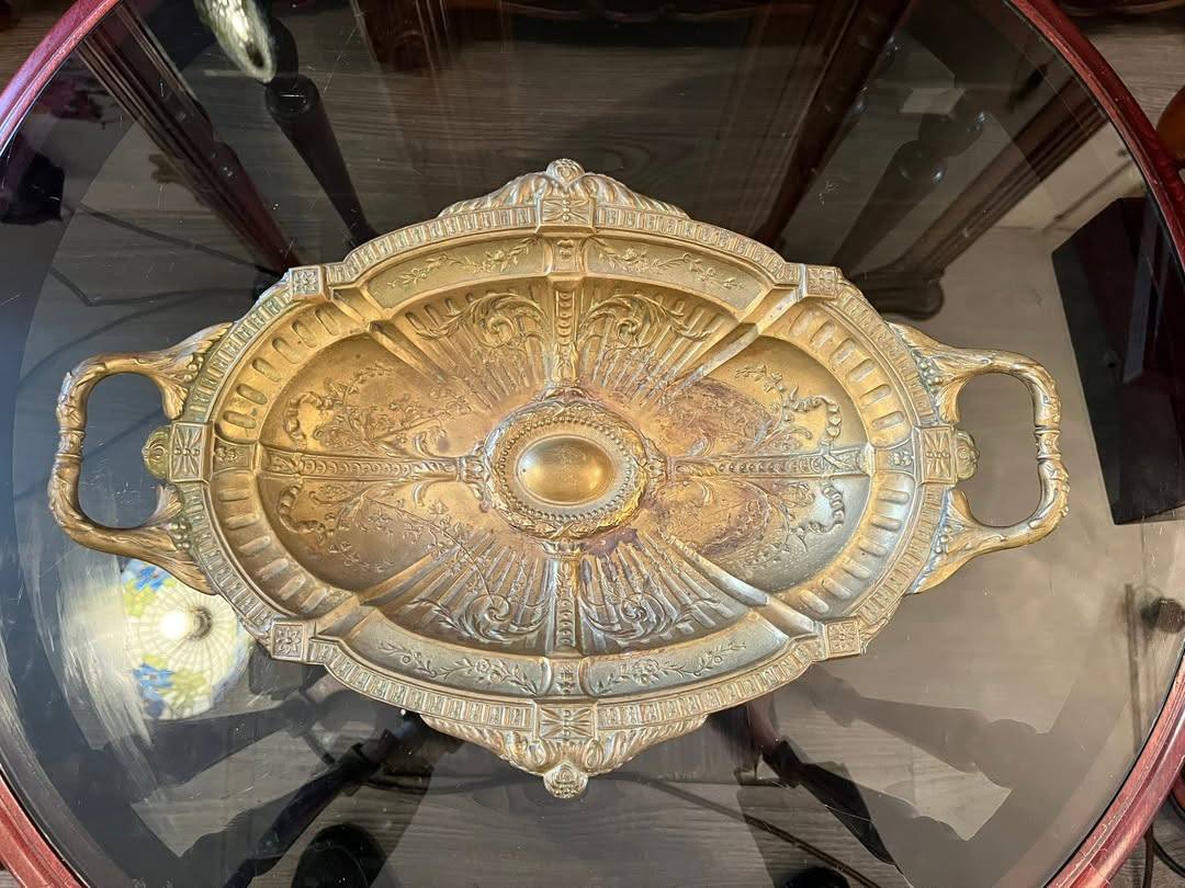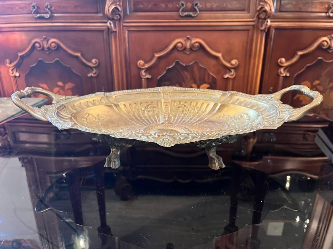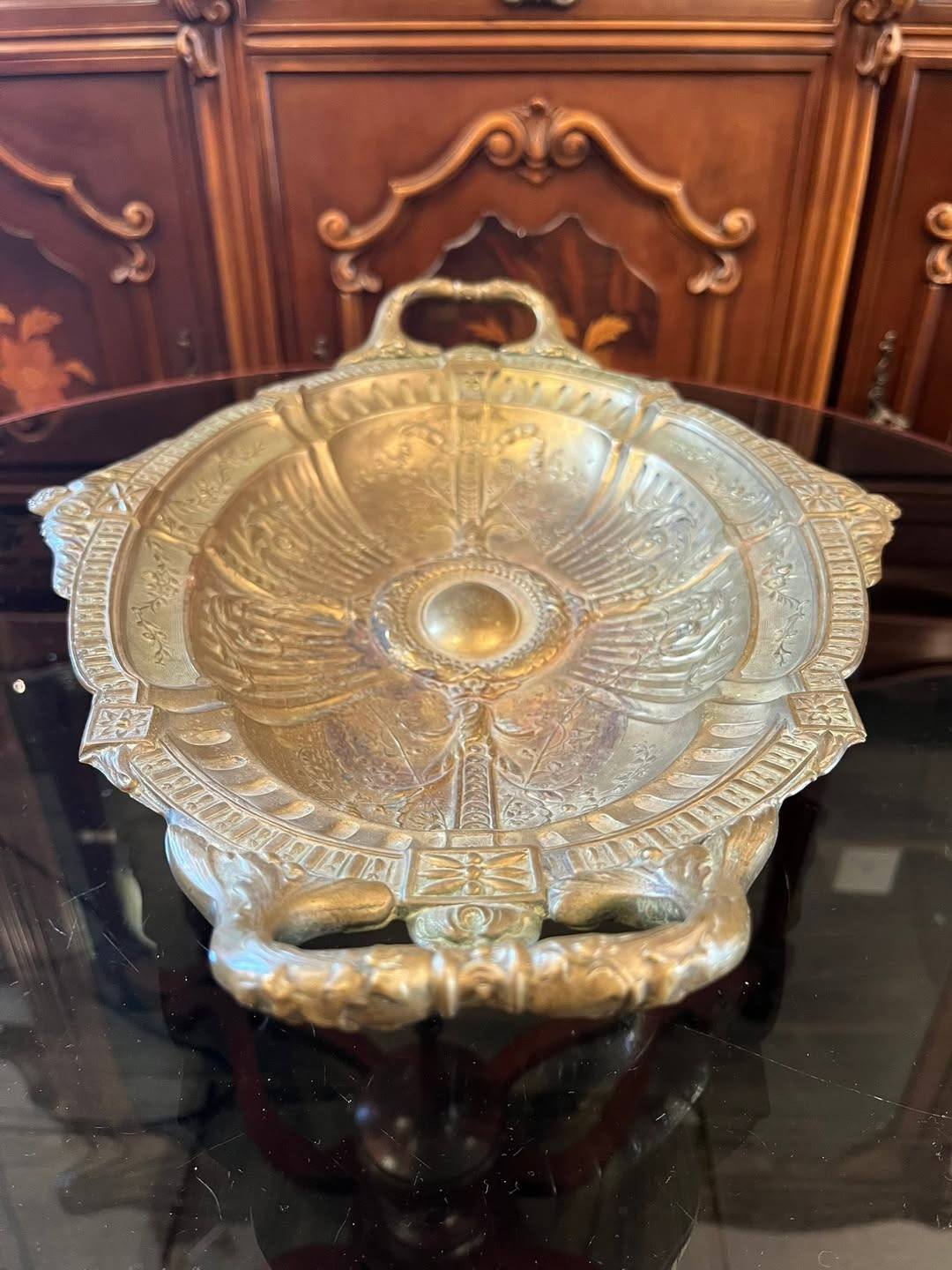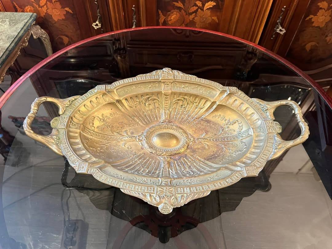Stil baroc / rococo. Piesa este lucrată în relief, cu detalii florale și geometrice, având două mânere laterale și picioare decorative, ceea ce îi oferă stabilitate și un aspect aristocratic.