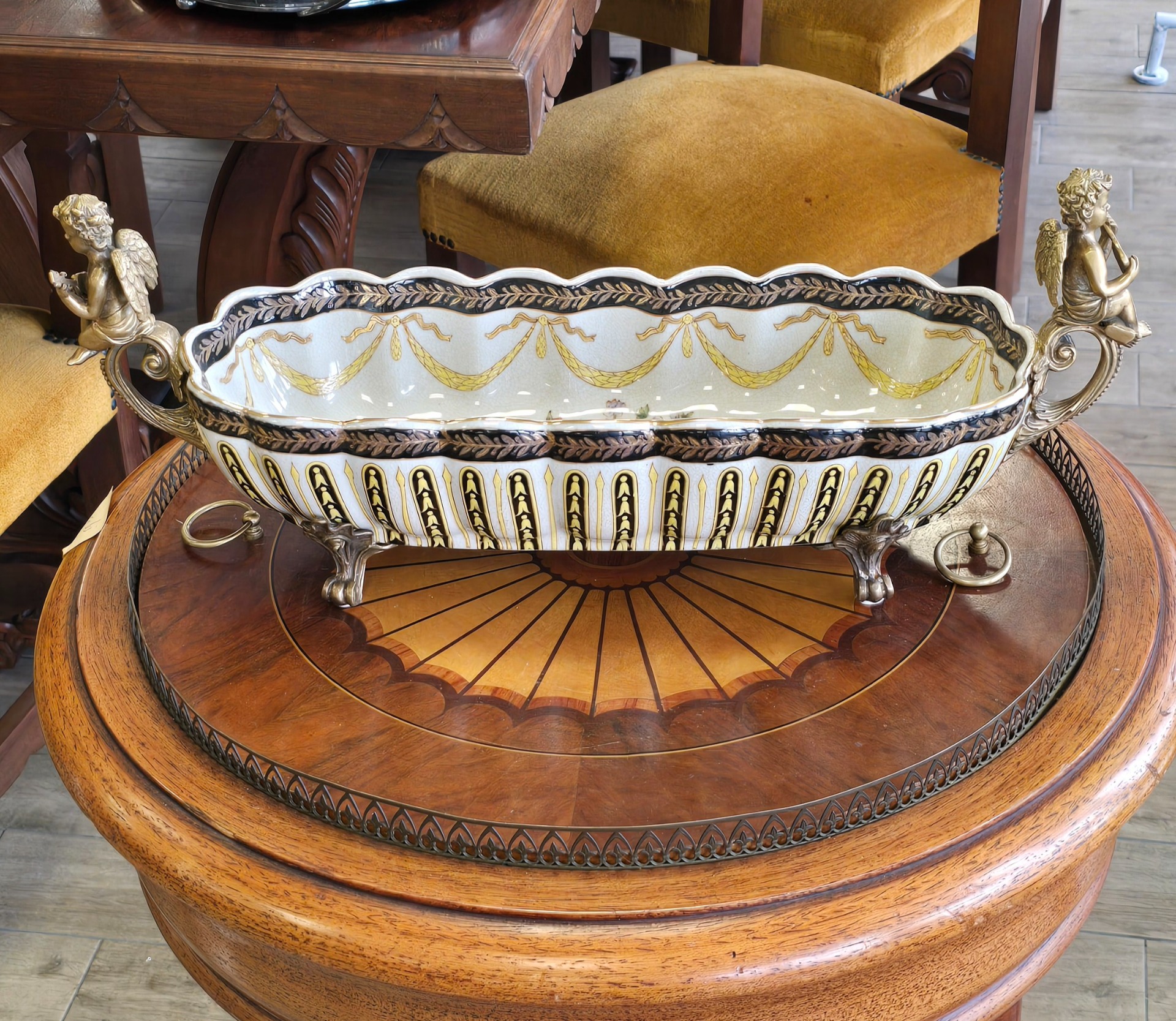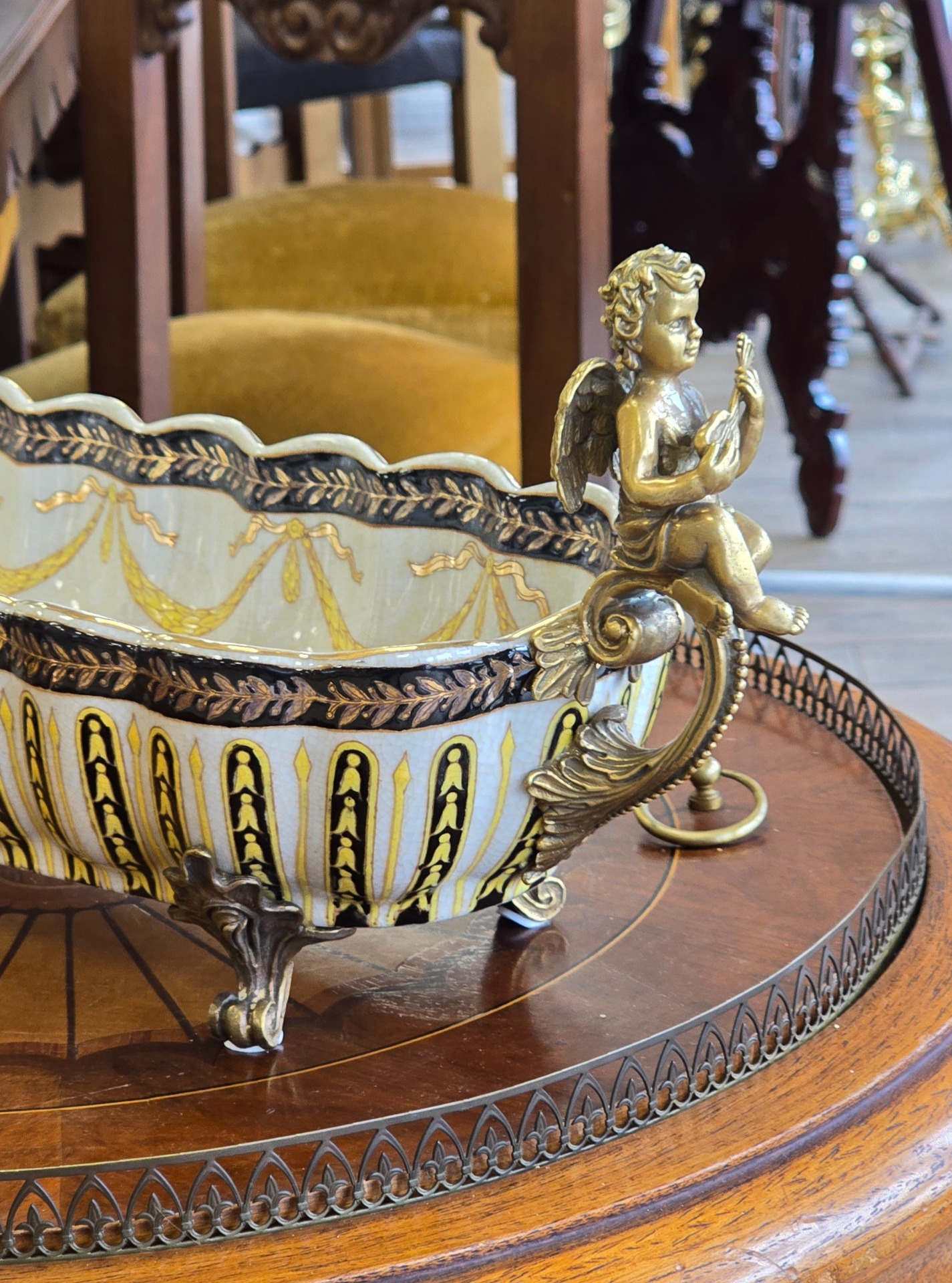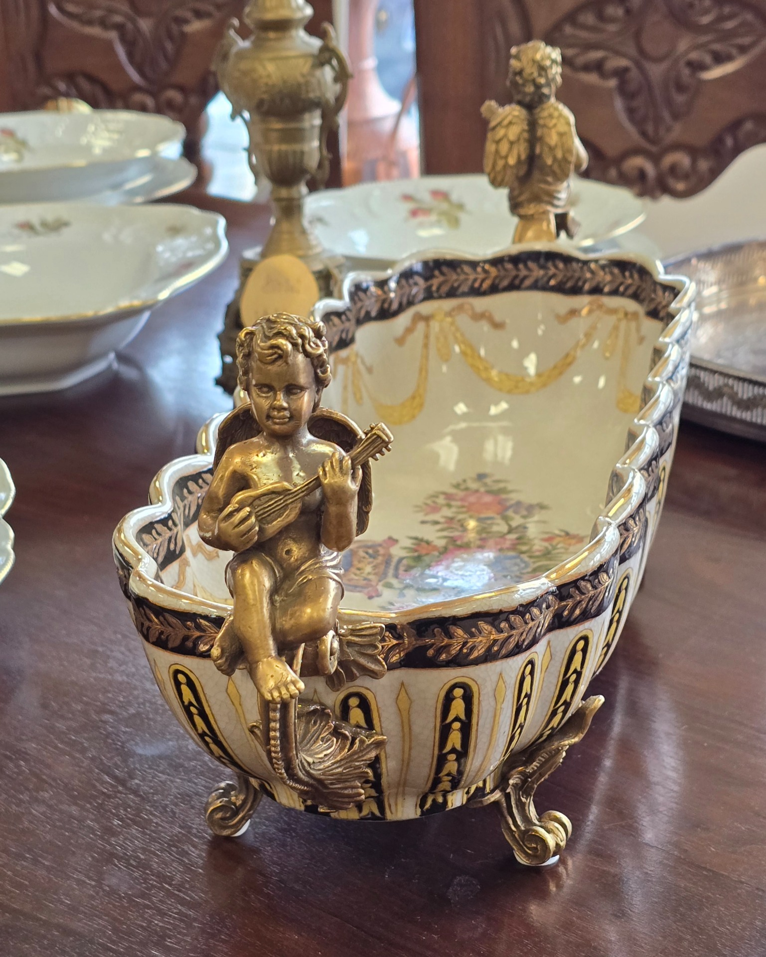 Fructieră deosebită din porțelan cu ornamente din bronz, decorată cu amorași și pictată în motiv floral.