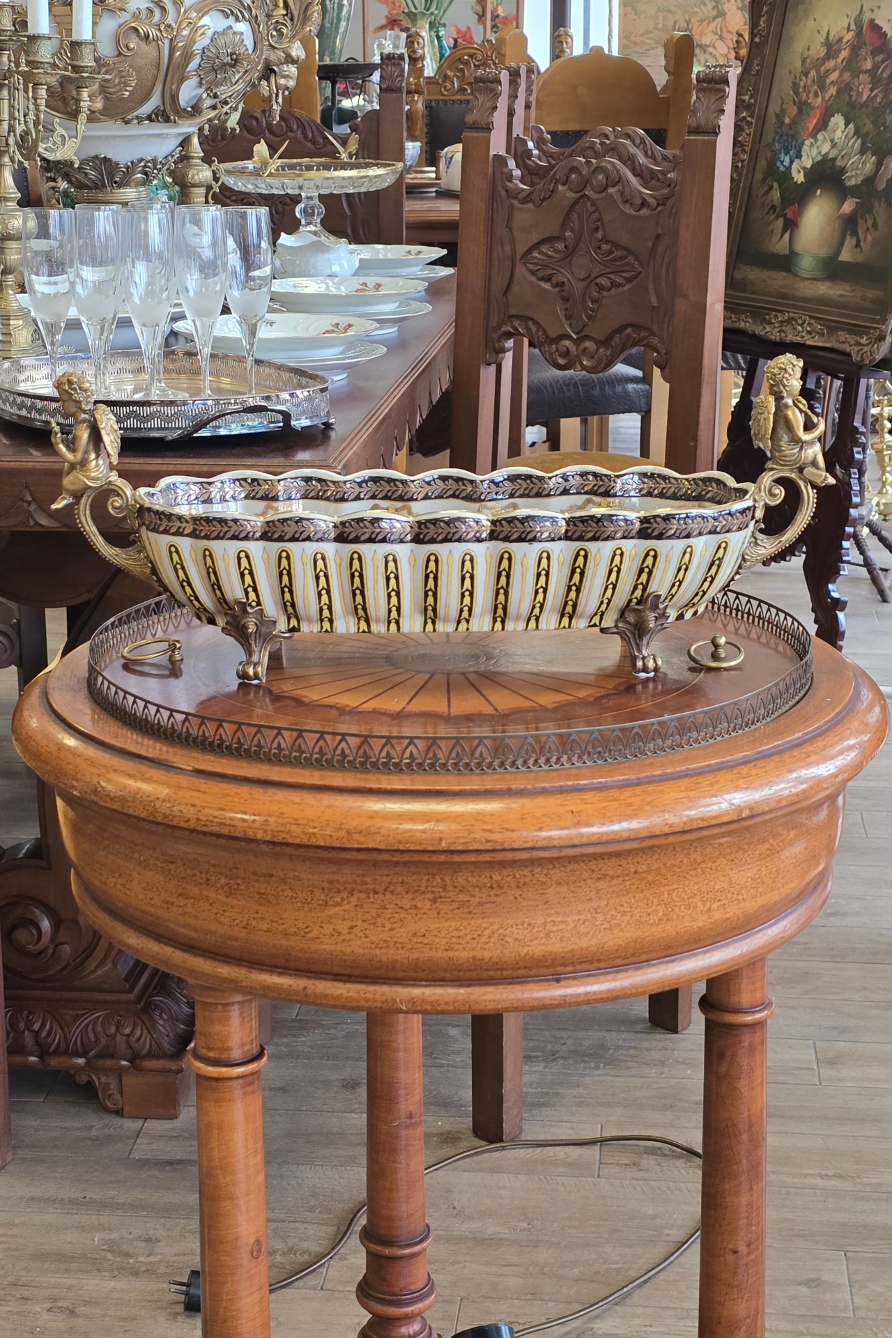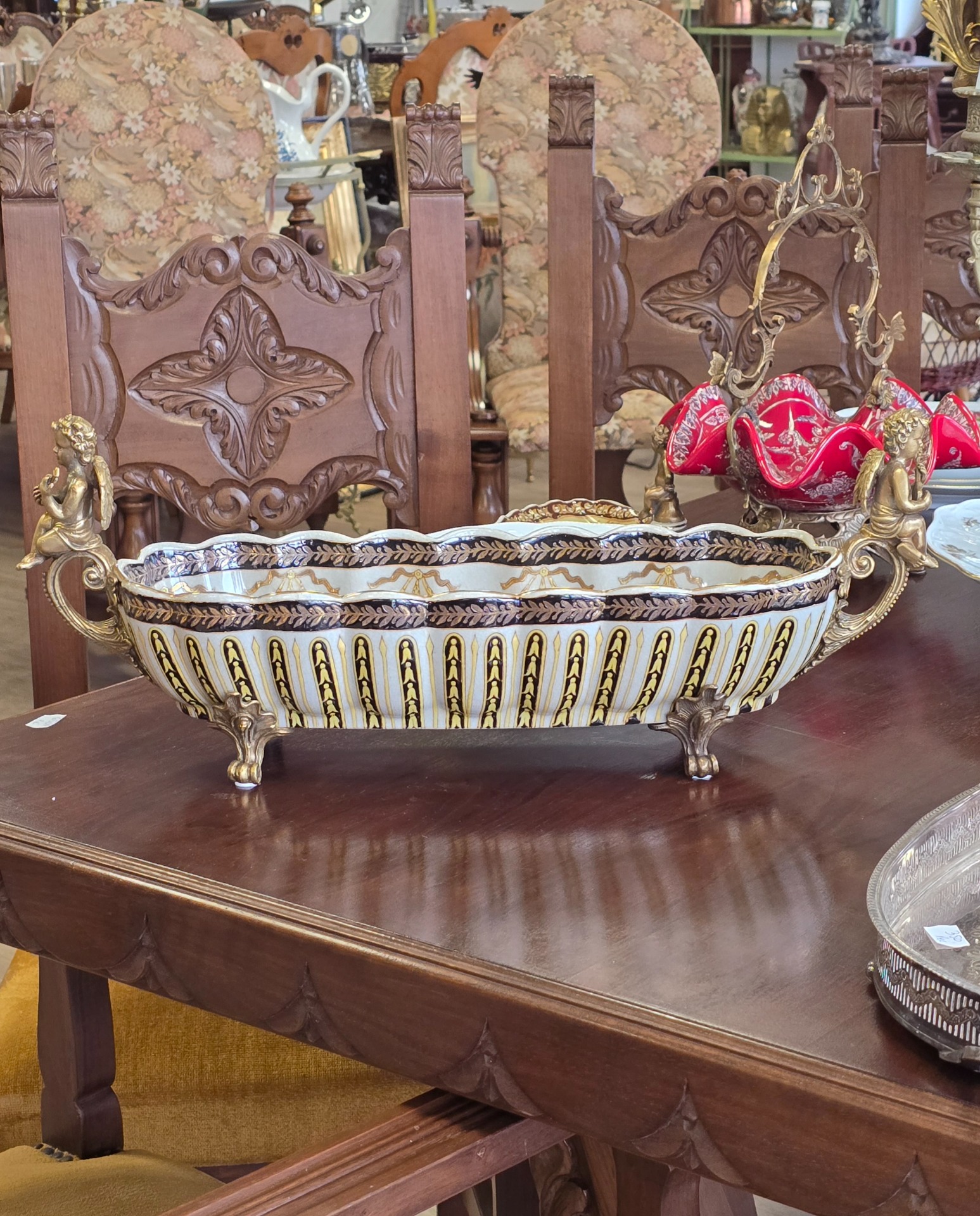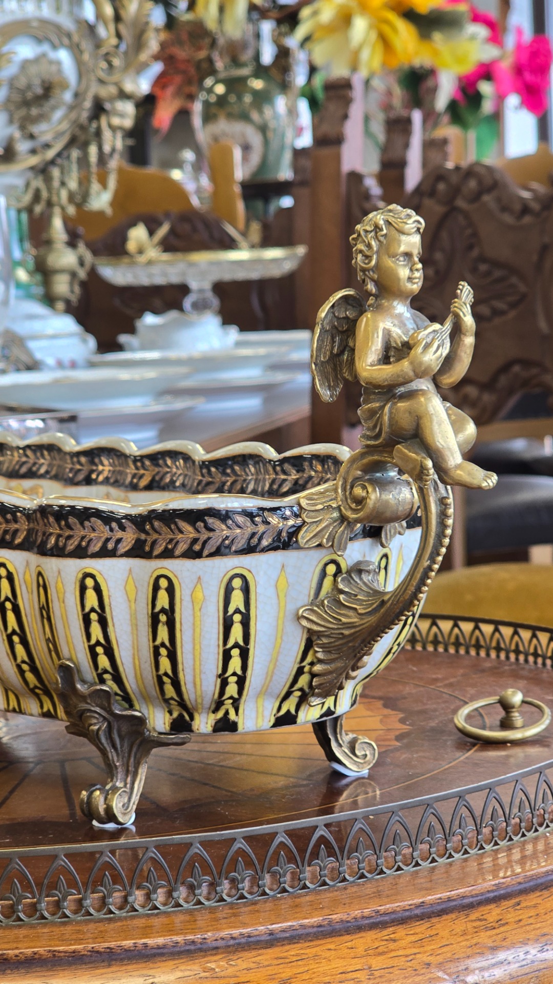 Fructieră deosebită din porțelan cu ornamente din bronz, decorată cu amorași și pictată în motiv floral.