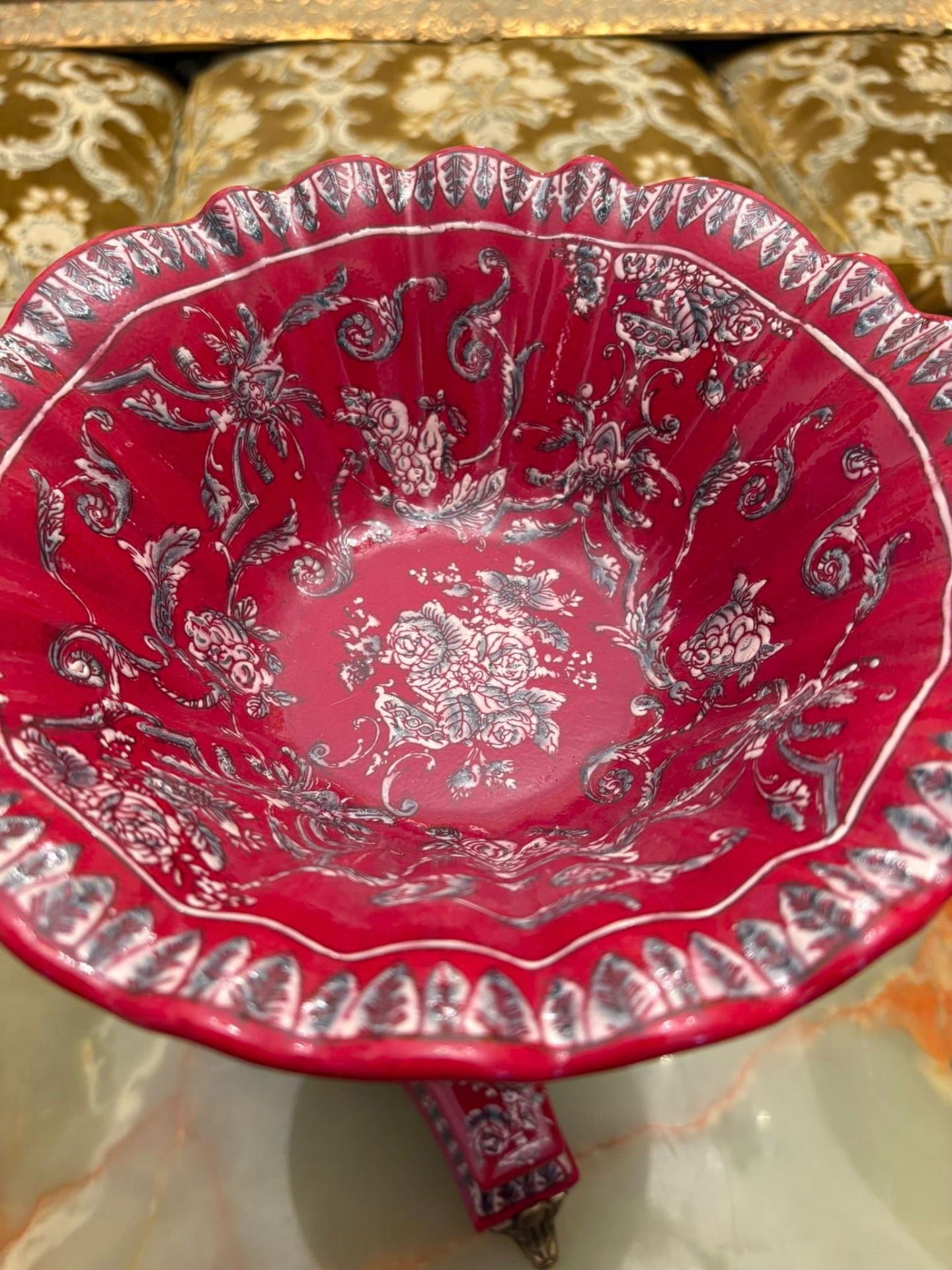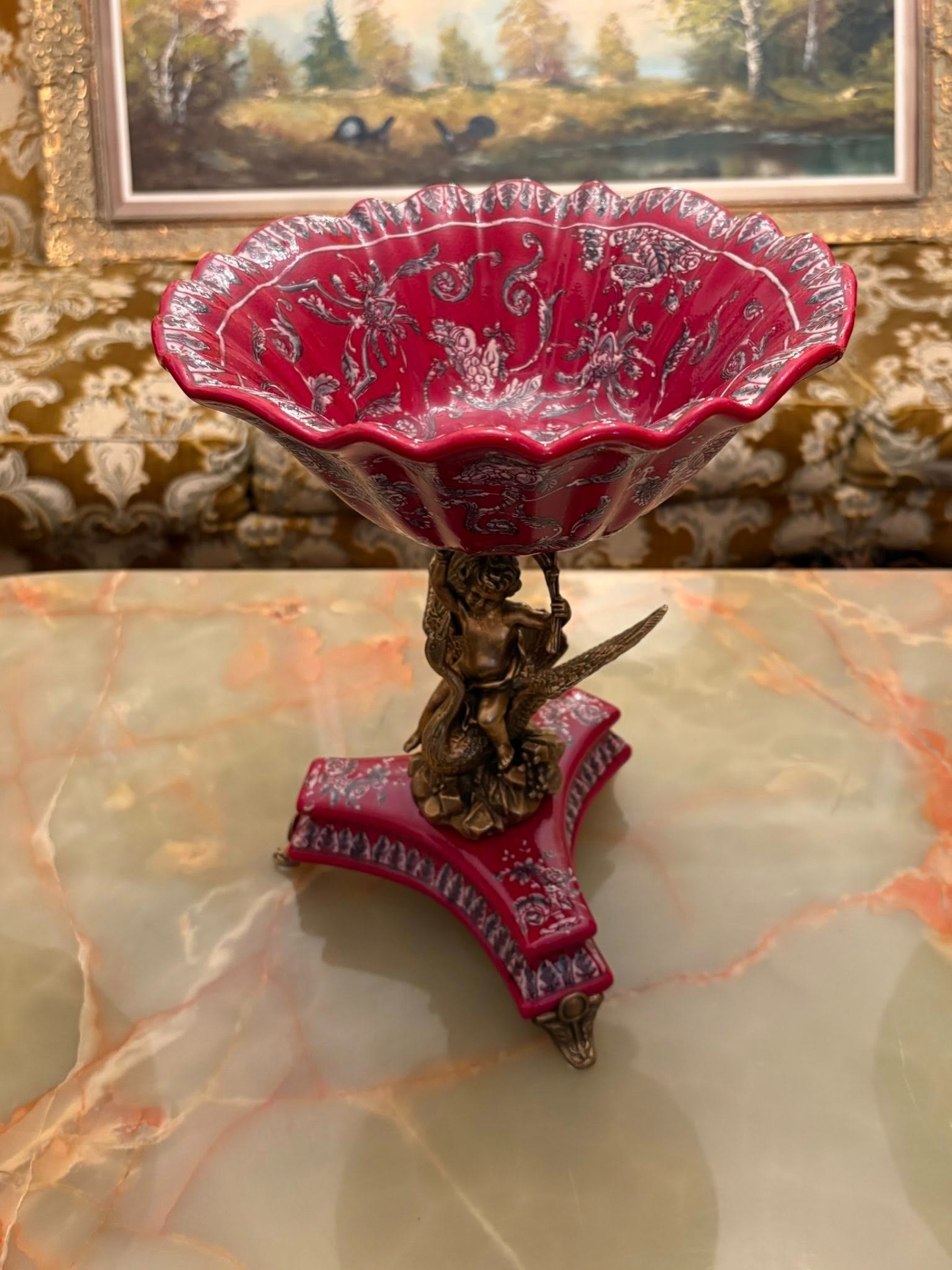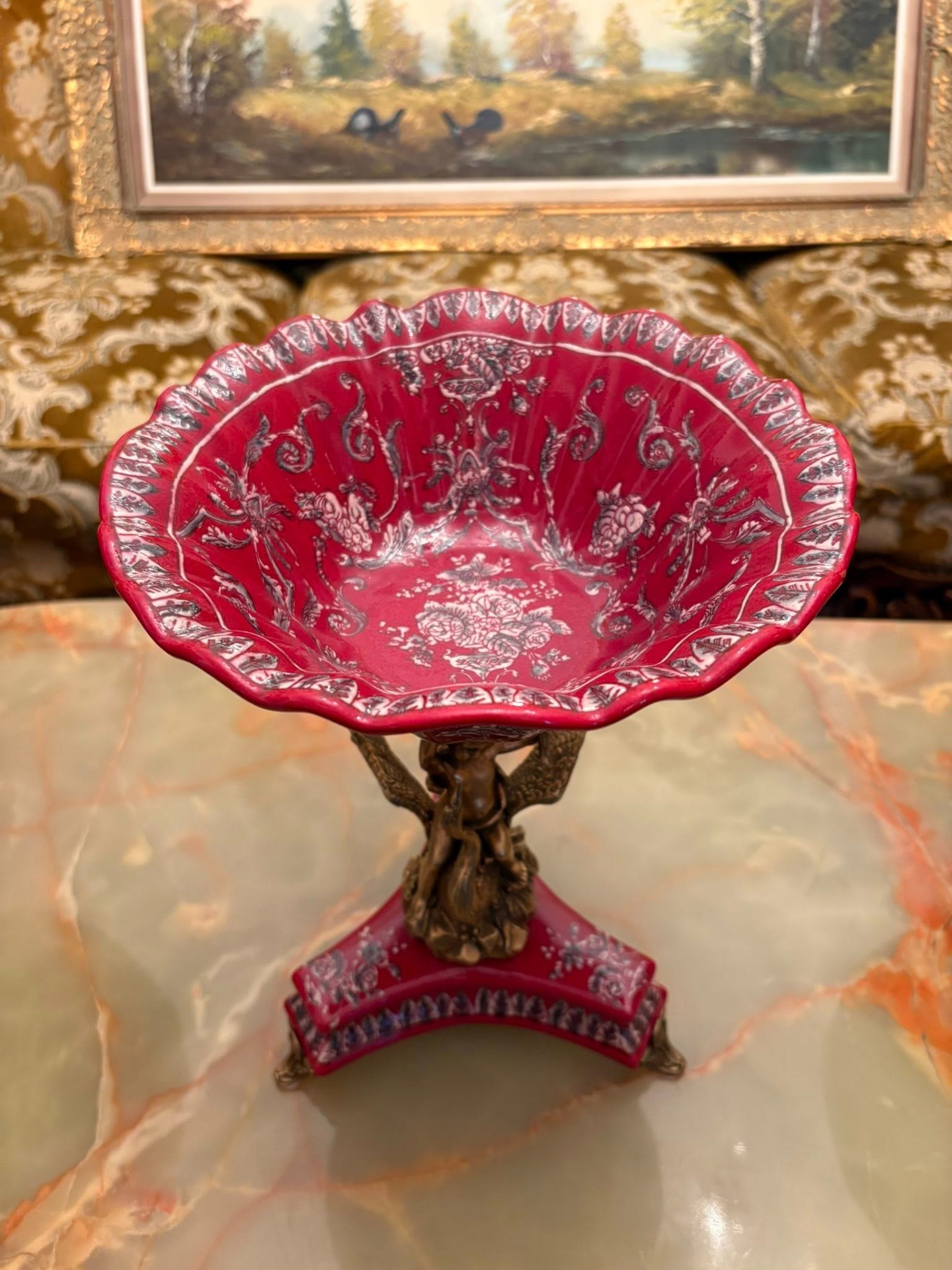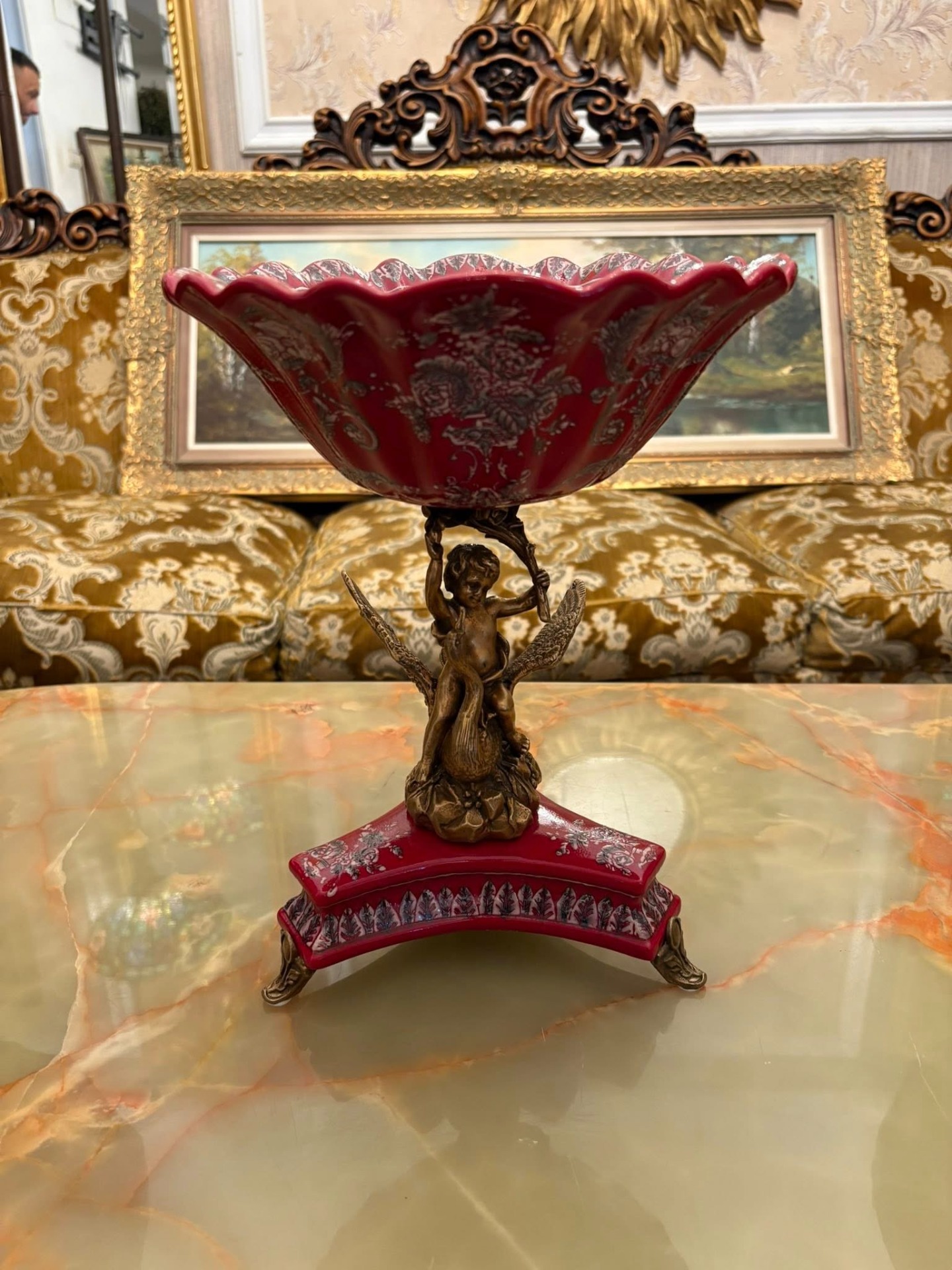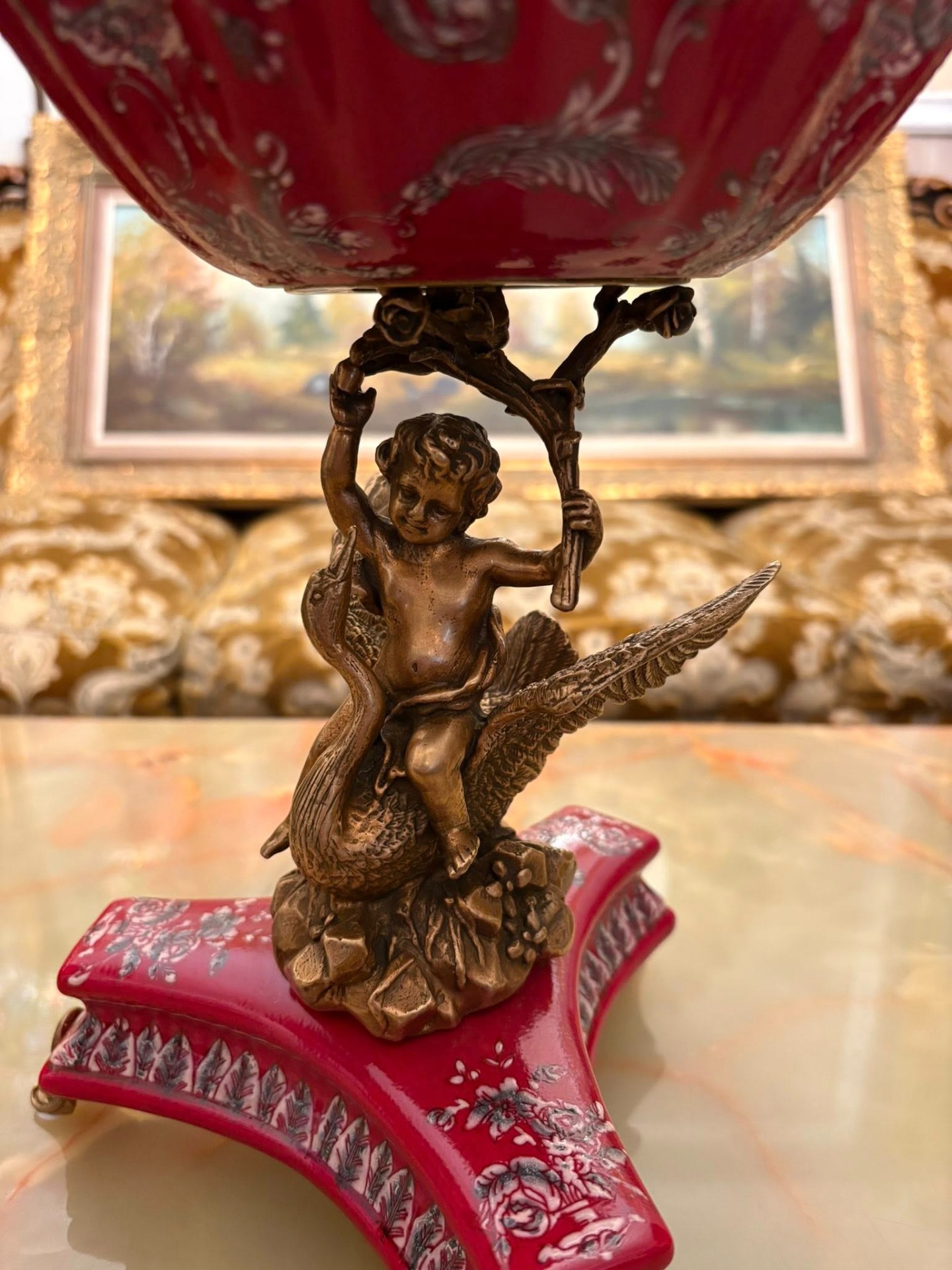 Fructieră din porțelan și bronz, cu detalii ornamentale și suport din bronz fin lucrat cu îngeraș.
