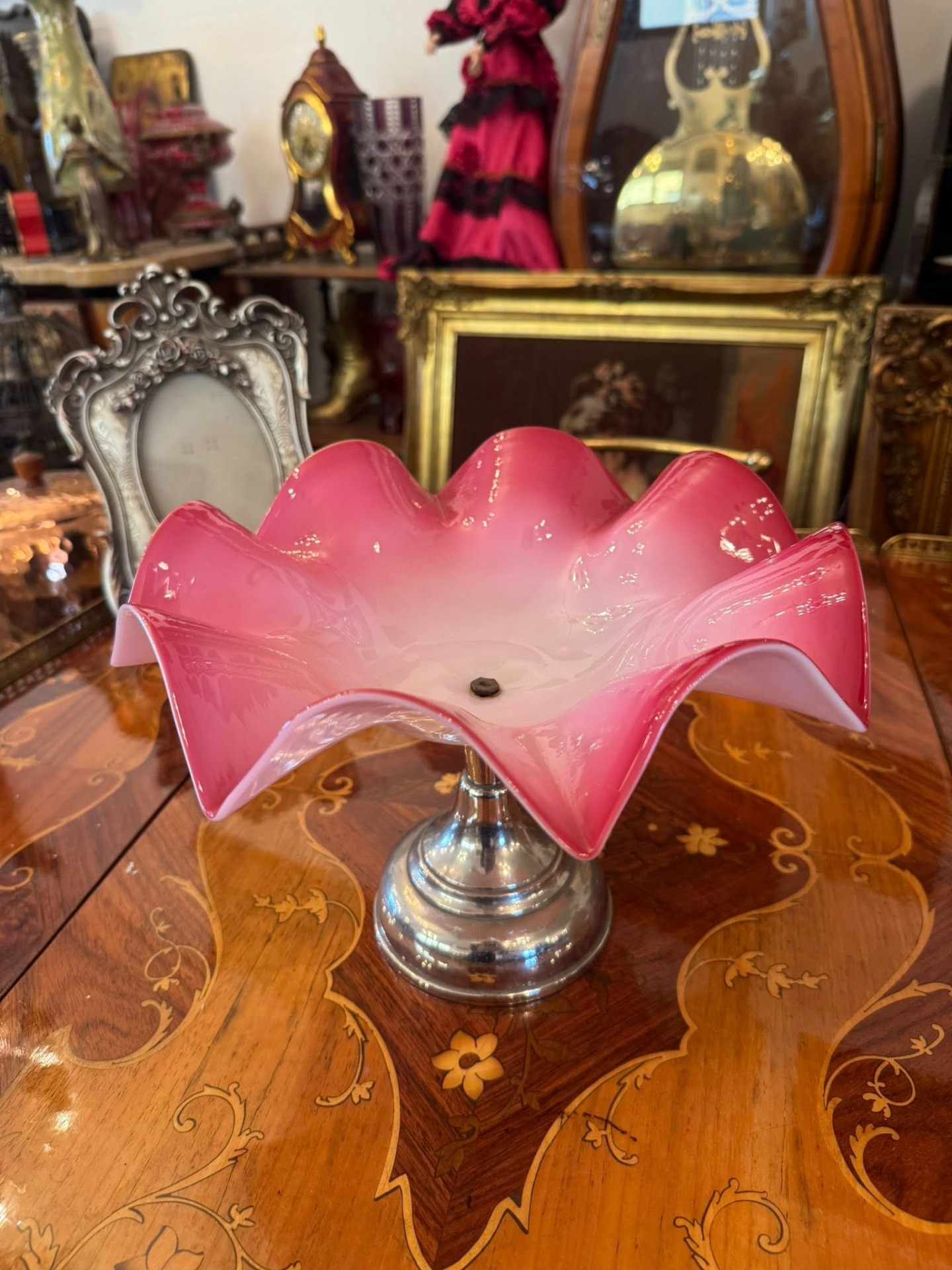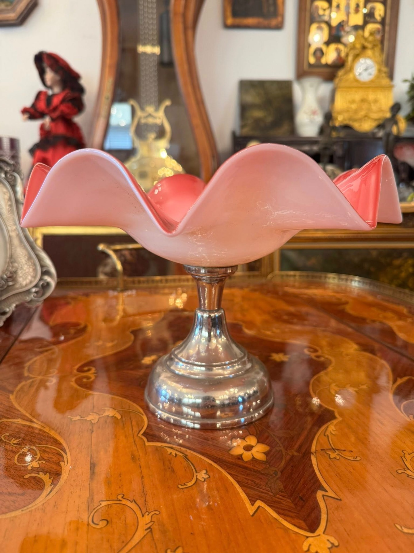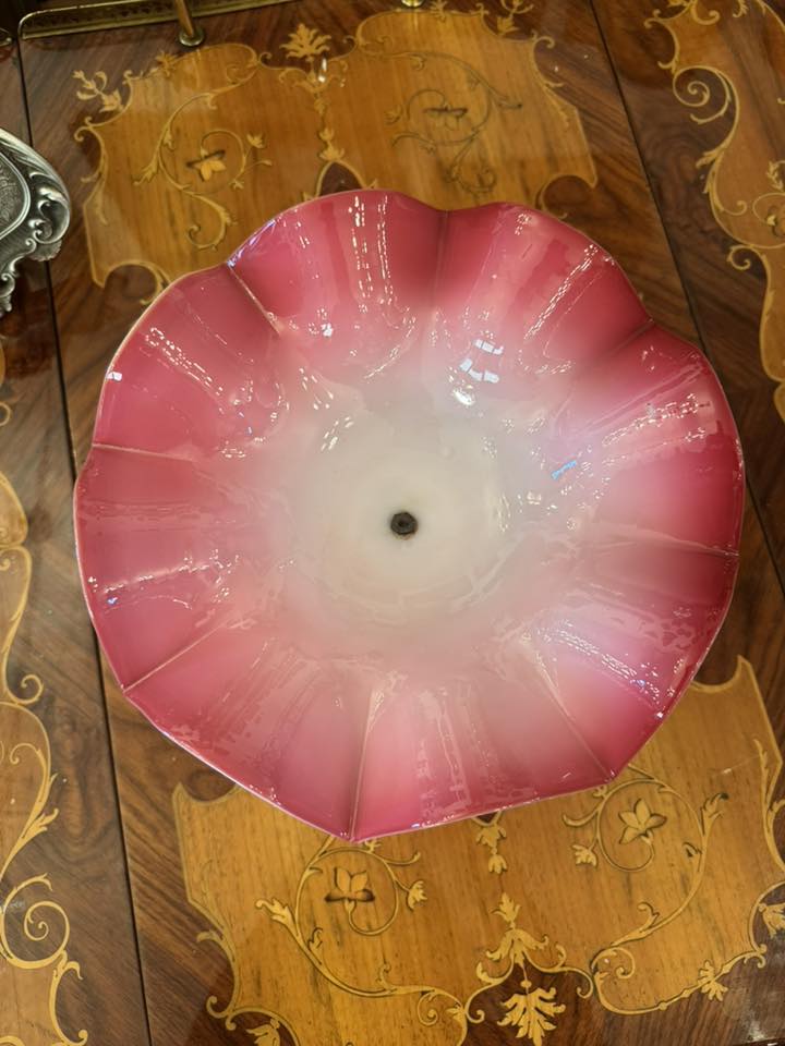 Fructieră elegantă cu margini ondulate și bază cromată, aparținând stilului Mid-Century. Culoarea pornește de la un alb-rozaliu delicat în centru și se intensifică spre un roz-coral vibrant pe margini. (cca 1930,Italia)