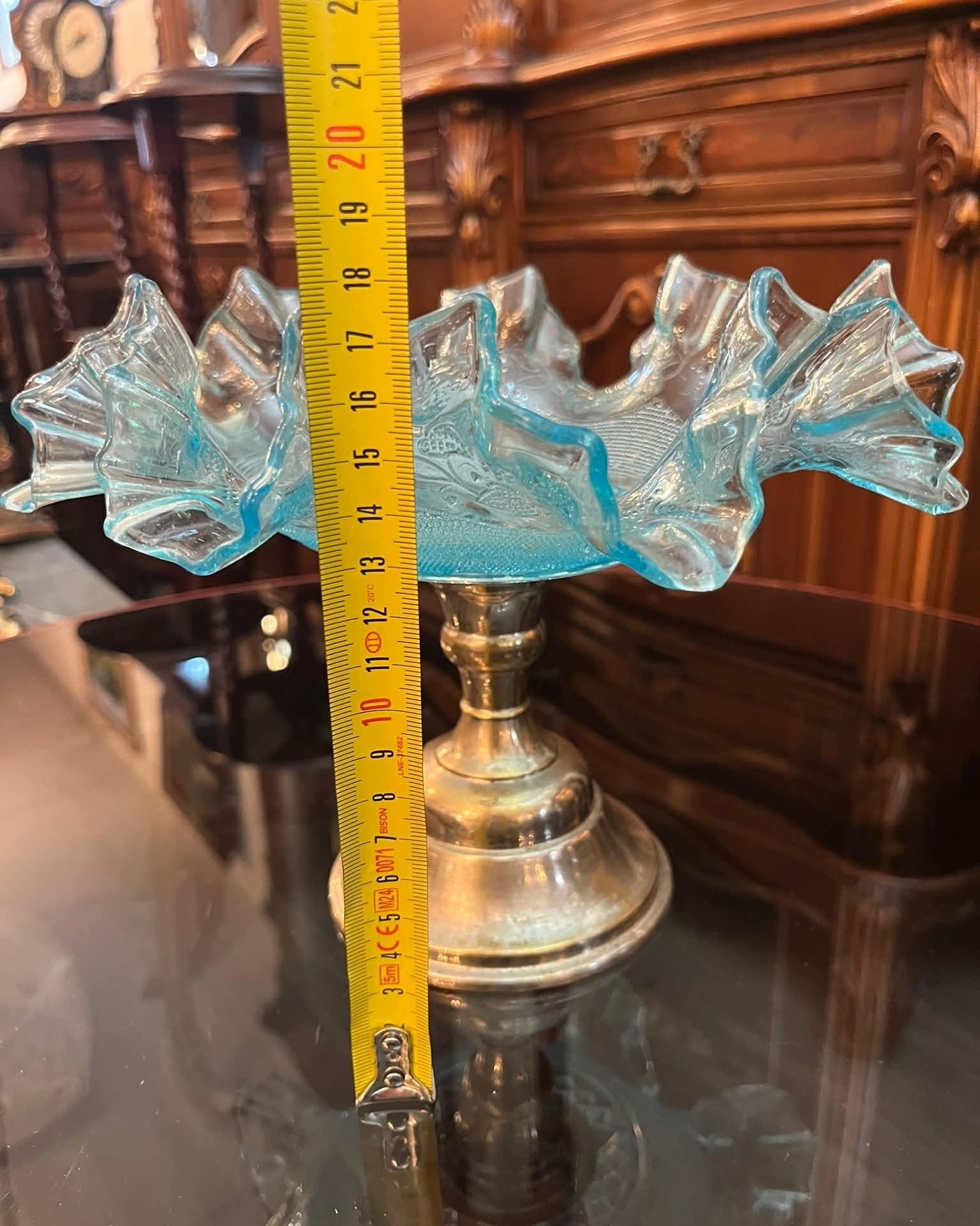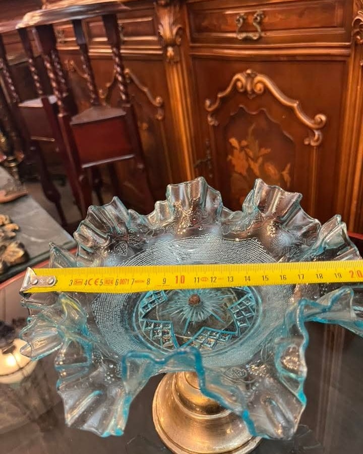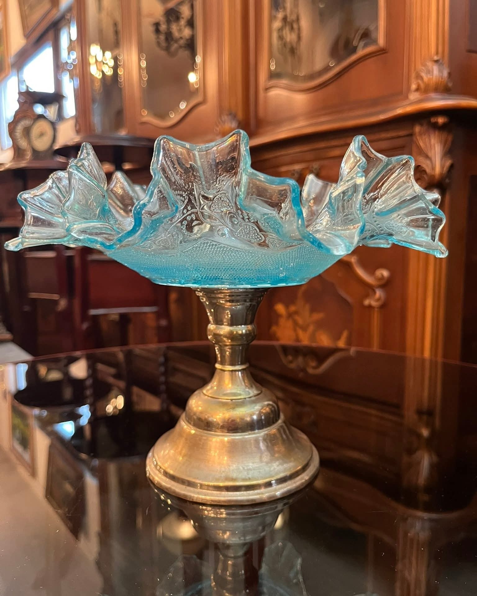 Fructieră elegantă, realizată din sticlă presată albastru-turcoaz, cu margini ondulate și model ornamental bogat, montată pe picior din alama argintata. Design