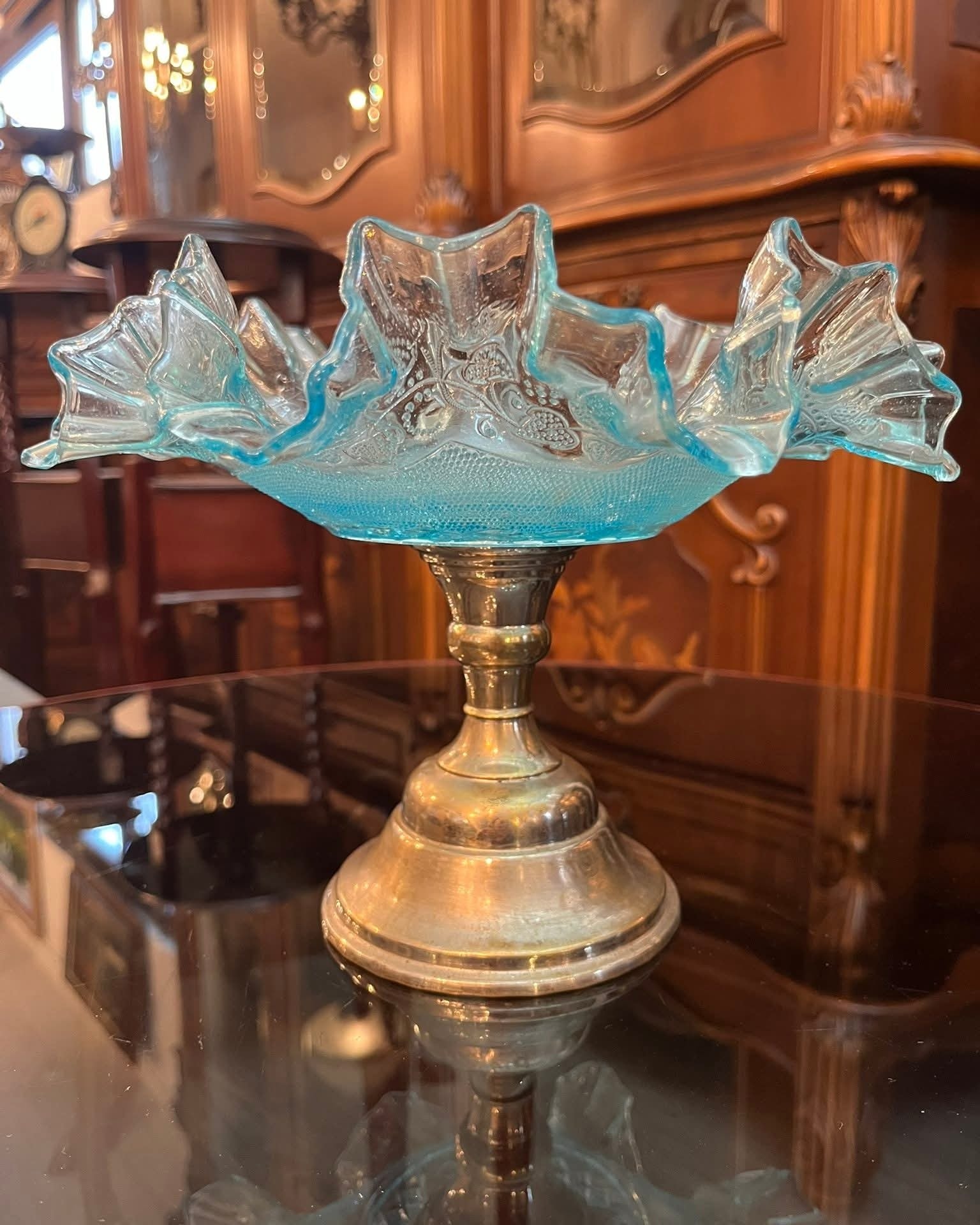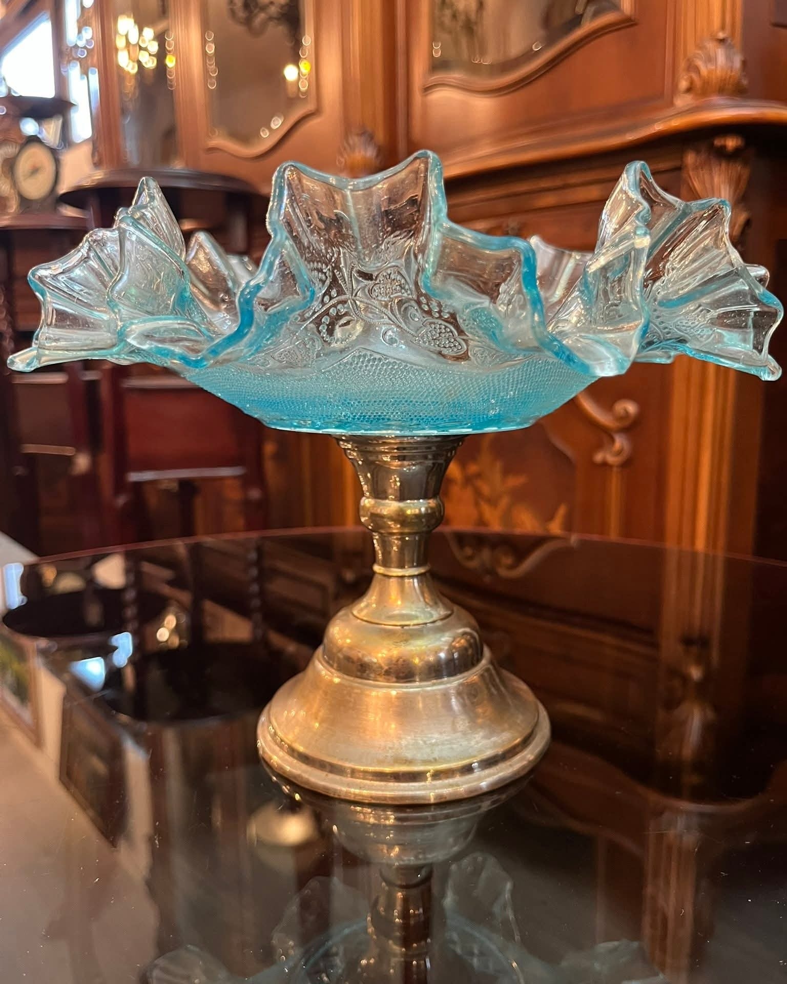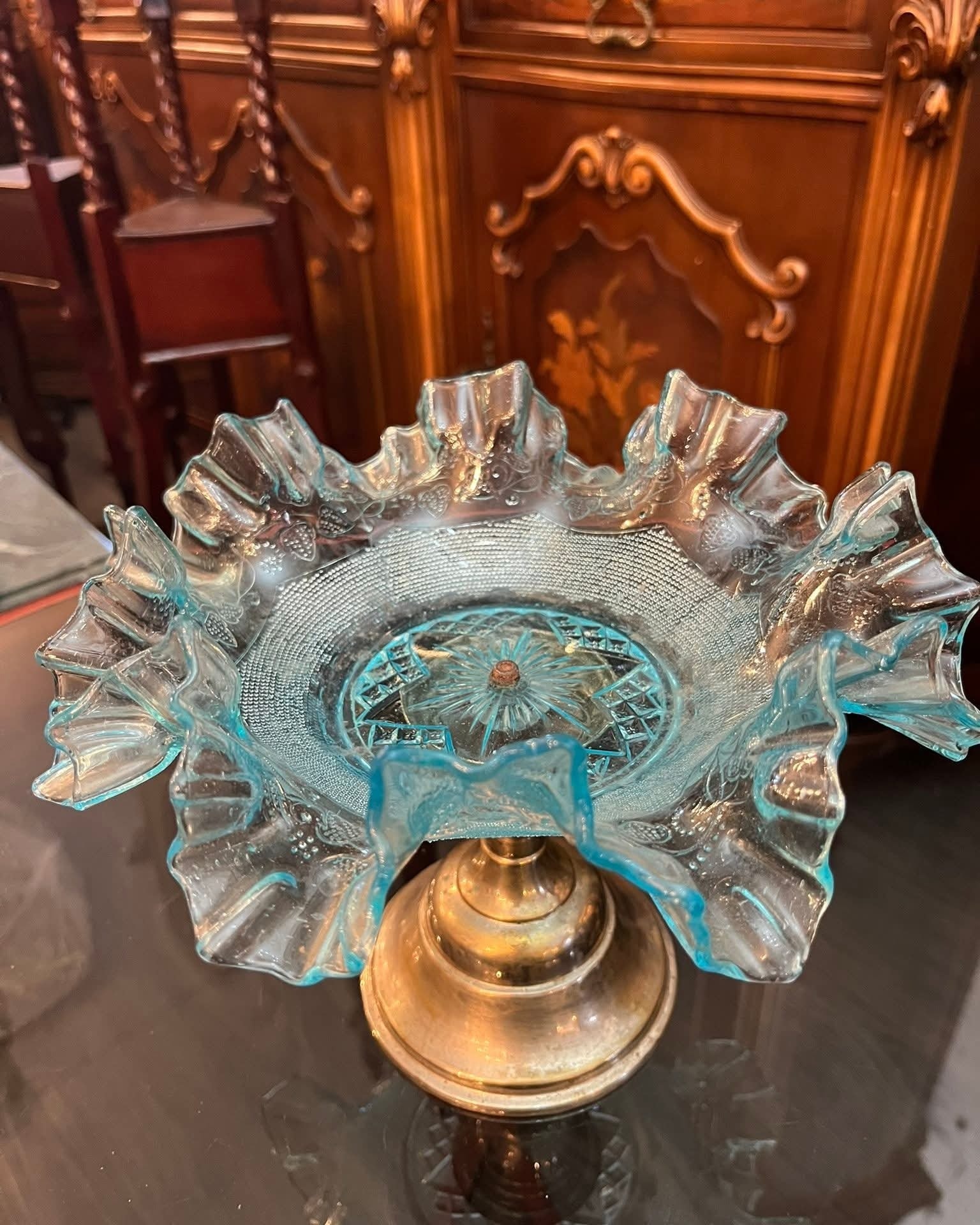 Fructieră elegantă, realizată din sticlă presată albastru-turcoaz, cu margini ondulate și model ornamental bogat, montată pe picior din alama argintata. Design