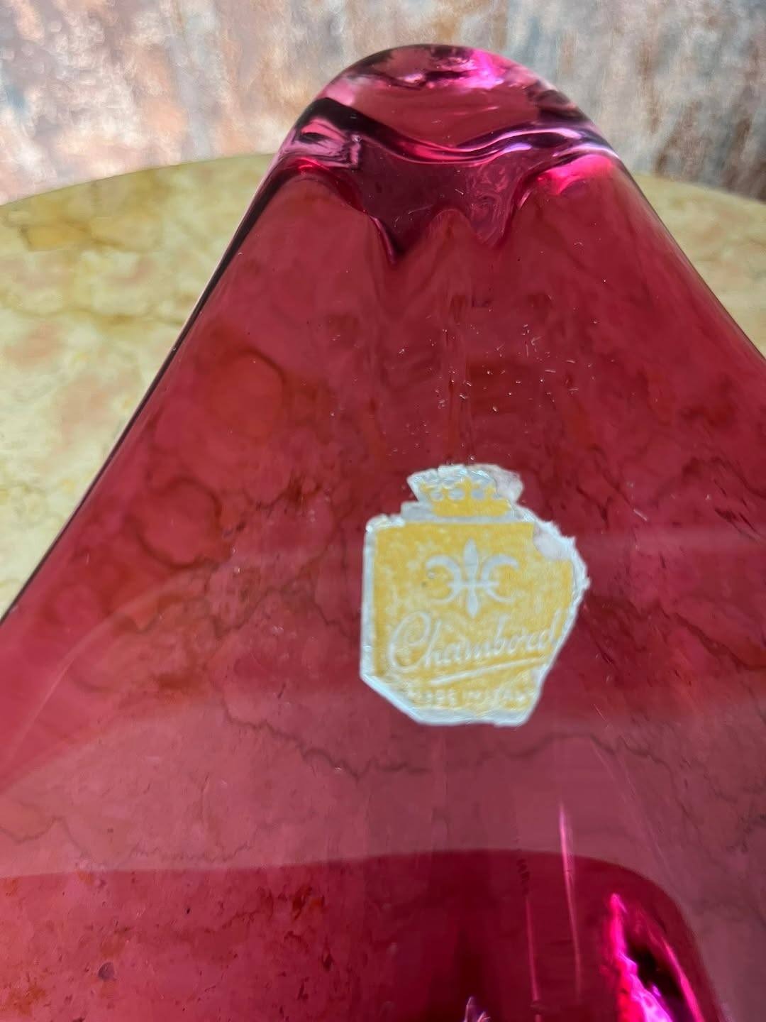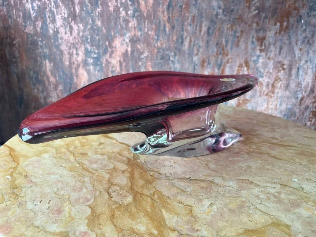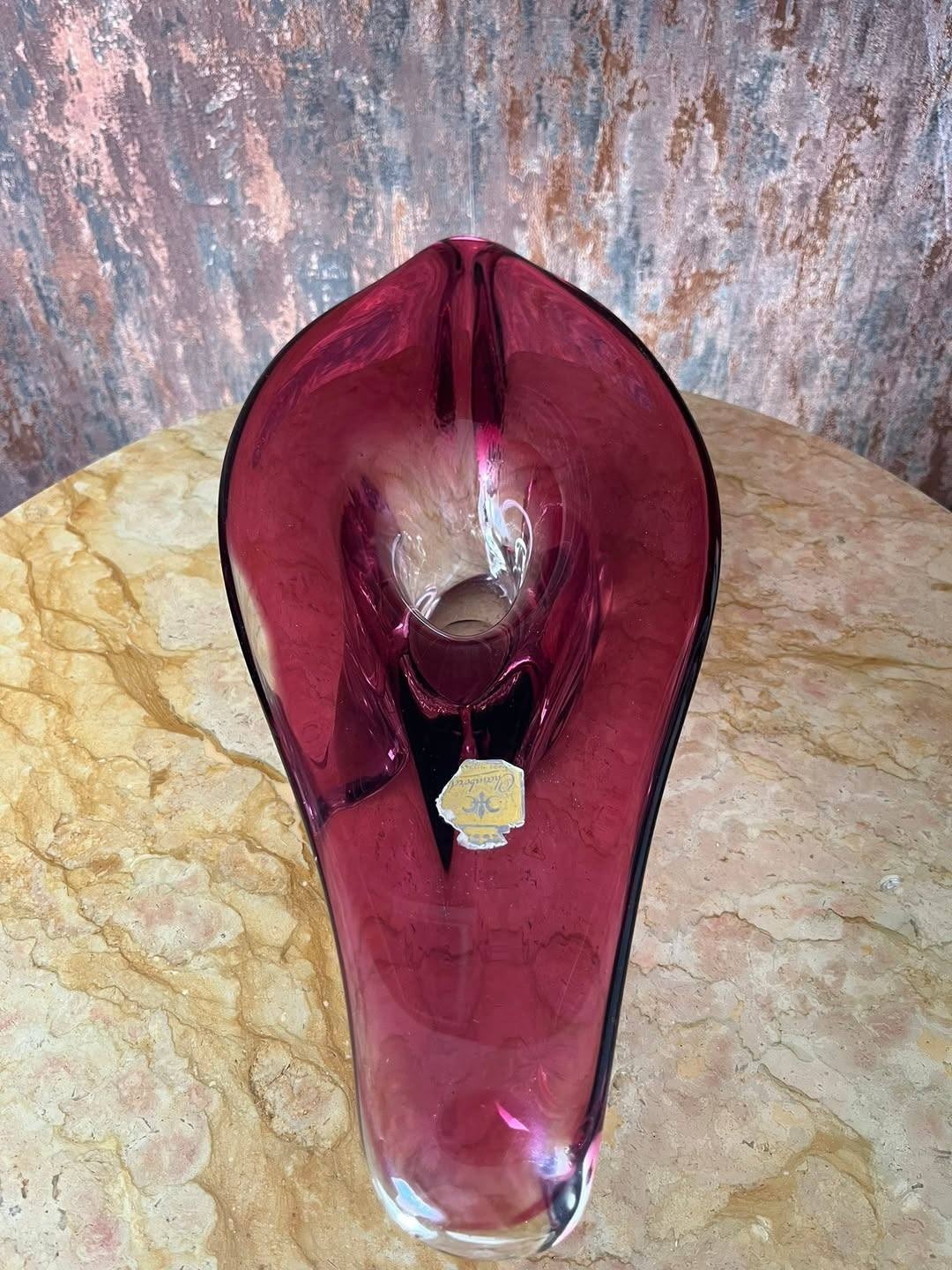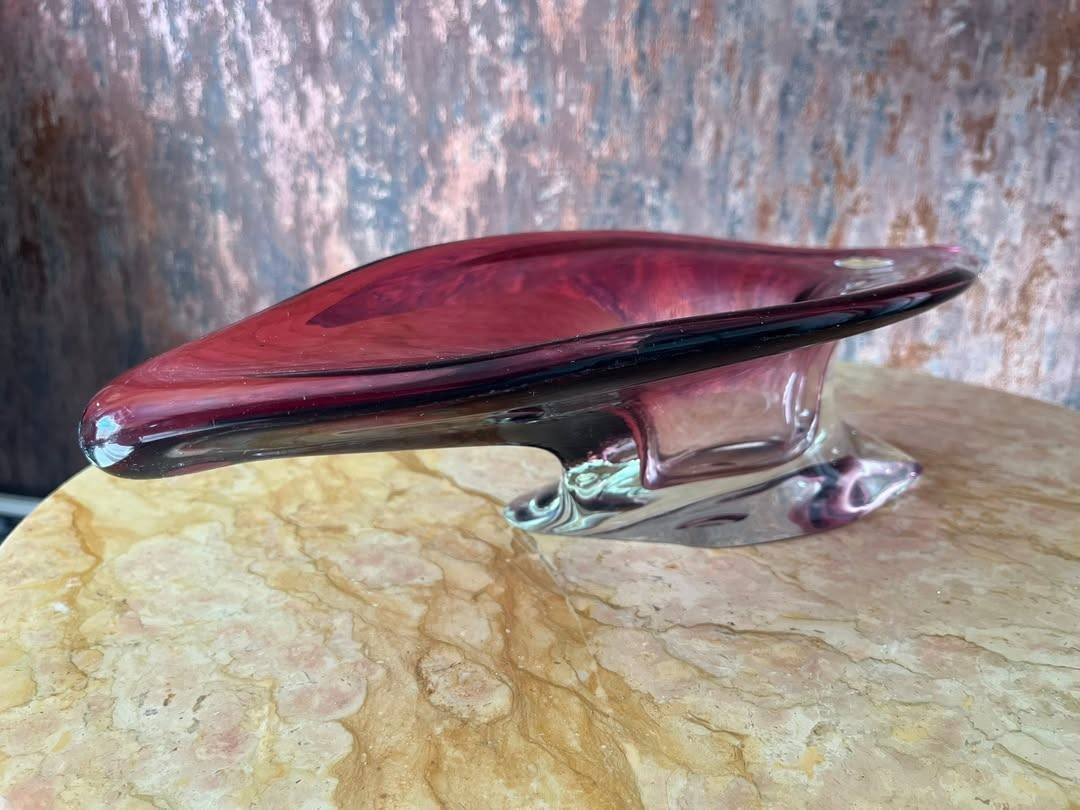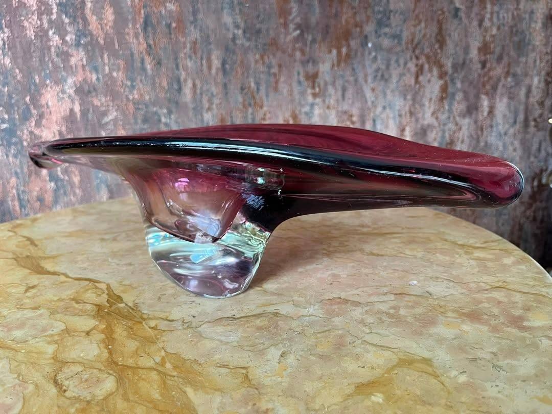 Realizata manual din sticlă masivă, în nuanțe de roșu-rubiniu cu bază transparentă. Design fluid, specific stilului Murano – perfect ca piesă centrală pe o masă, comodă sau vitrină.