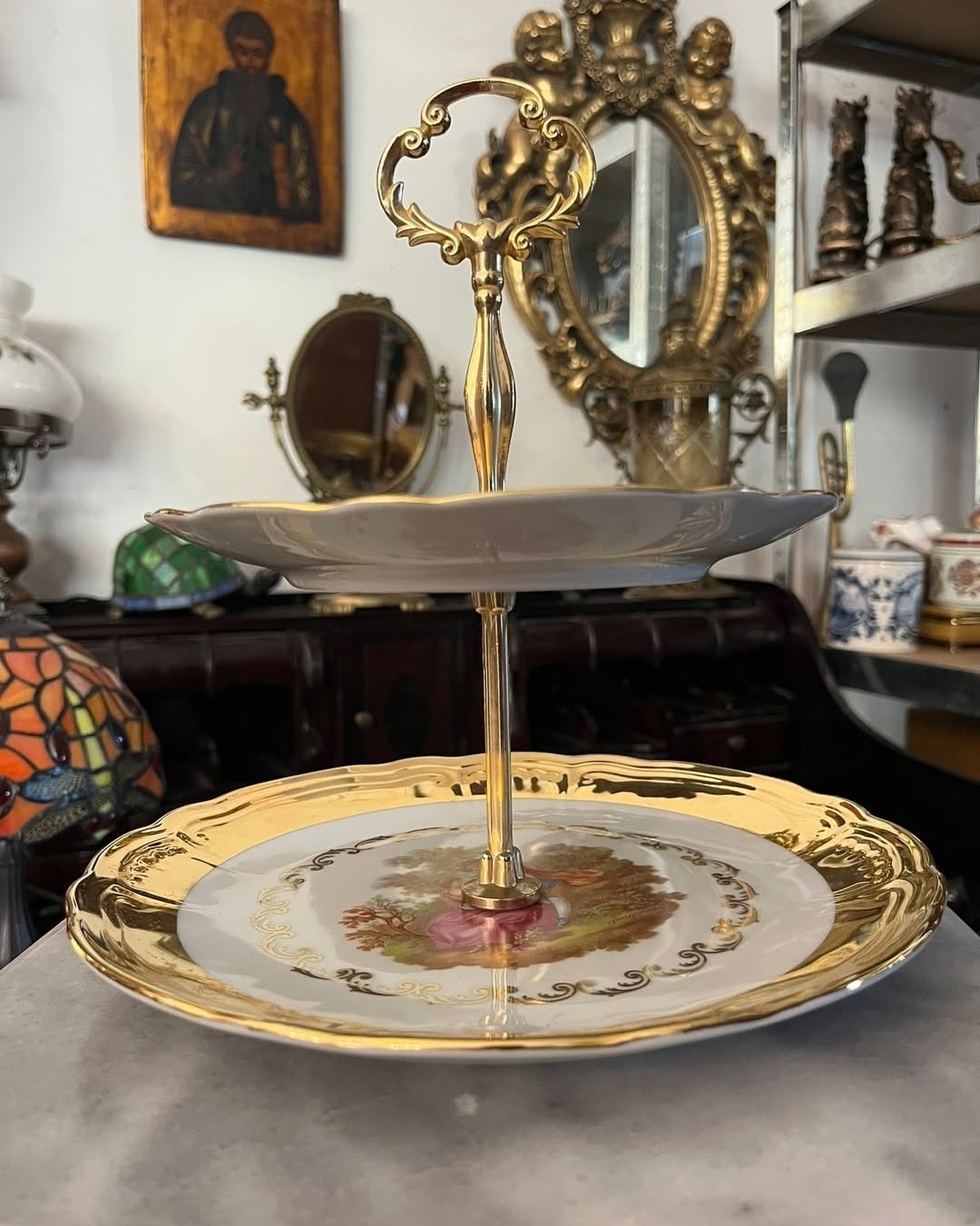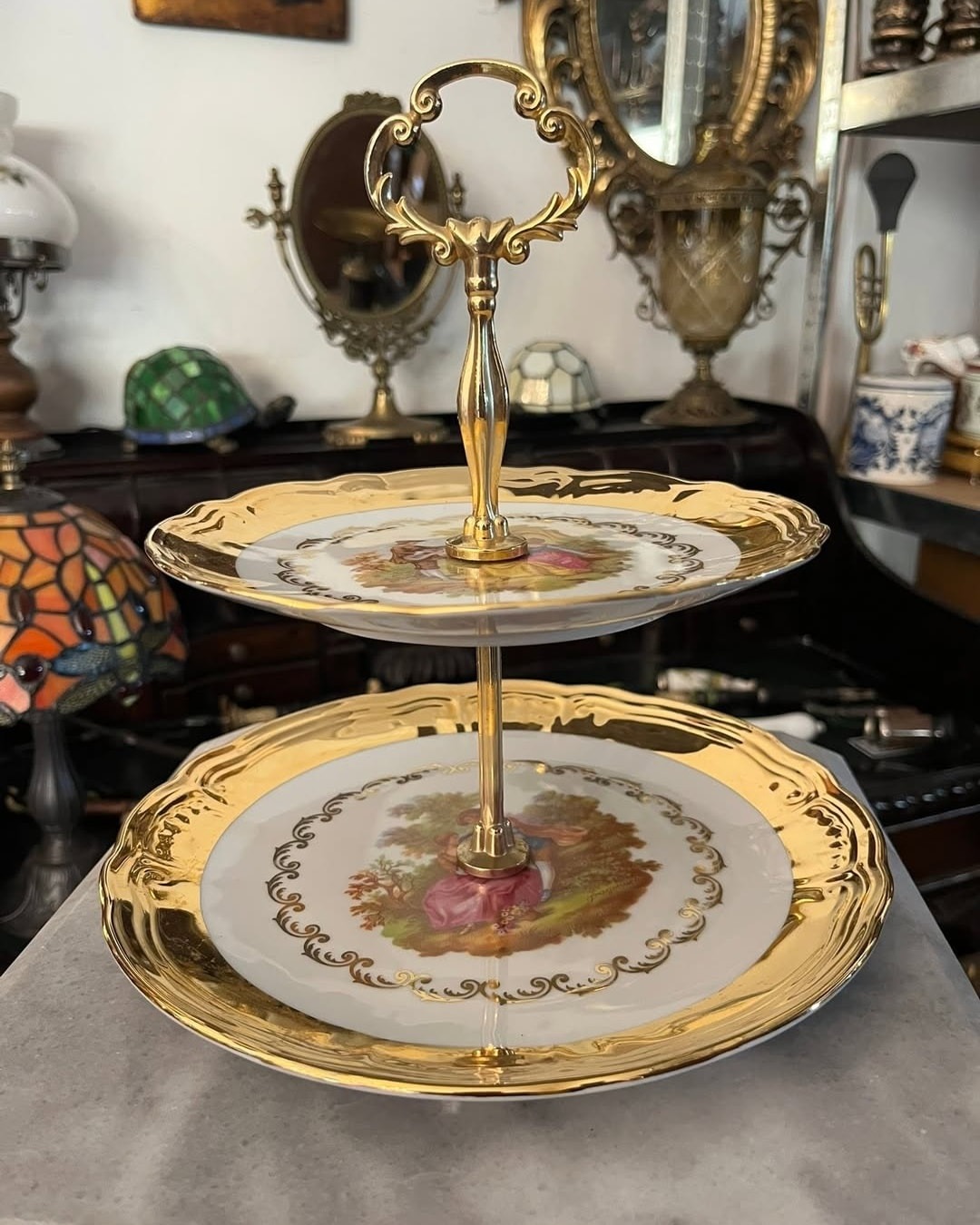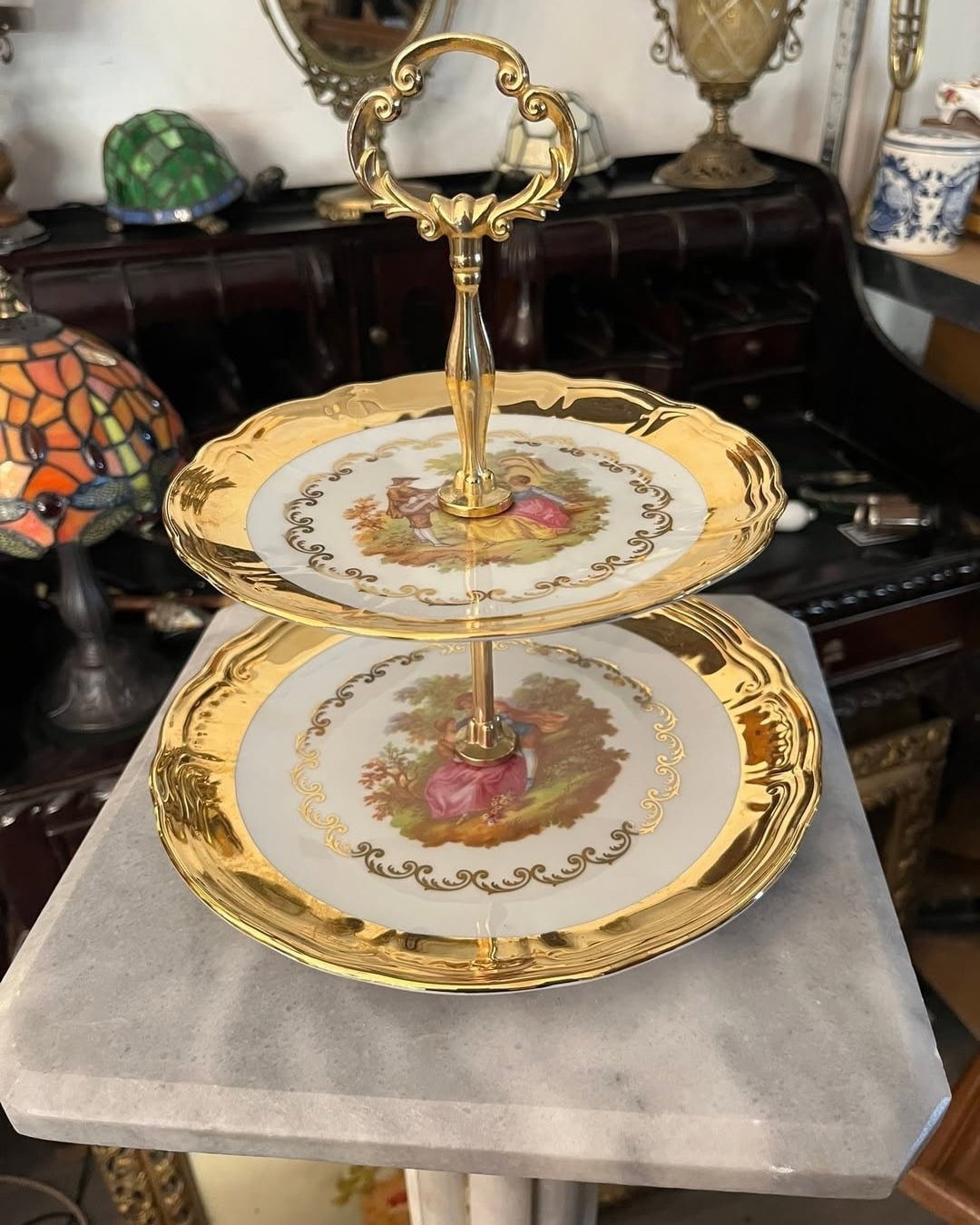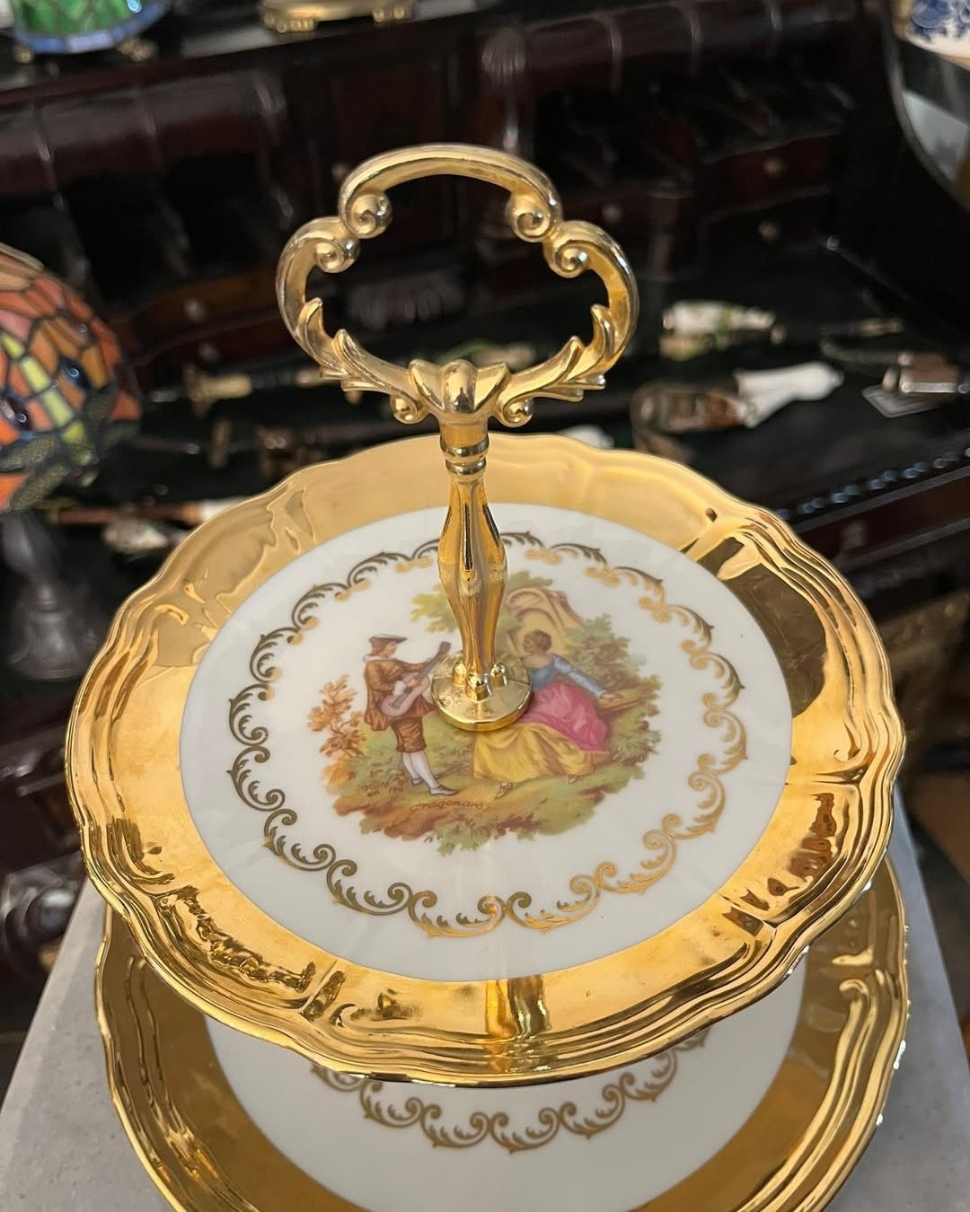 Fructiera pe doua nivele din portelan cu scena fragonard, poleita partual cu aur de 24k.