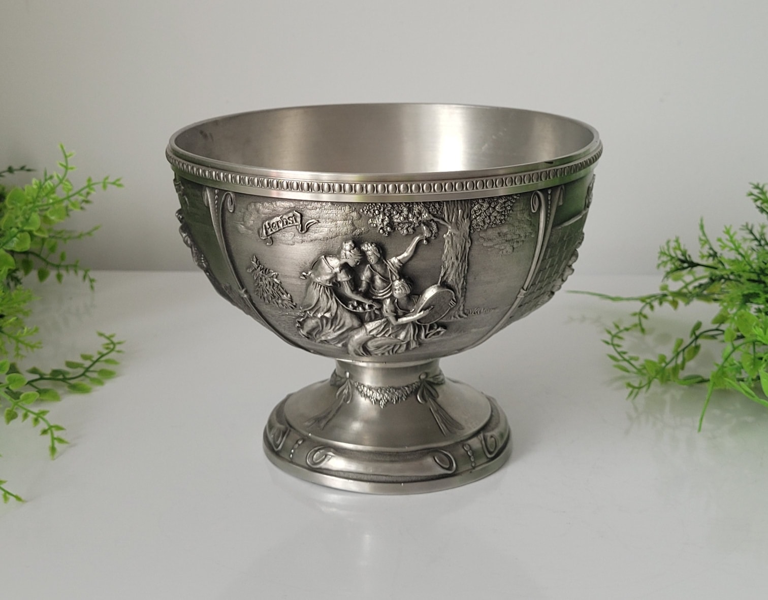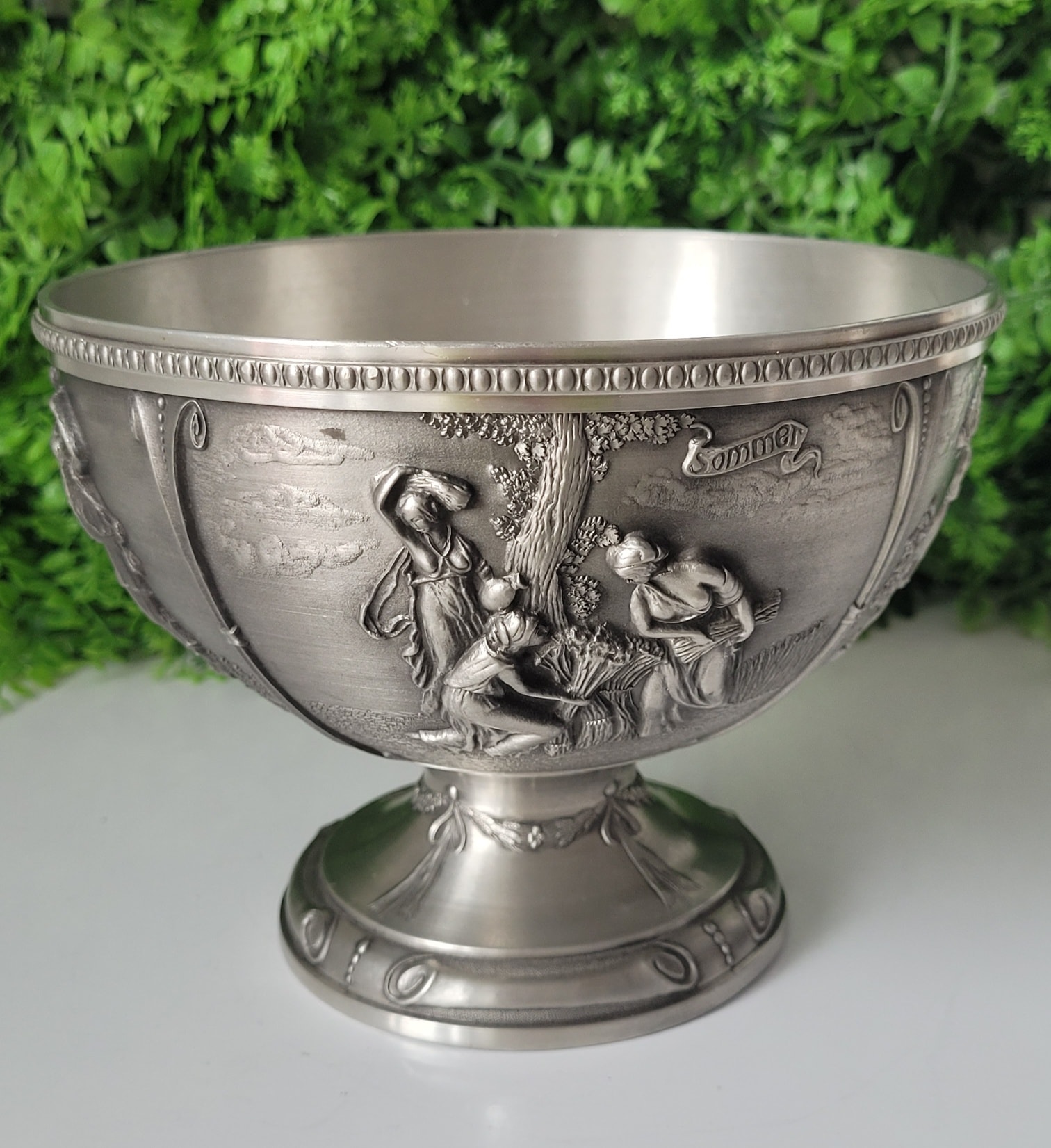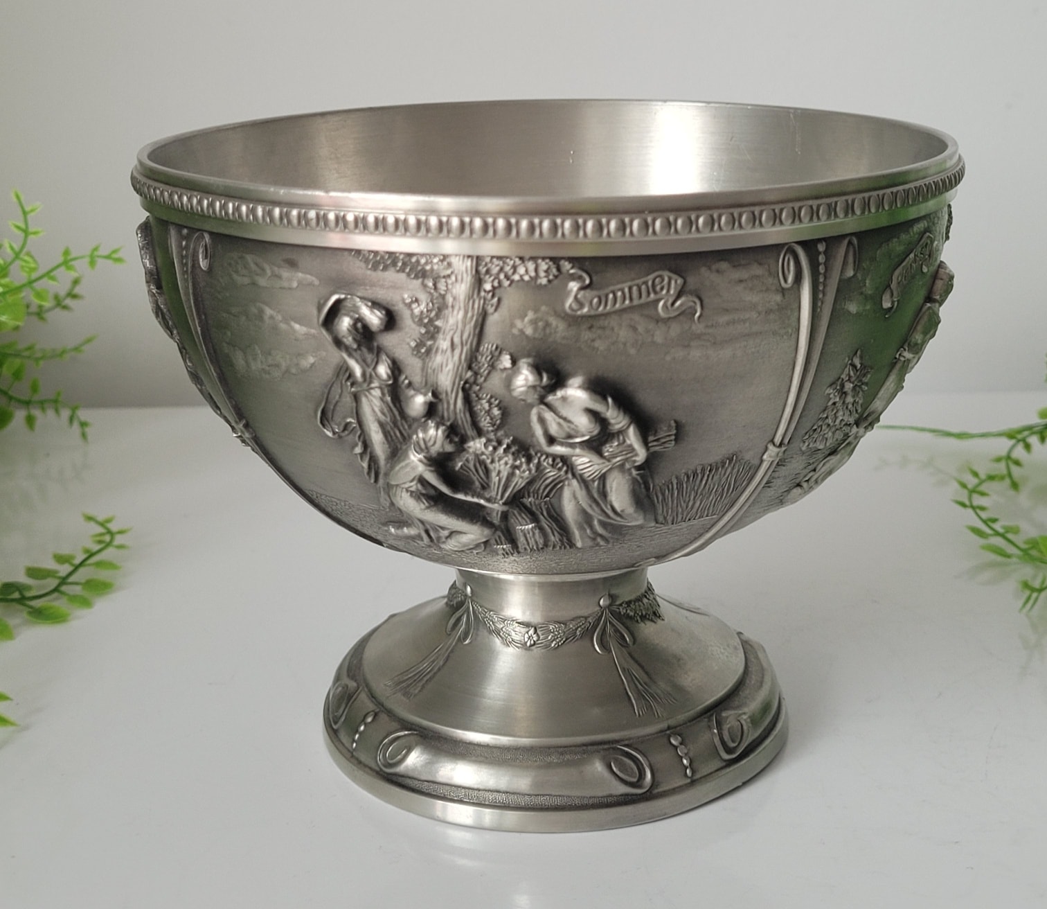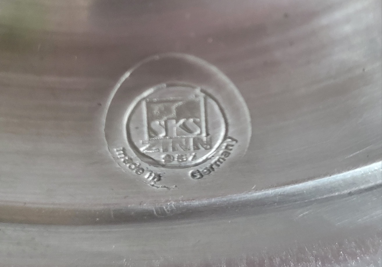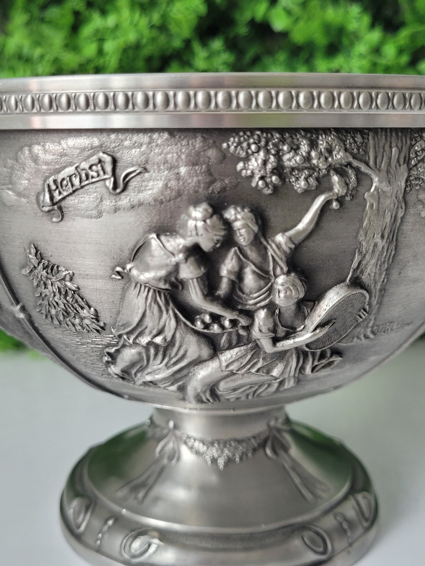 Fructiera realizată din staniu masiv (Zinn), produs de marca germană de prestigiu SKS Zinn. Este o piesă robustă, cu un finisaj satinat elegant și reliefuri