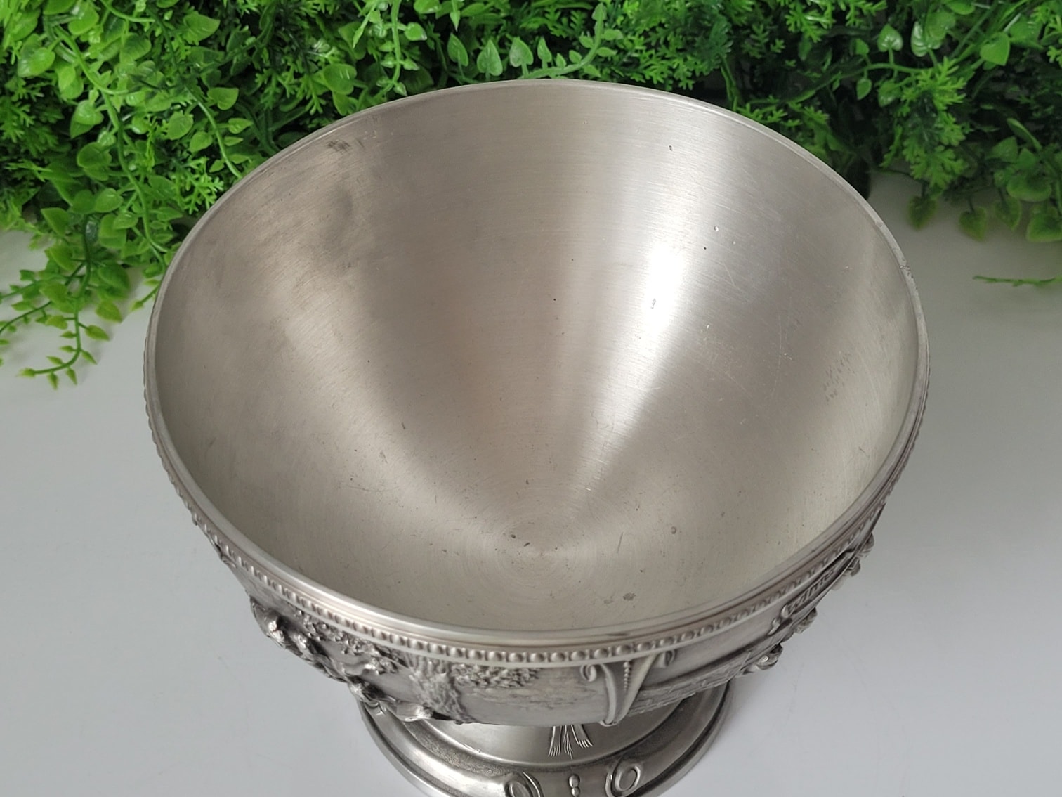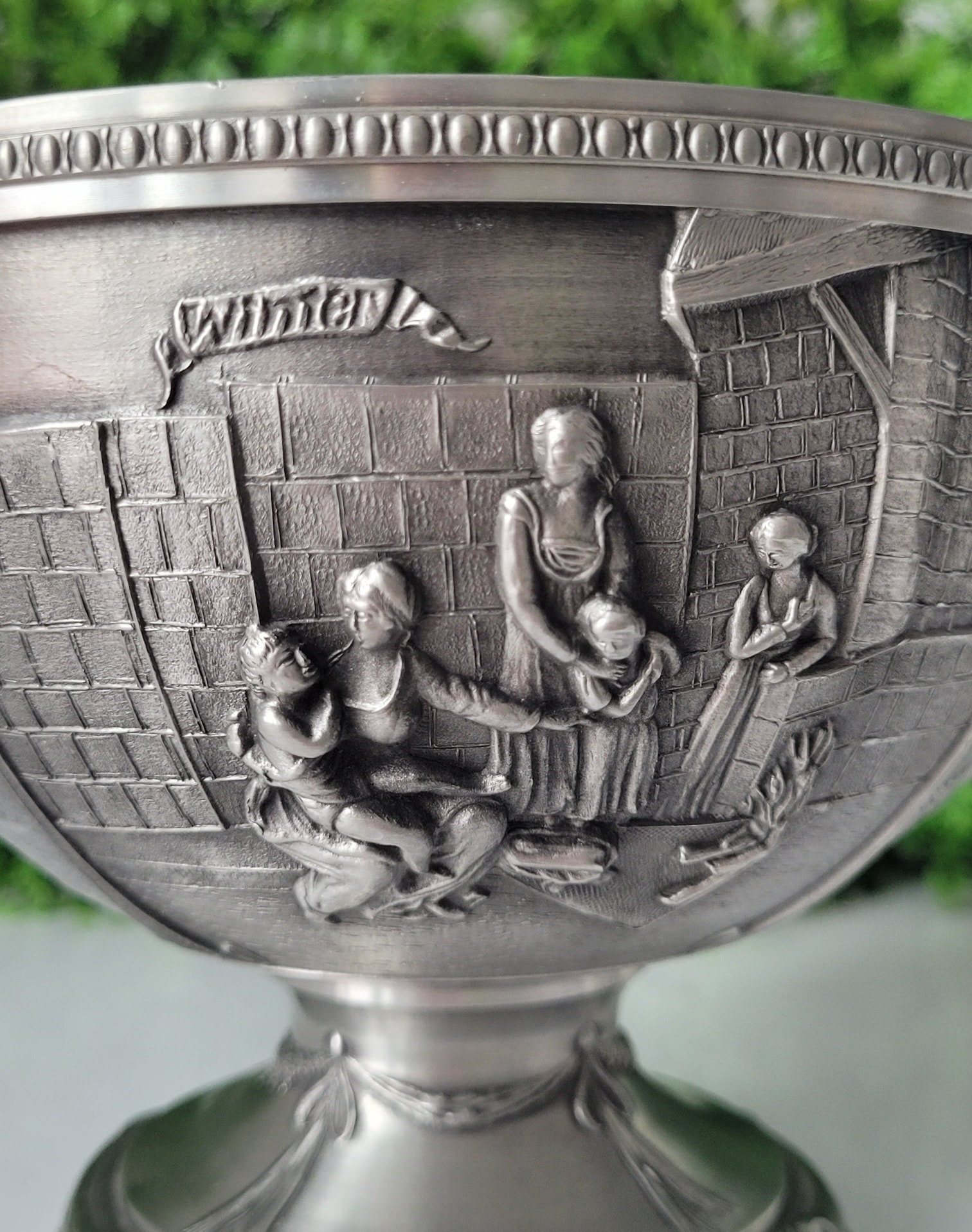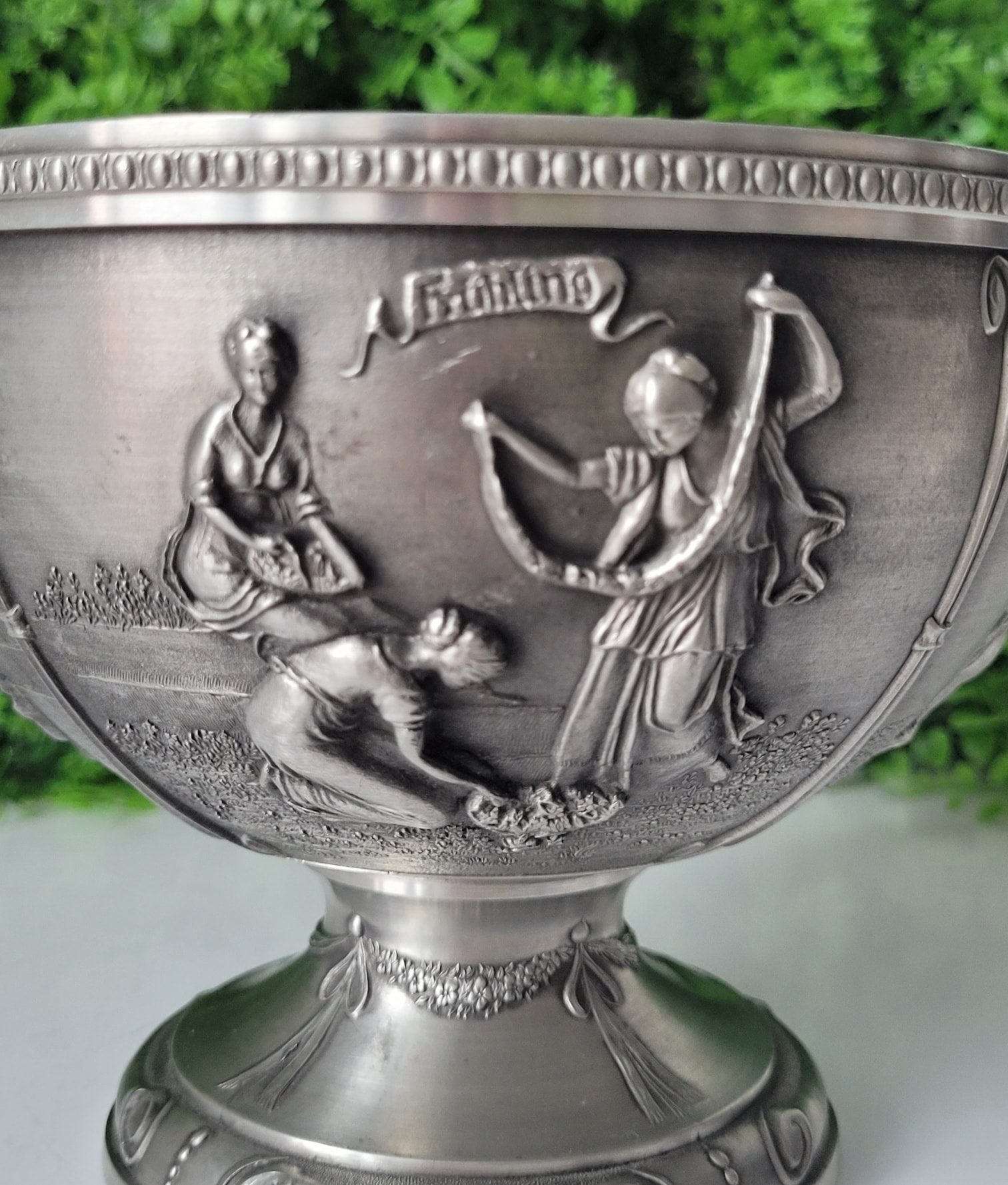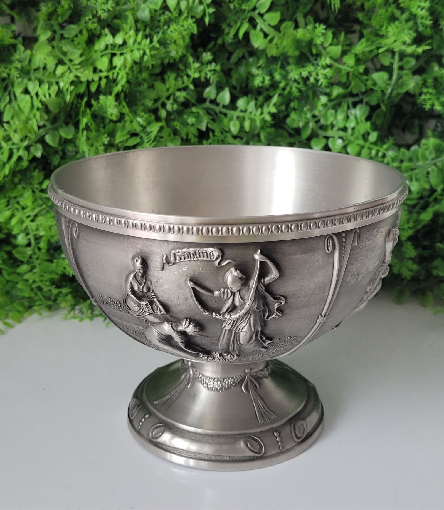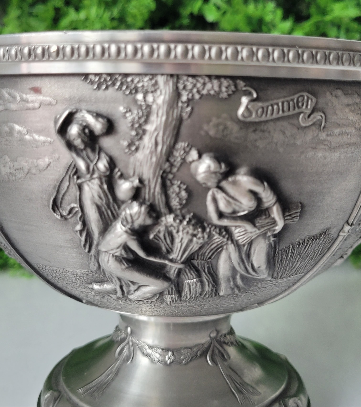 Fructiera realizată din staniu masiv (Zinn), produs de marca germană de prestigiu SKS Zinn. Este o piesă robustă, cu un finisaj satinat elegant și reliefuri