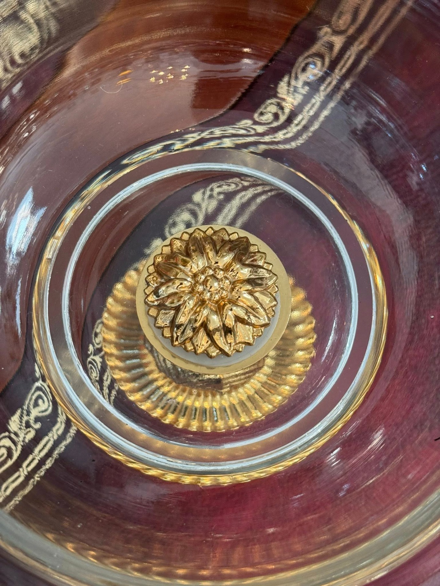 Fructieră (sau bombonieră) elegantă, realizată într-un stil neoclasic, din cristal cu picior din bronz aurit. (cca 1930)