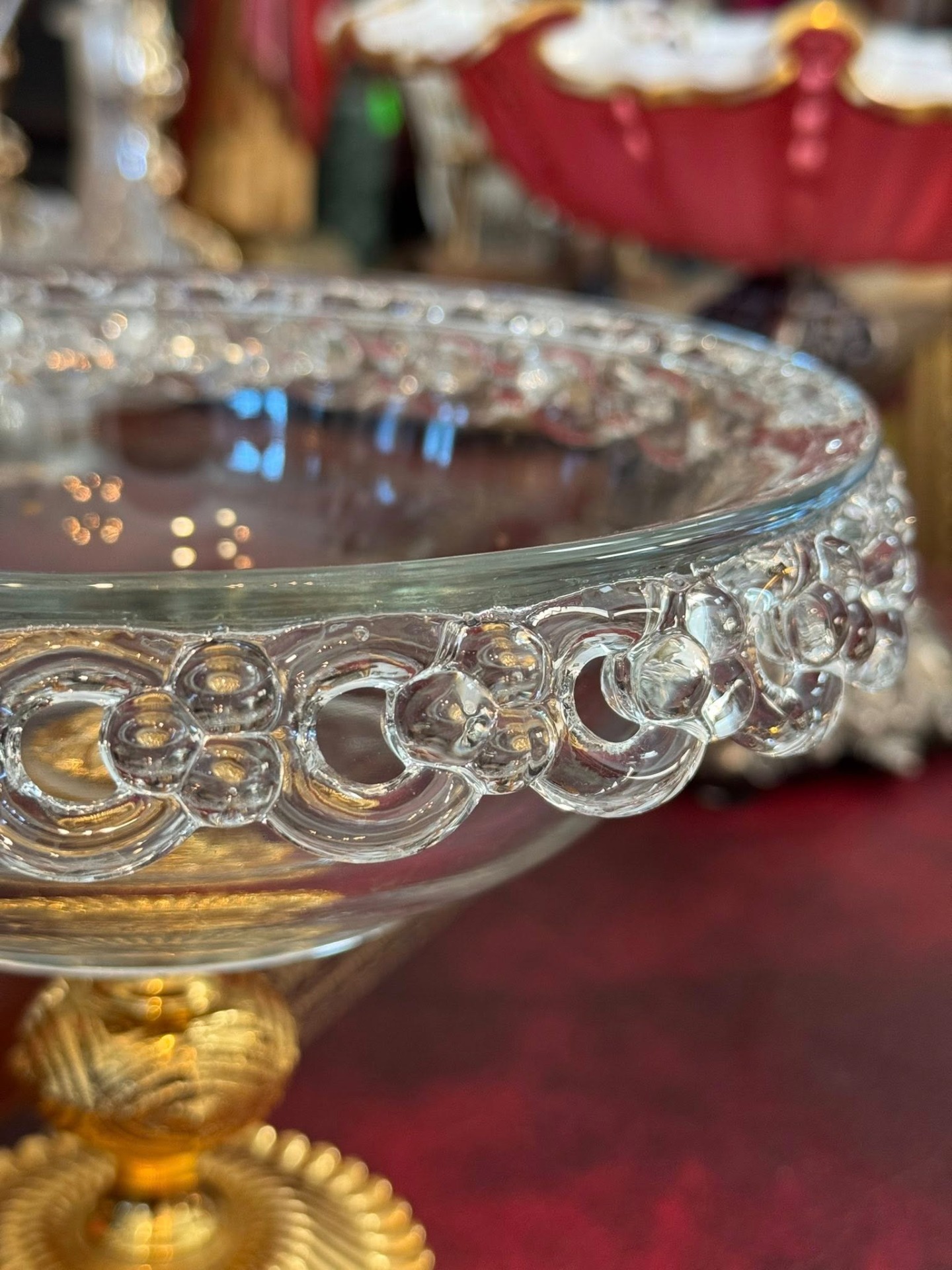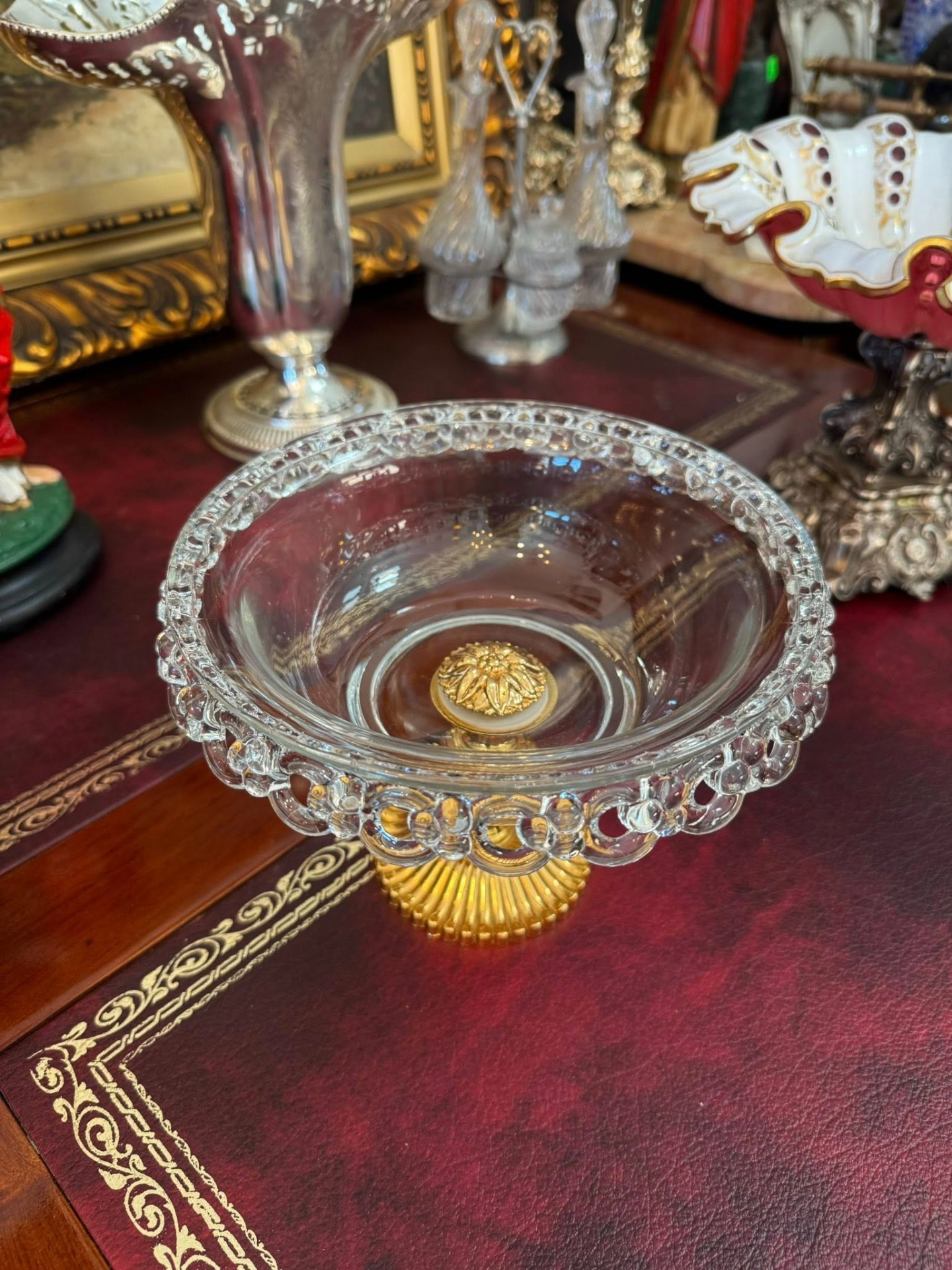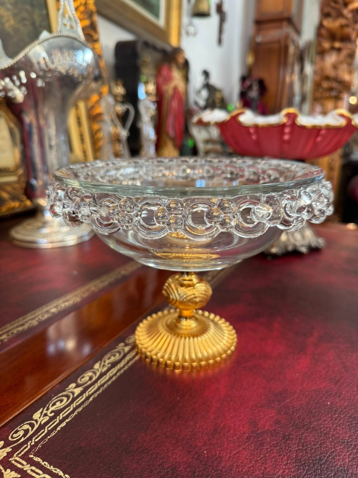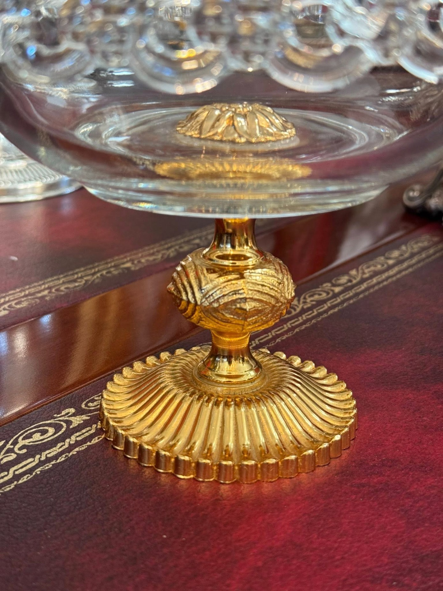 Fructieră (sau bombonieră) elegantă, realizată într-un stil neoclasic, din cristal cu picior din bronz aurit.