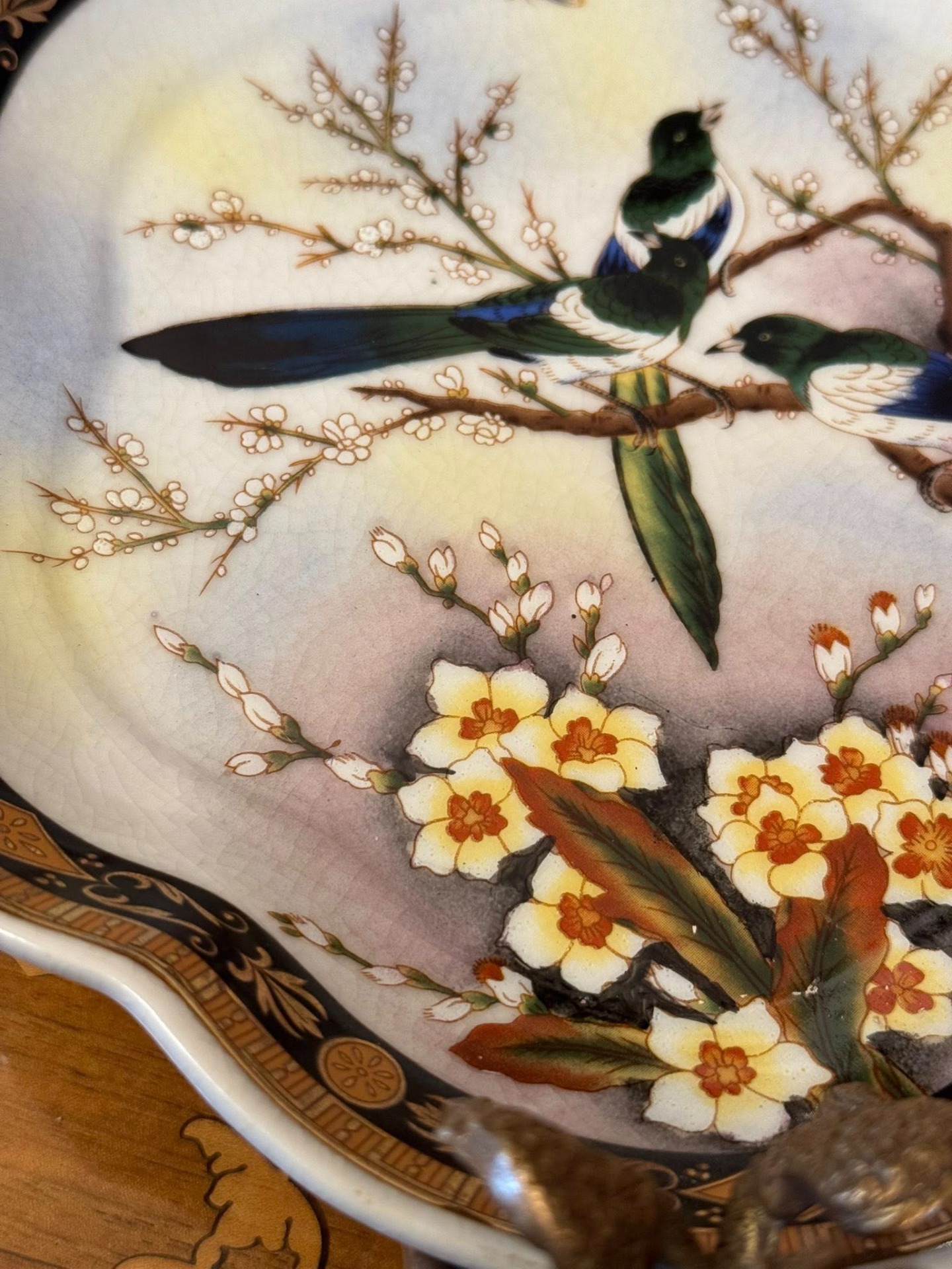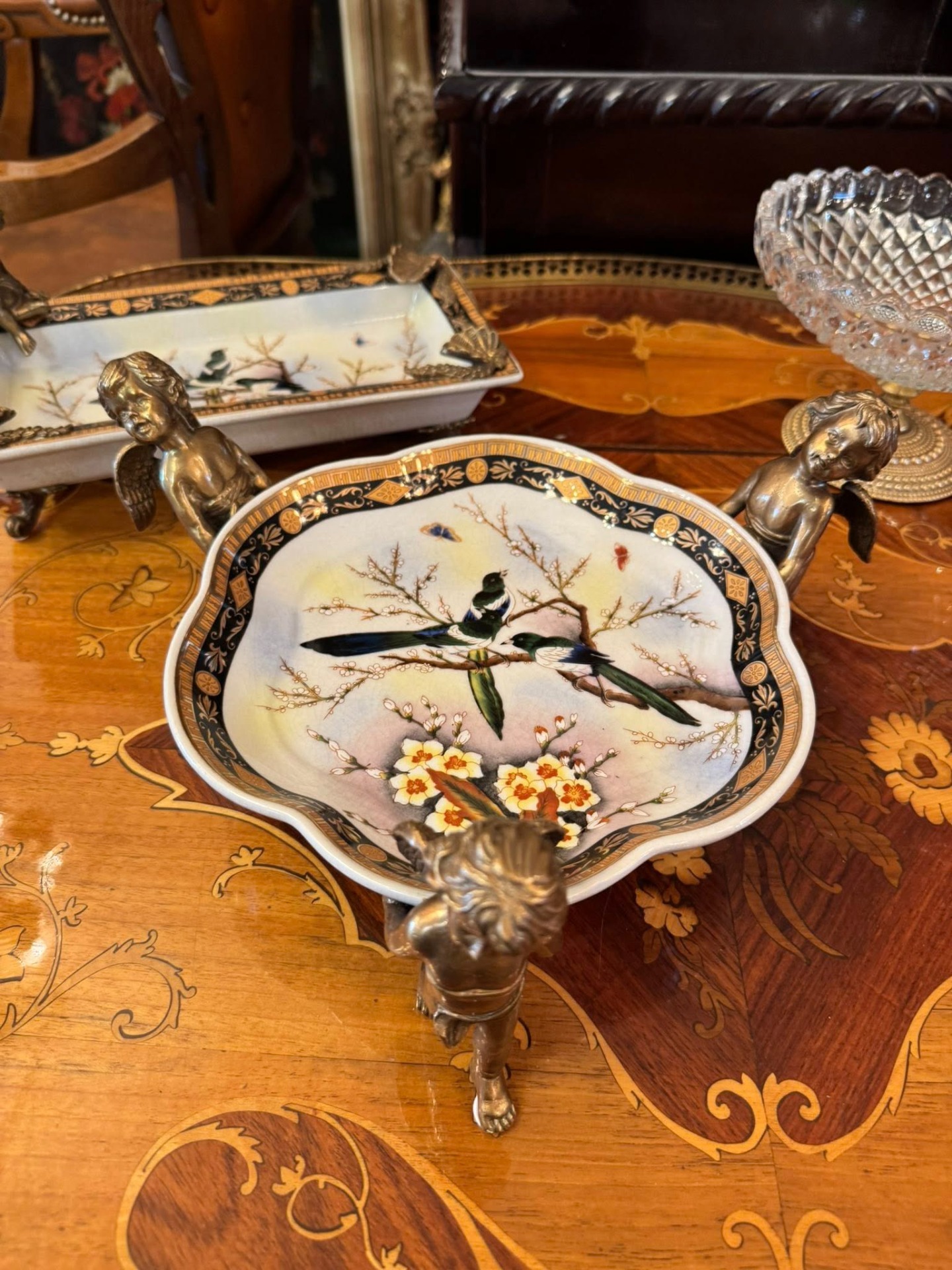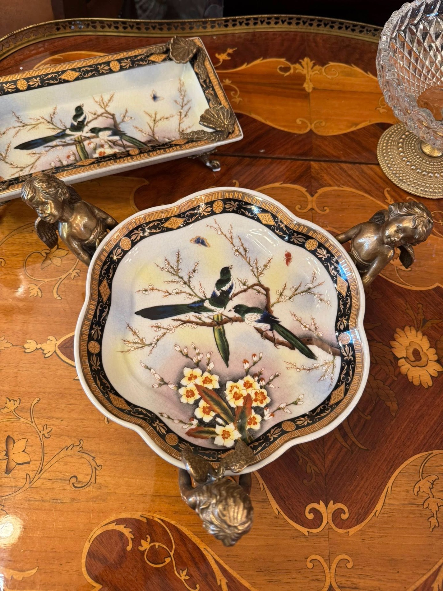 Fructieră superbă din porțelan cu motiv floral cu suport din bronz.