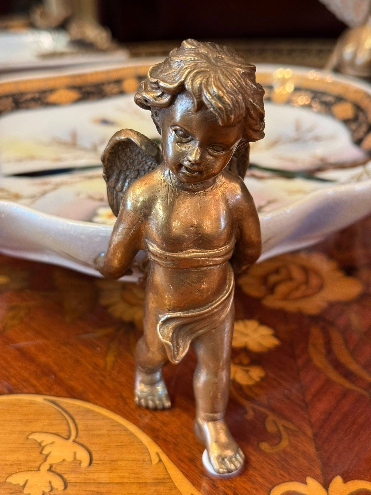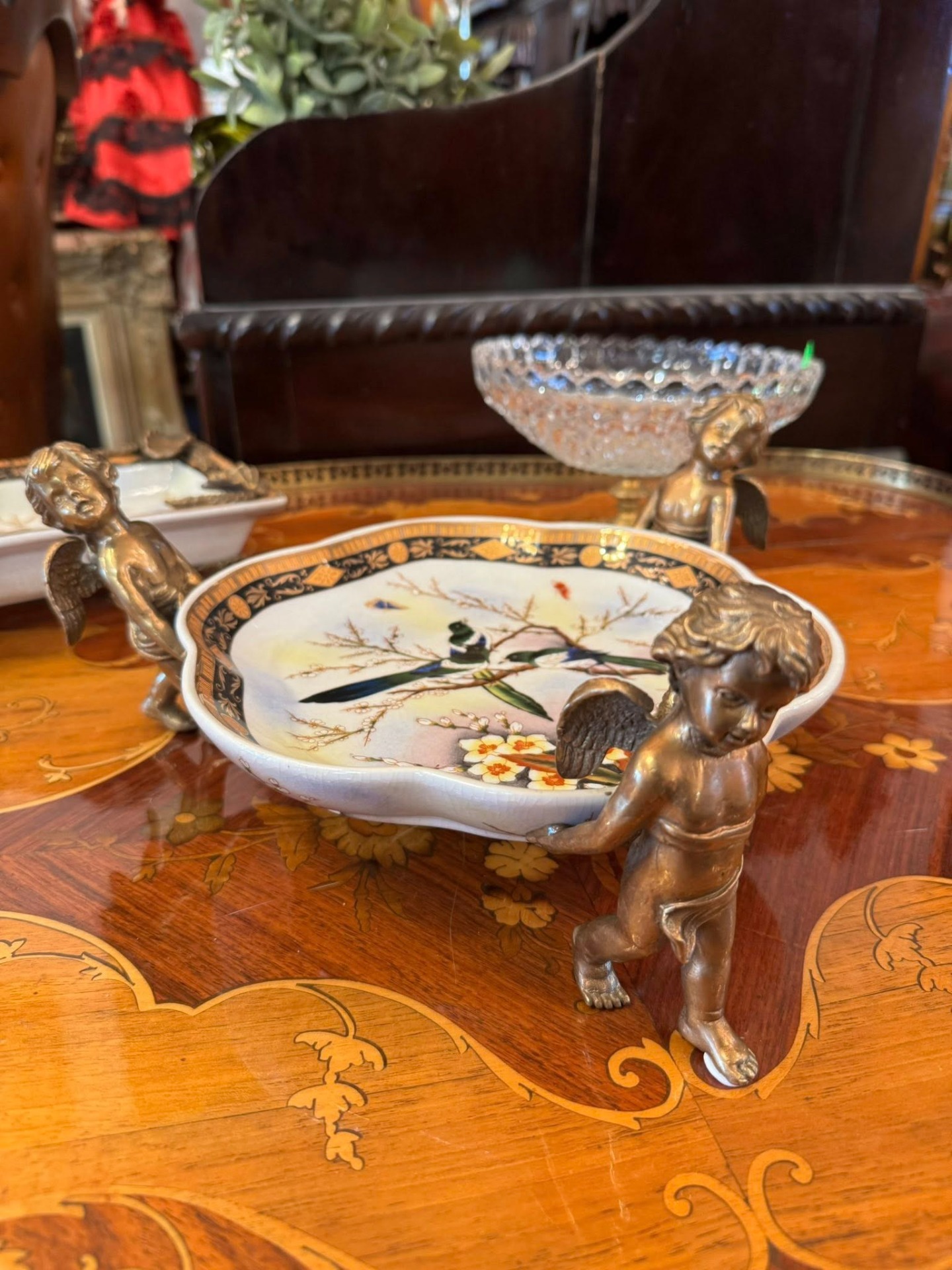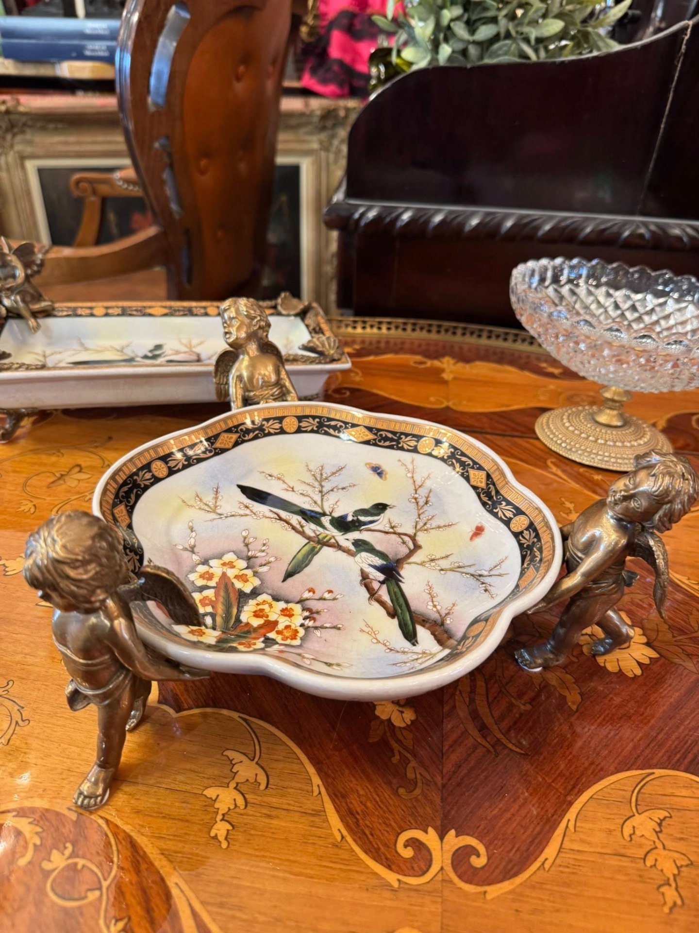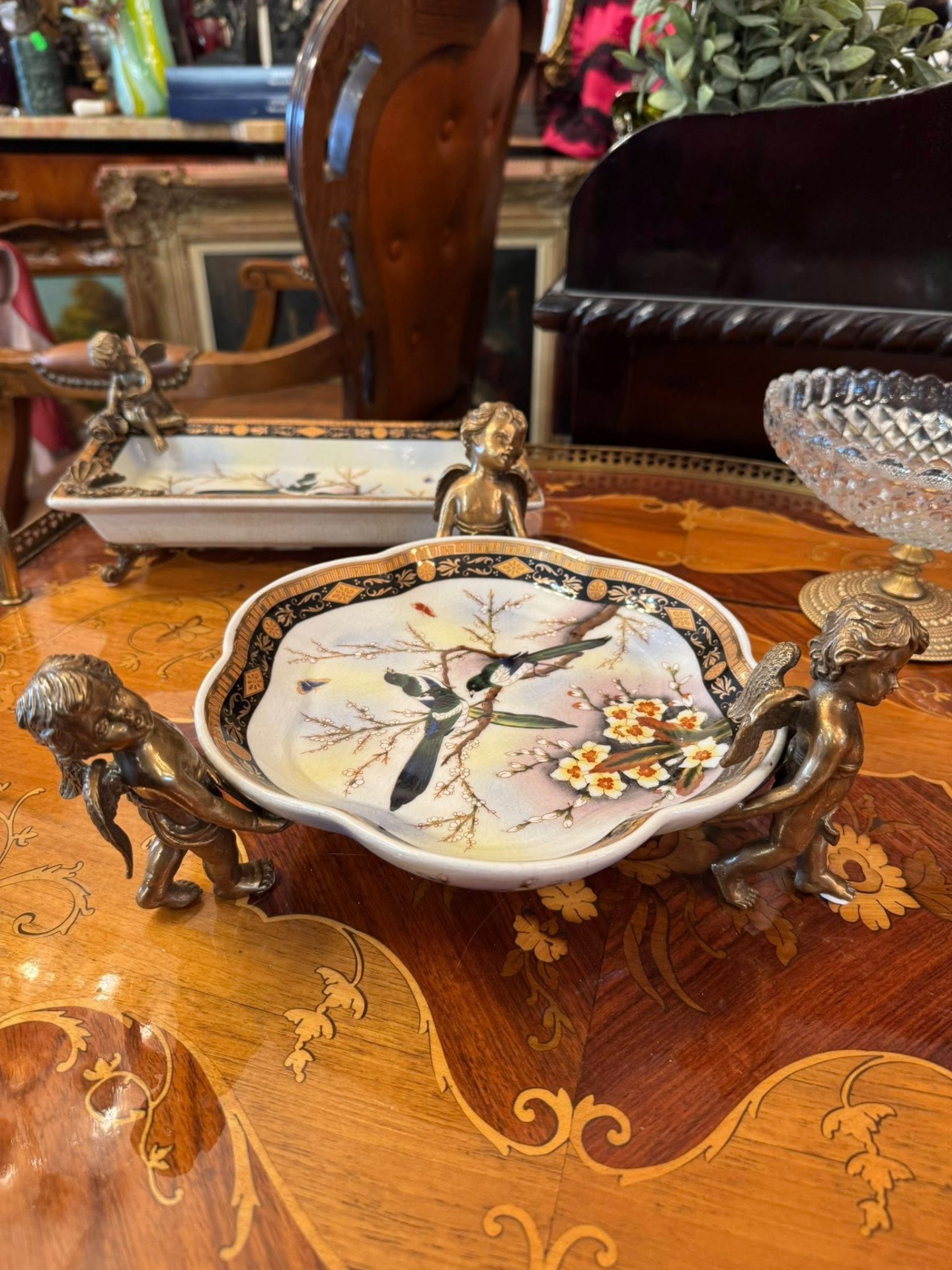 Fructieră superbă din porțelan cu motiv floral cu suport din bronz.