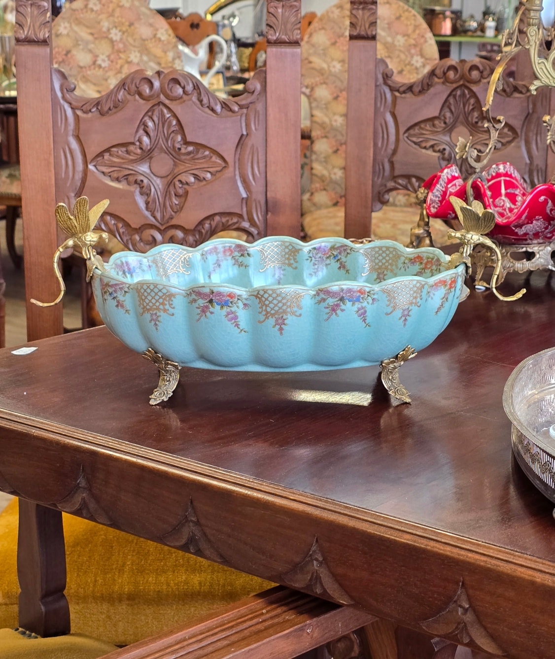 Fructieră superbă din porțelan cu ornamente din bronz, decorată cu libelule și pictată în motiv floral.