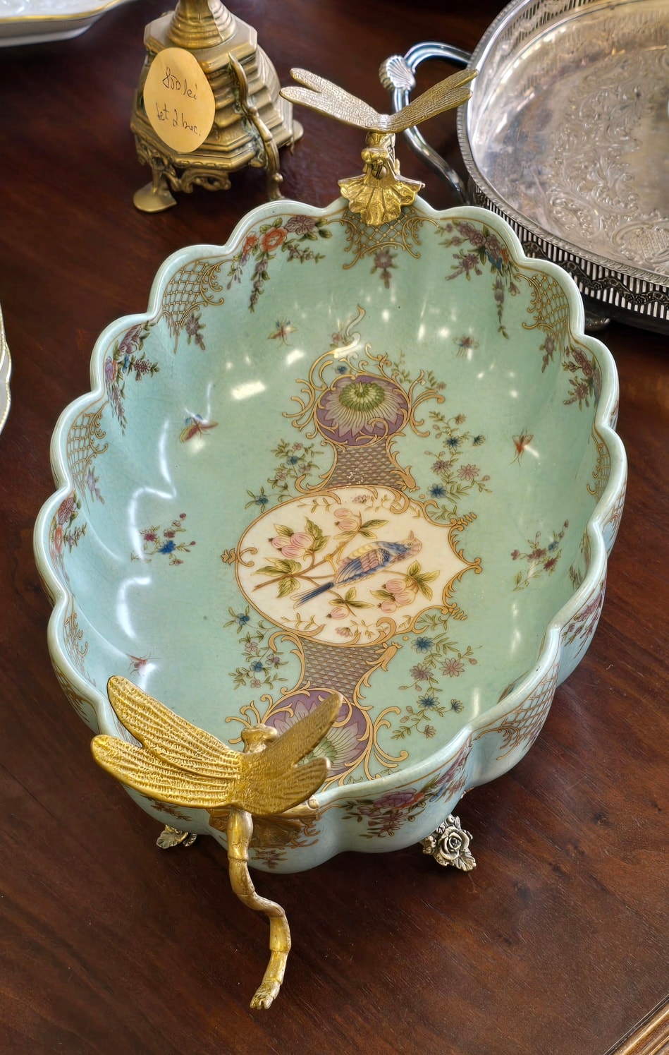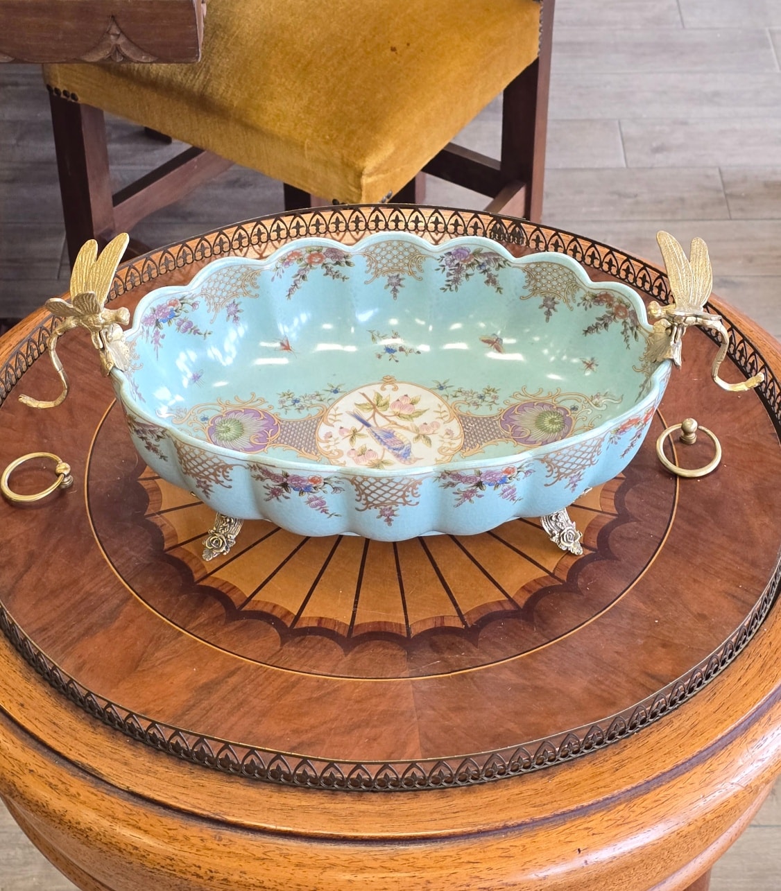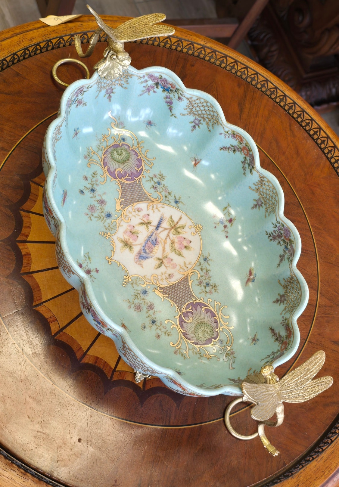 Fructieră superbă din porțelan cu ornamente din bronz, decorată cu libelule,