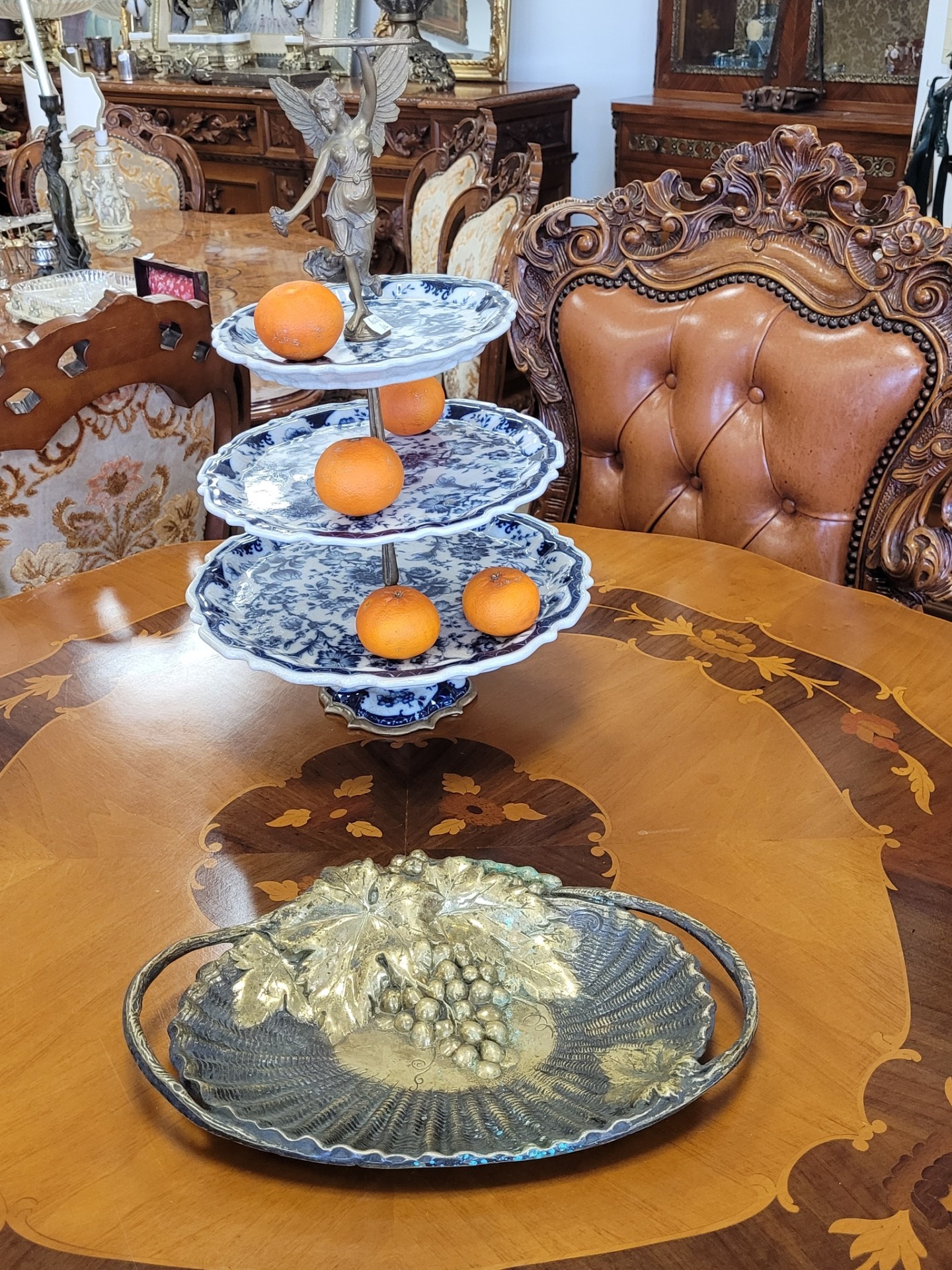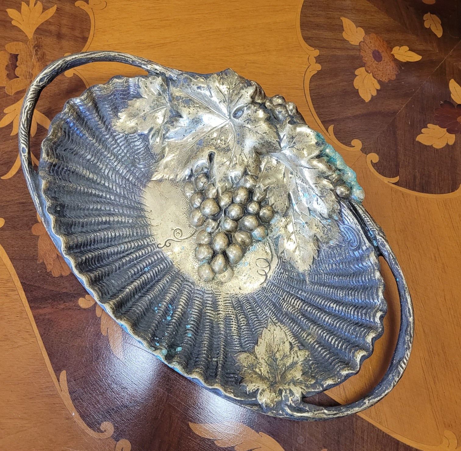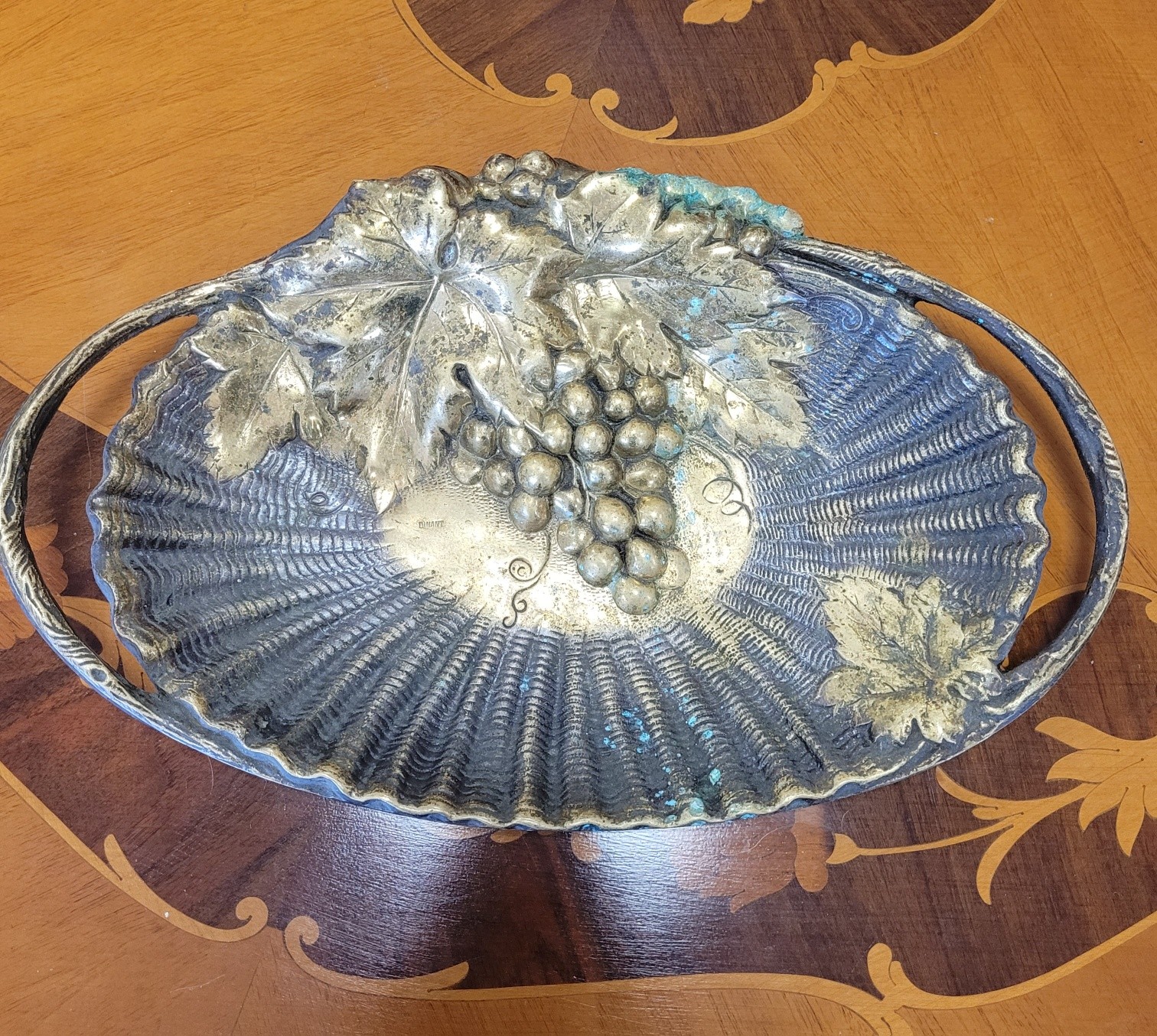 Fructieră/tavă decorativă deosebită, din alamă masivă, o piesă de anticariat veritabilă, realizată prin tehnica baterii metalului (dinanderie).