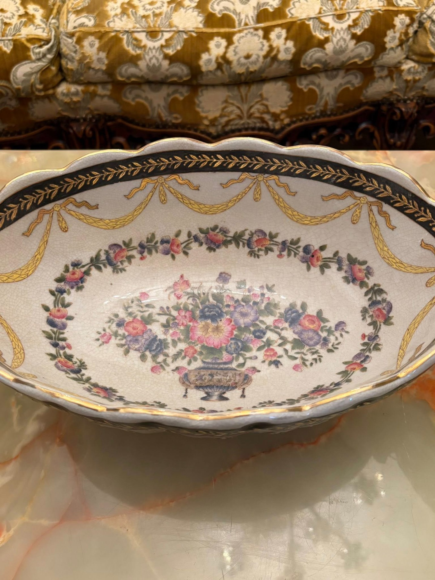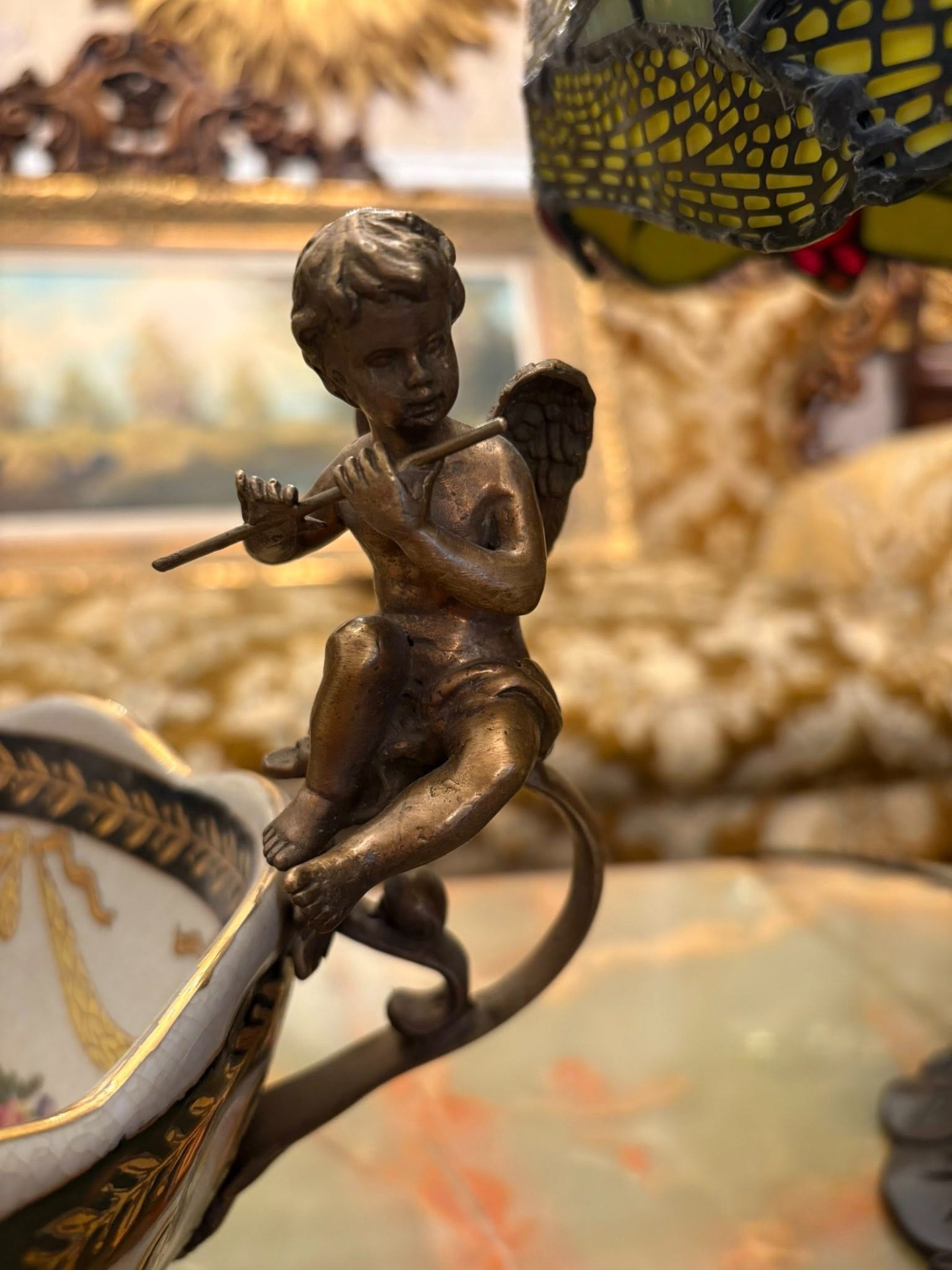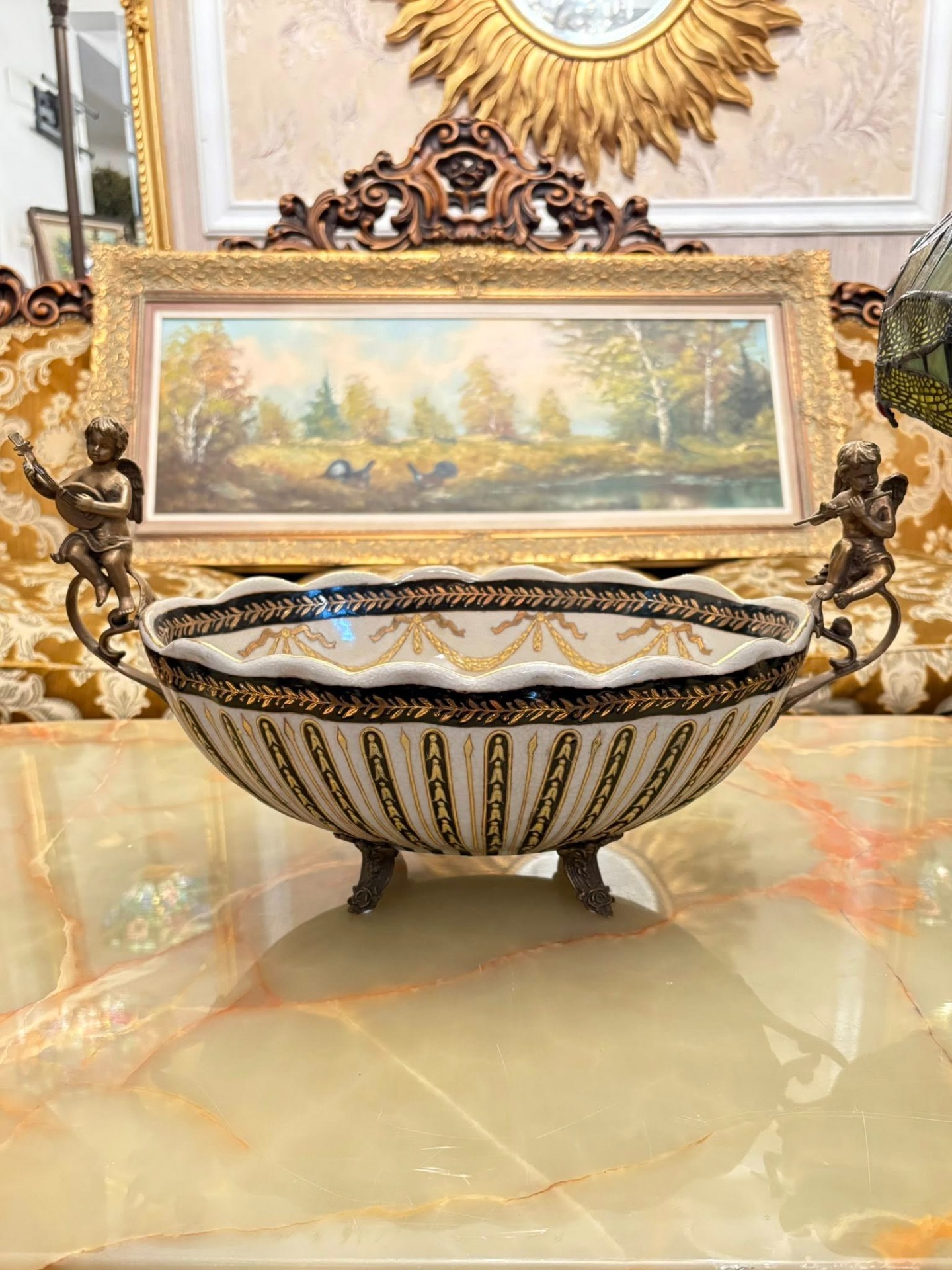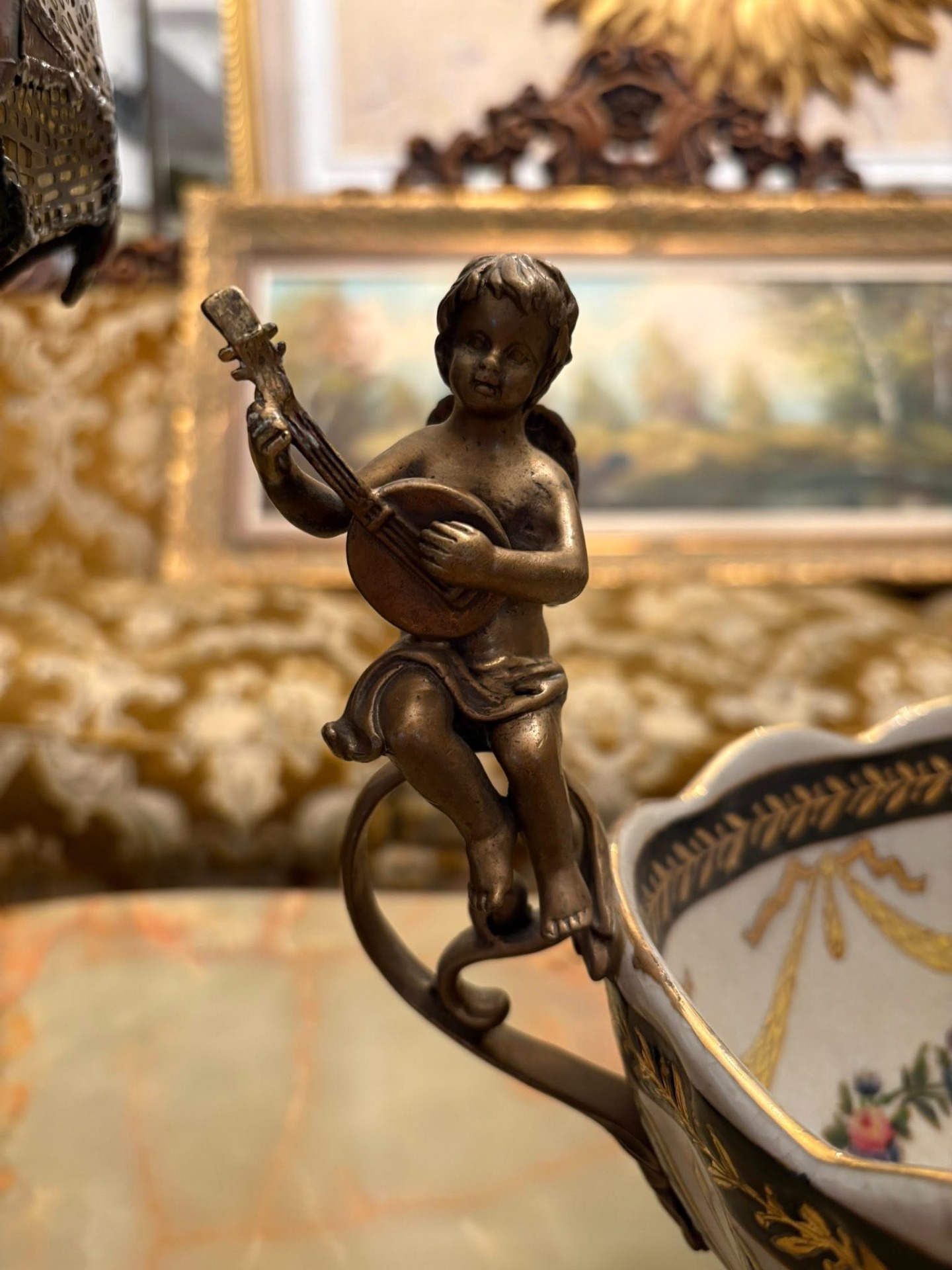 Fructieră veche din porțelan și bronz, decorată cu îngerași muzicanți ,