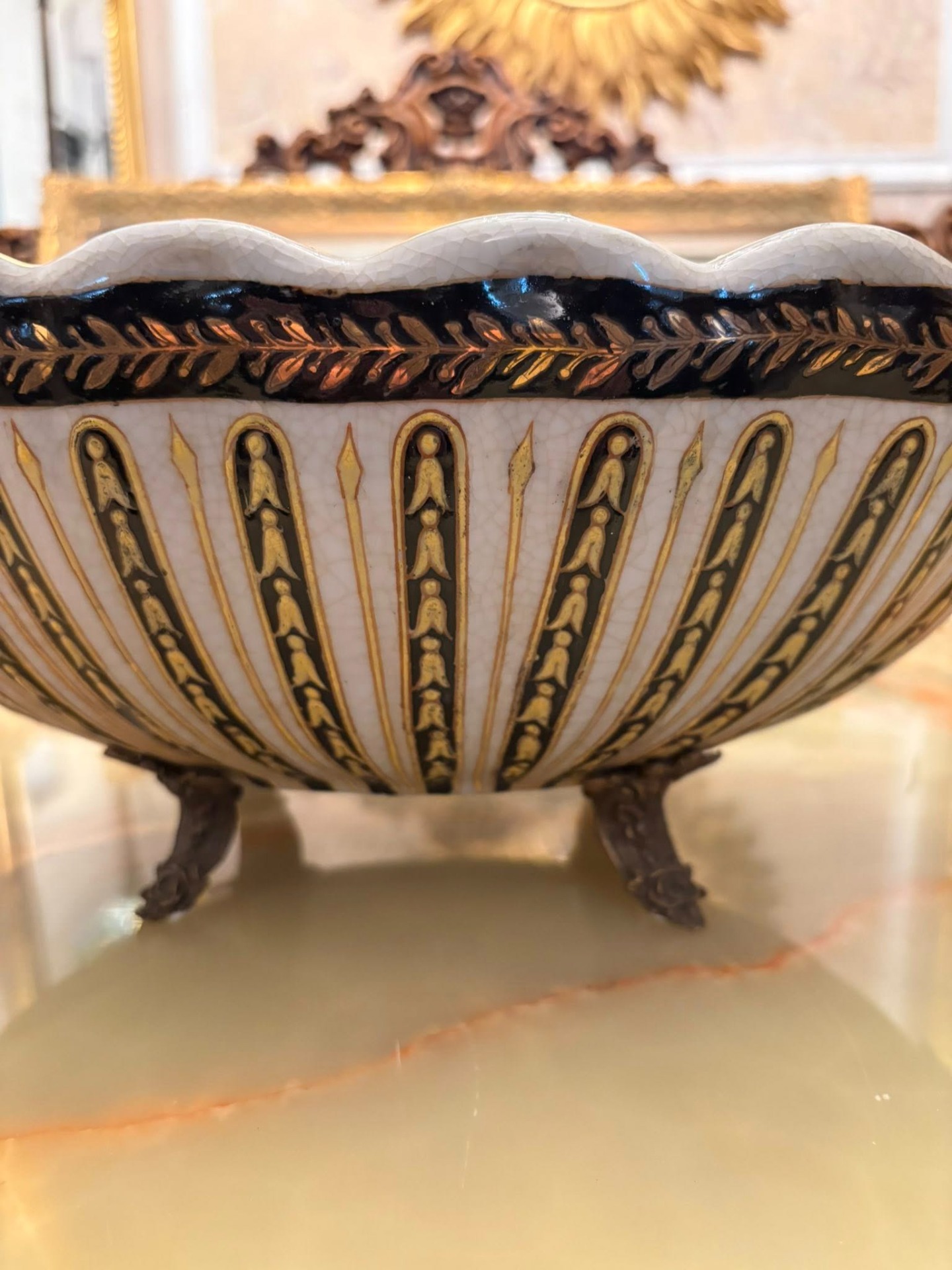 Fructieră veche din porțelan și bronz, decorată cu îngerași muzicanți și motive aurii.