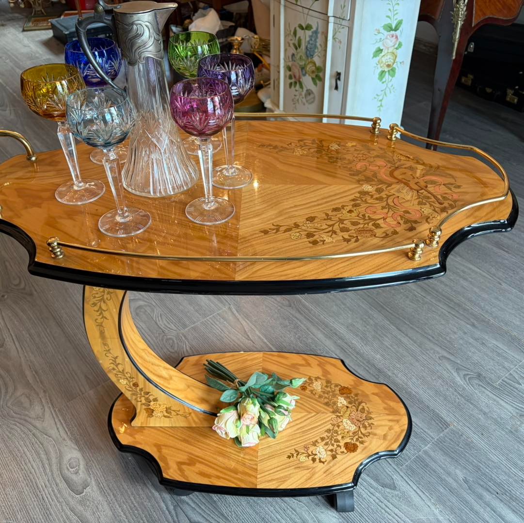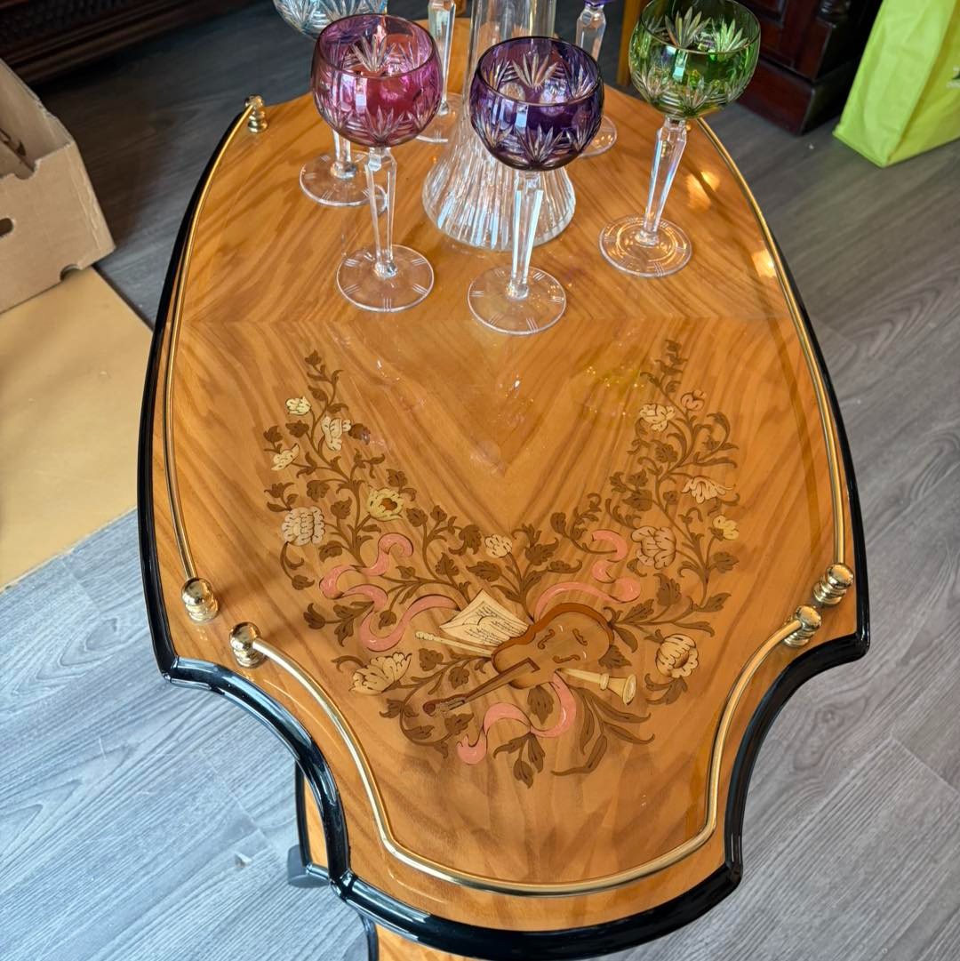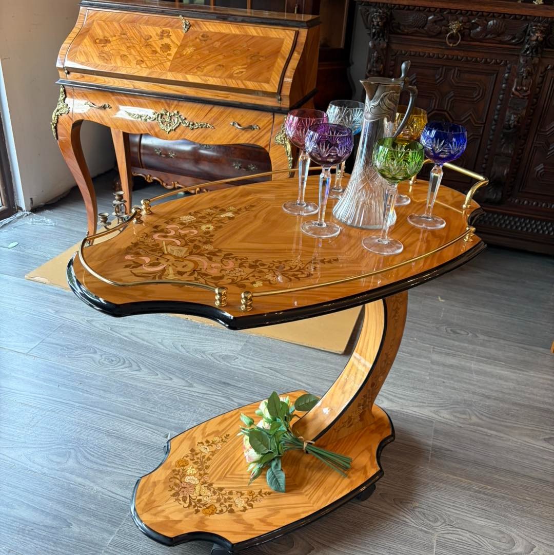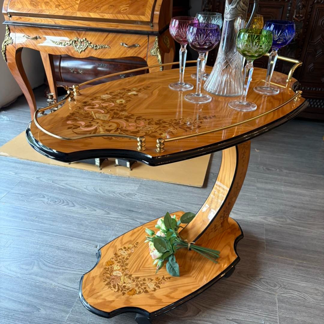 Gheridon din lemn cu intarsie.
