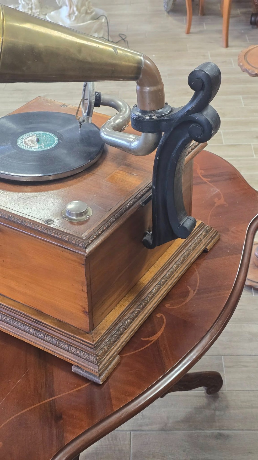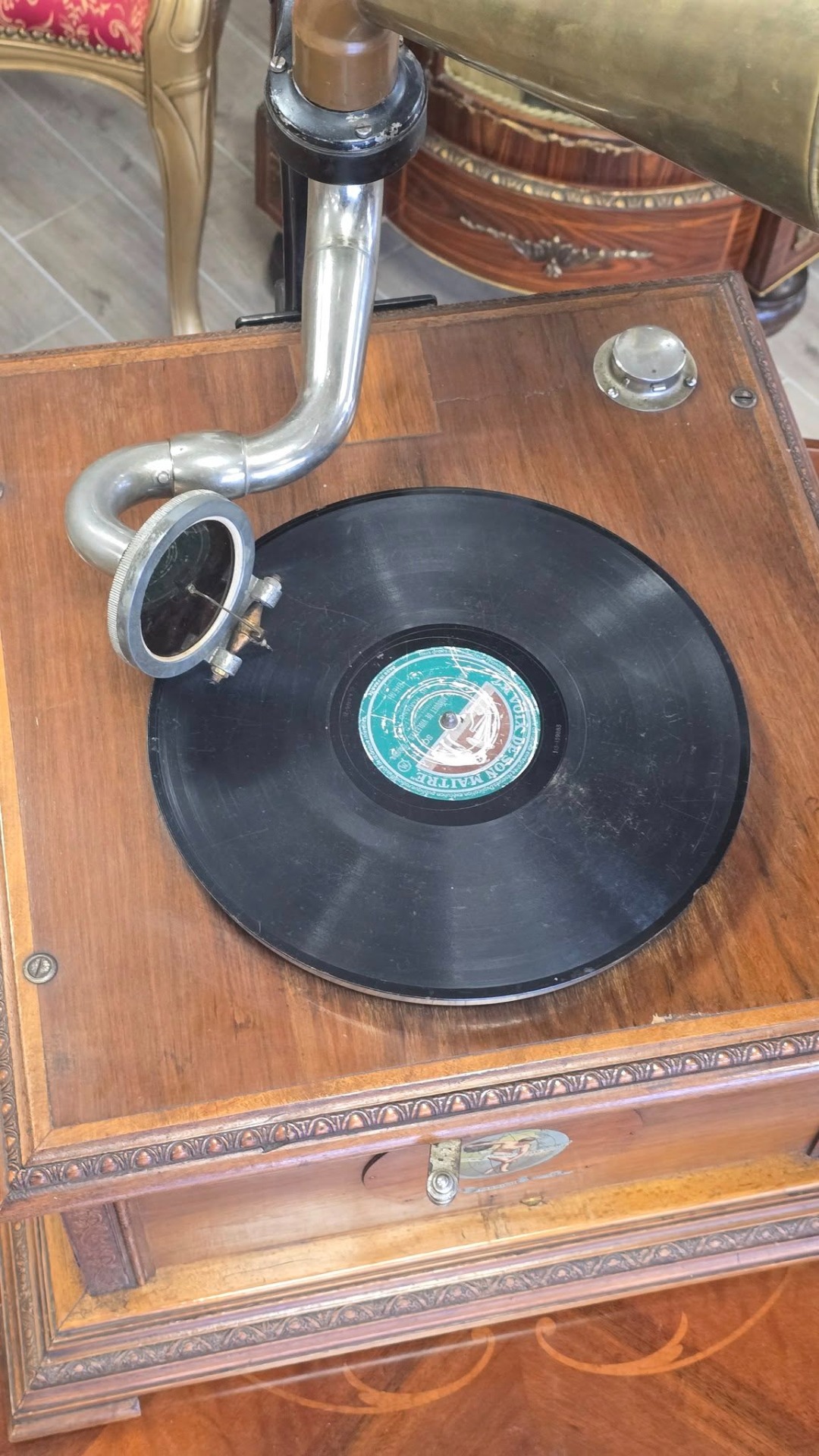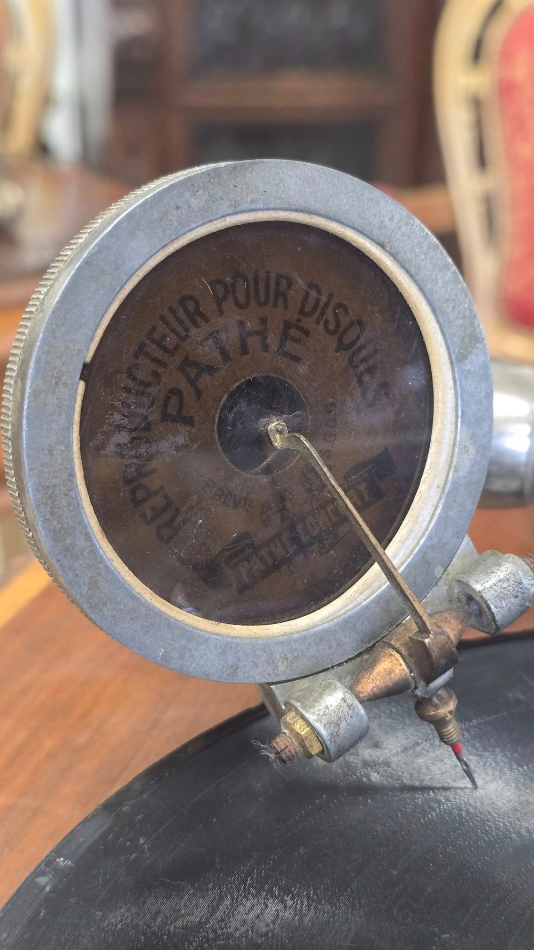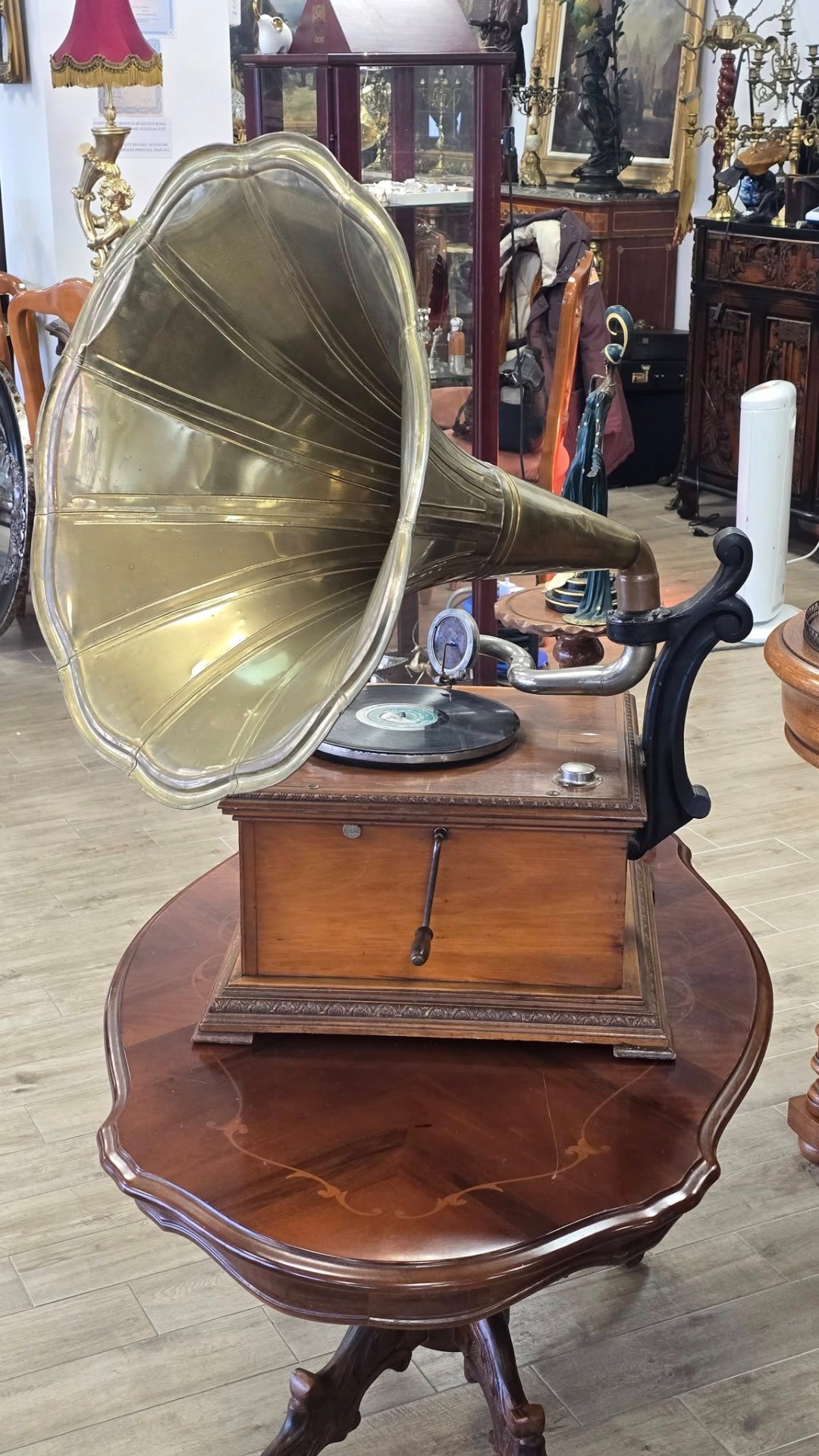 Époque (începutul sec. XX), aparat autentic păstrat într-o stare de conservare remarcabilă, cu doză "Reproducteur Pathé Concert", modelul de vârf al epocii, cu diafragmă mare, capabil să redea un sunet puternic și clar, cu ac cu prindere pe filet (foarte rar) și pâlnie tip "Morning Glory" din alamă masivă lustruită, care oferă o rezonanță caldă și un aspect vizual spectaculos. Carcasa este din lemn, cu logo-ul original "Pathé - Chantent Sans Aiguille" intact și cu culori vii, un detaliu rar la aparatele de peste 100 de ani.