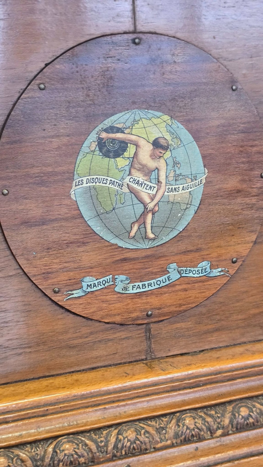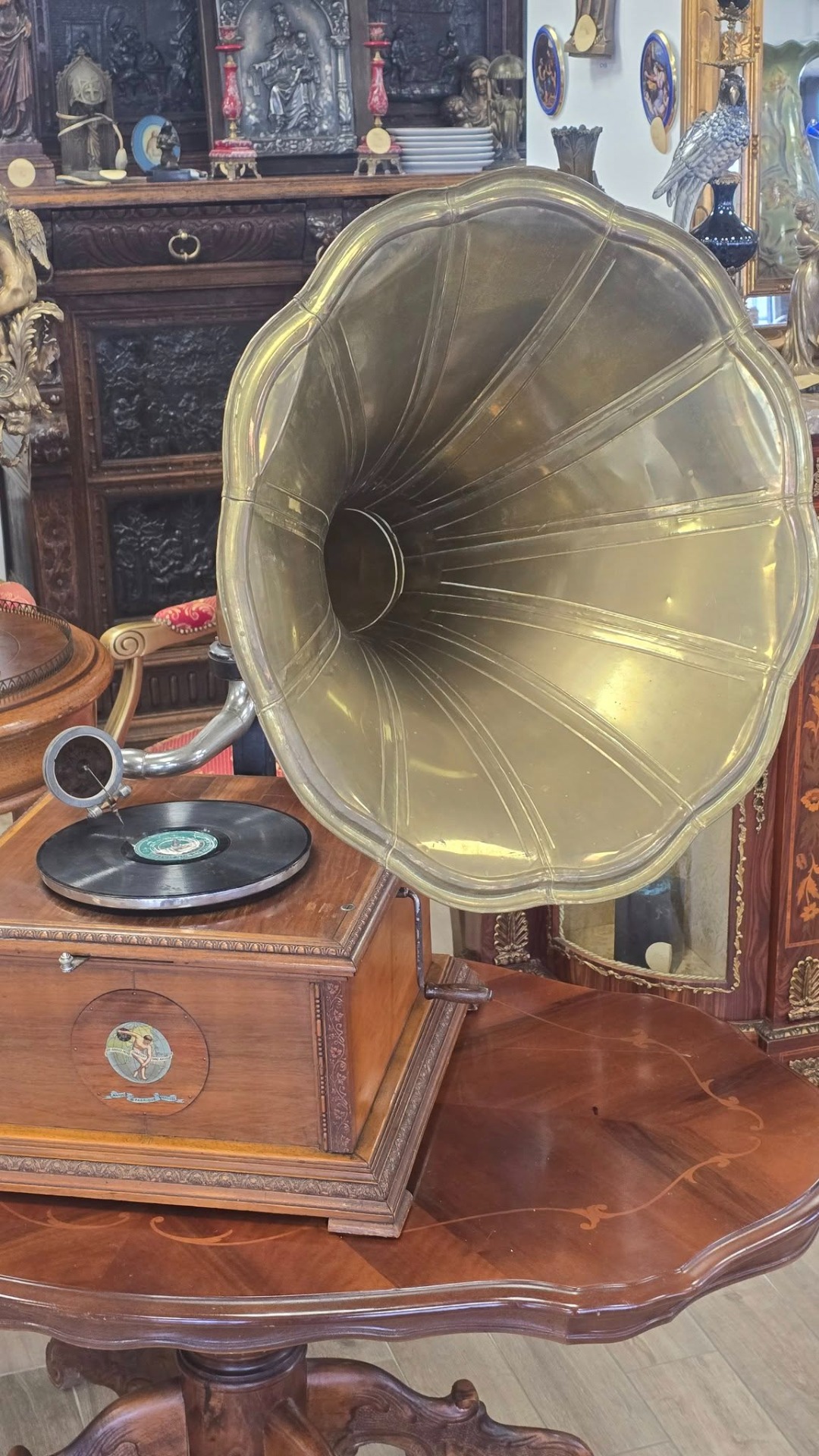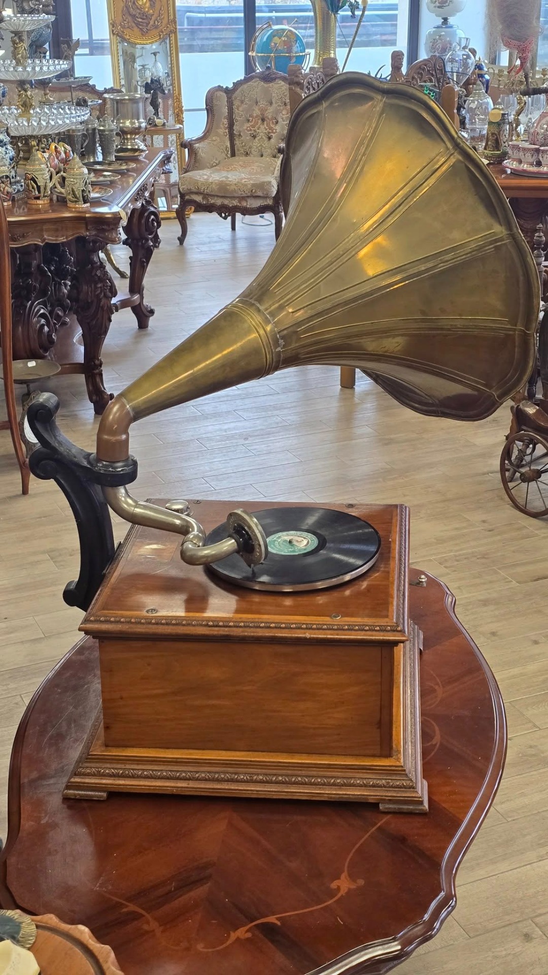 Époque (începutul sec. XX), aparat autentic păstrat într-o stare de conservare remarcabilă, cu doză "Reproducteur Pathé Concert", modelul de vârf al epocii, cu diafragmă mare, capabil să redea un sunet puternic și clar, cu ac cu prindere pe filet (foarte rar) și pâlnie tip "Morning Glory" din alamă masivă lustruită, care oferă o rezonanță caldă și un aspect vizual spectaculos. Carcasa este din lemn, cu logo-ul original "Pathé - Chantent Sans Aiguille" intact și cu culori vii, un detaliu rar la aparatele de peste 100 de ani.