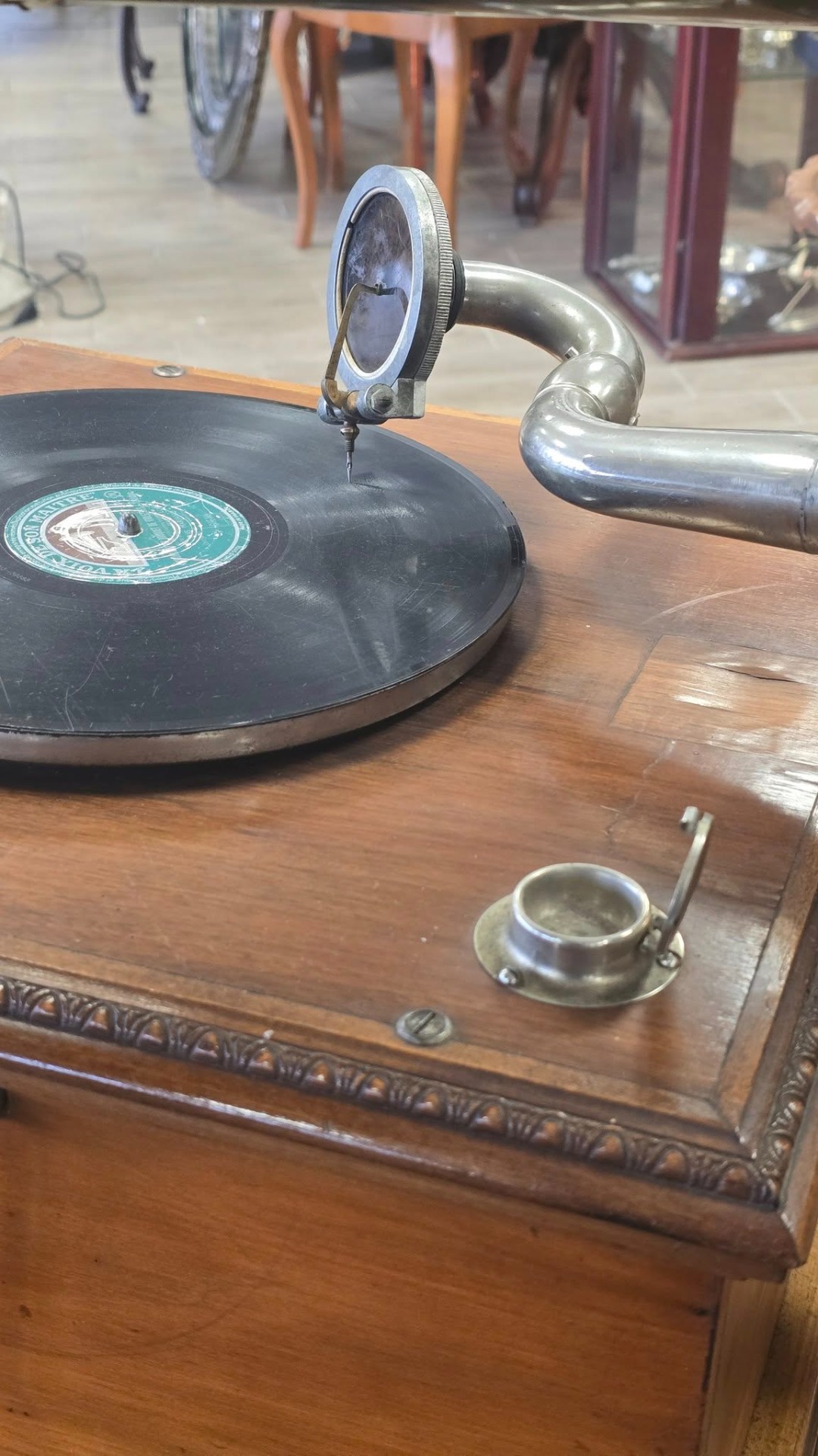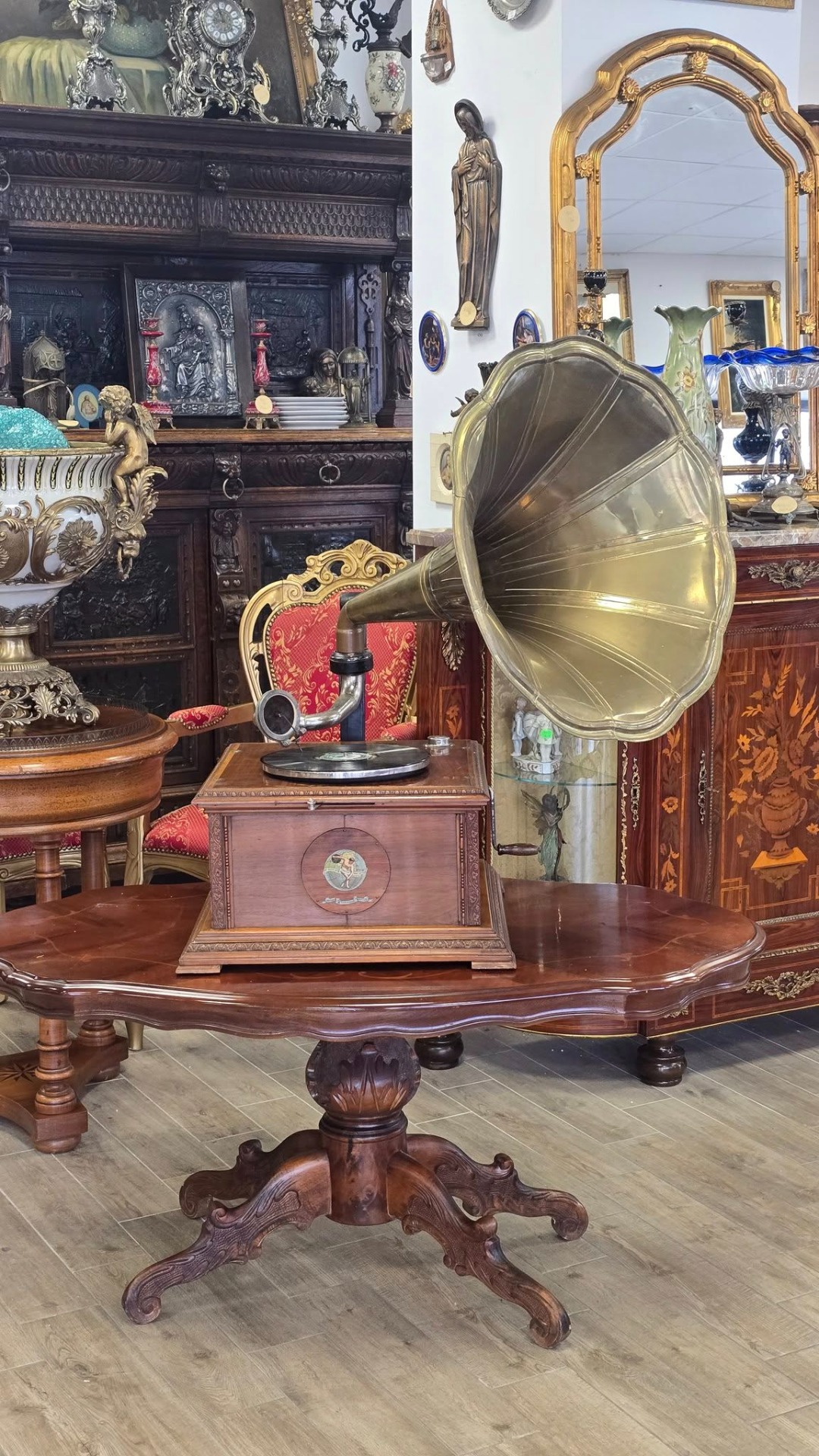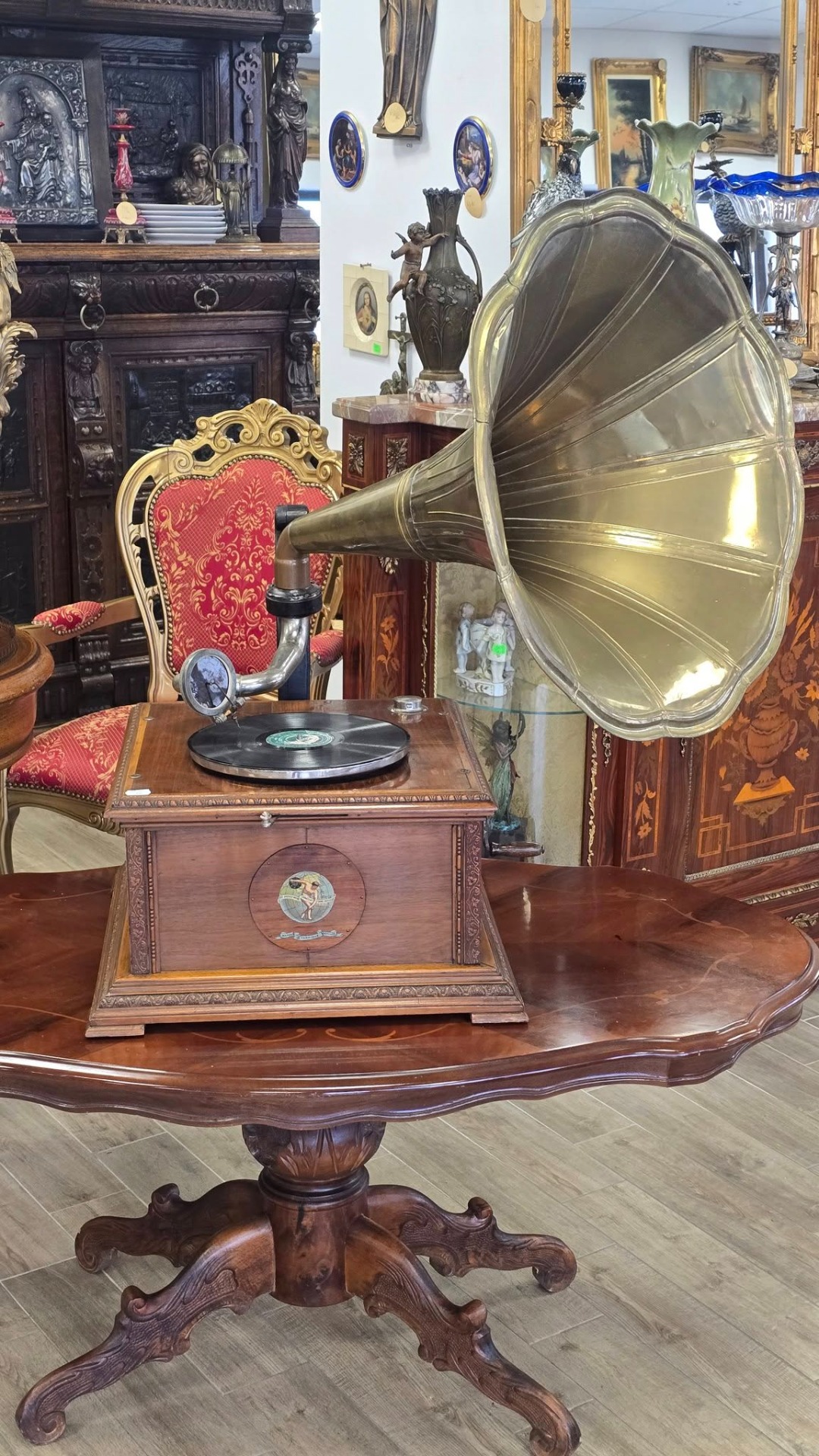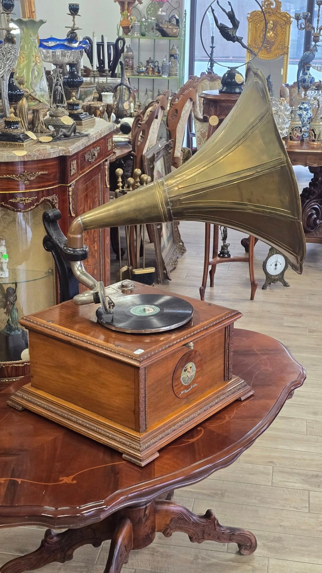 Époque (începutul sec. XX), aparat autentic păstrat într-o stare de conservare remarcabilă, cu doză "Reproducteur Pathé Concert", modelul de vârf al epocii, cu diafragmă mare, capabil să redea un sunet puternic și clar, cu ac cu prindere pe filet (foarte rar) și pâlnie tip "Morning Glory" din alamă masivă lustruită, care oferă o rezonanță caldă și un aspect vizual spectaculos. Carcasa este din lemn, cu logo-ul original "Pathé - Chantent Sans Aiguille" intact și cu culori vii, un detaliu rar la aparatele de peste 100 de ani.