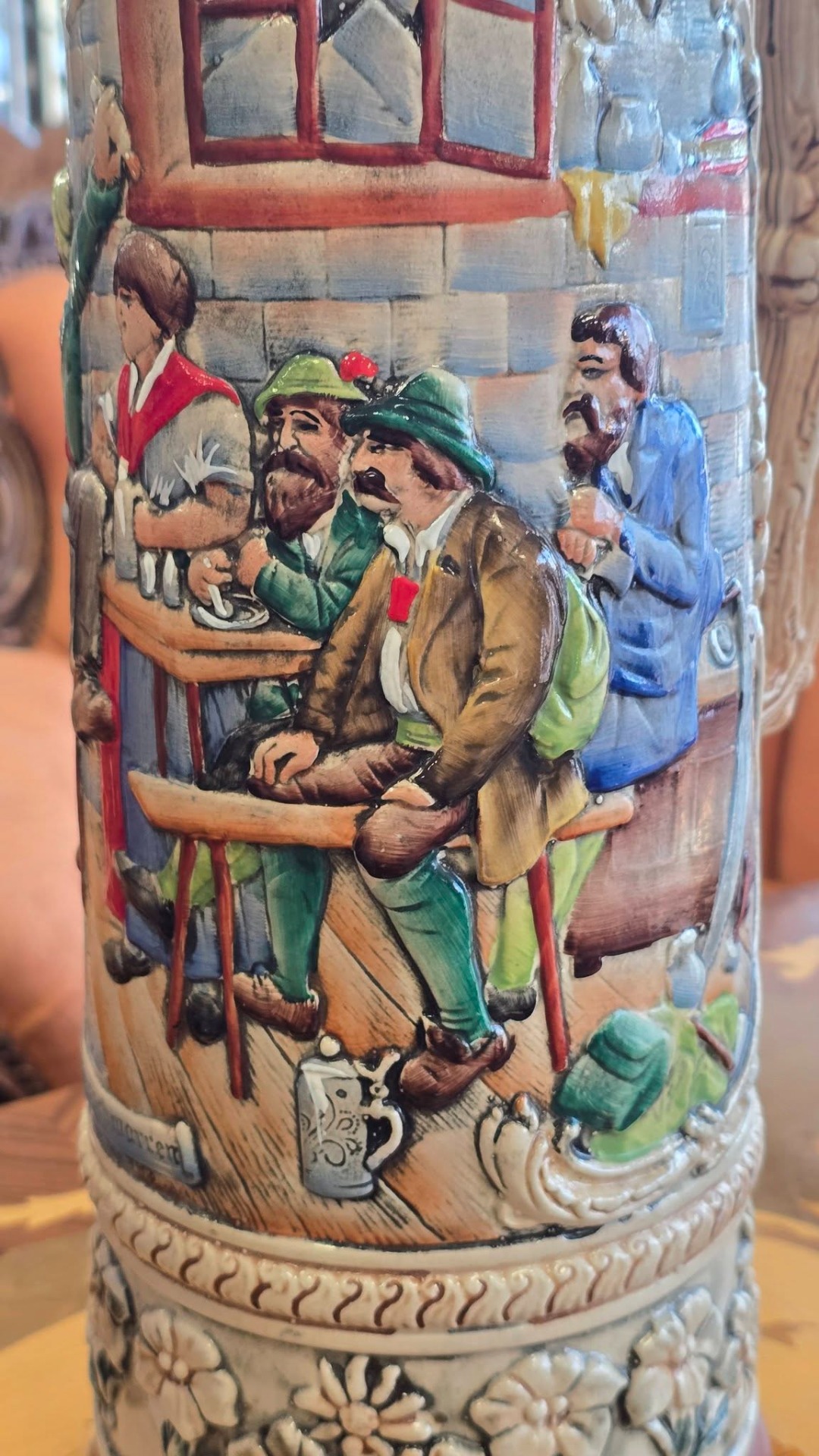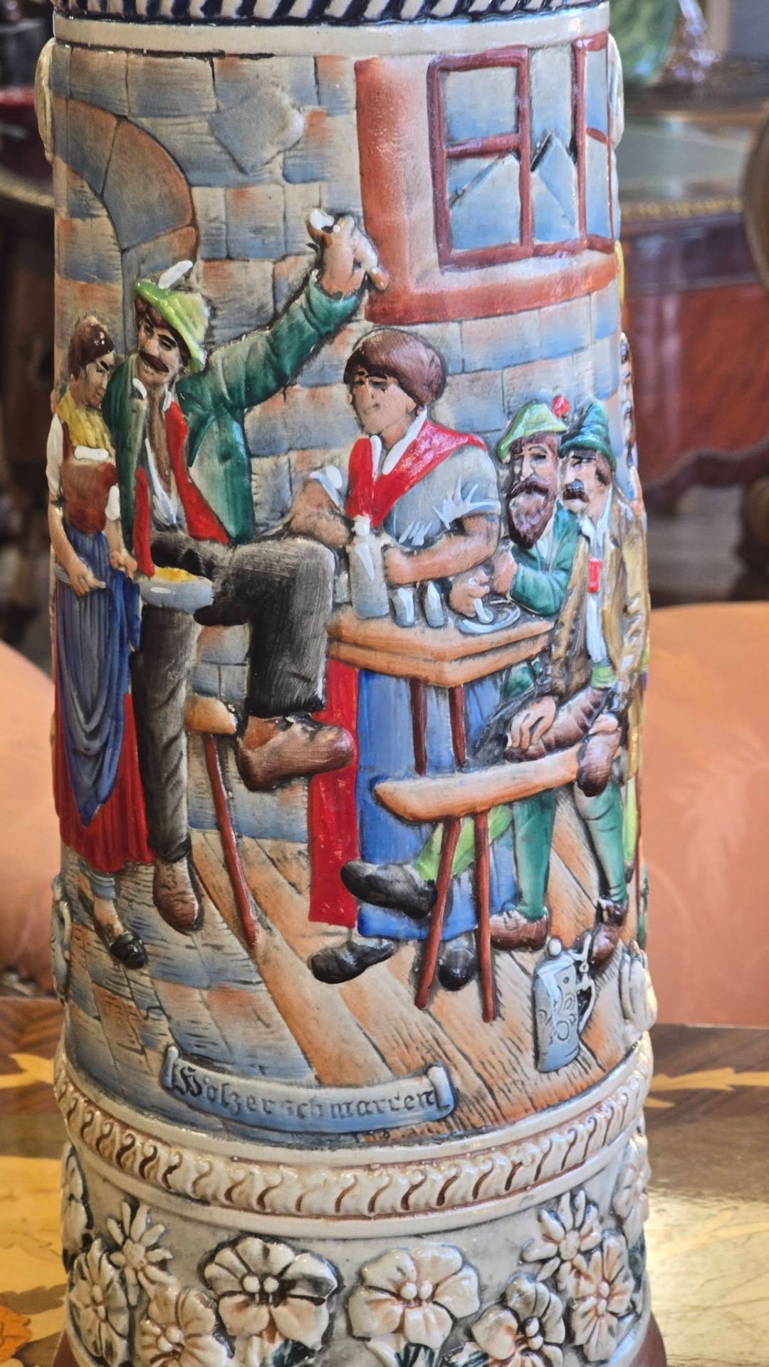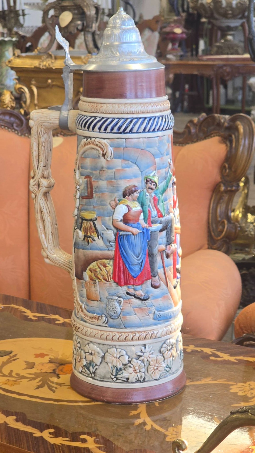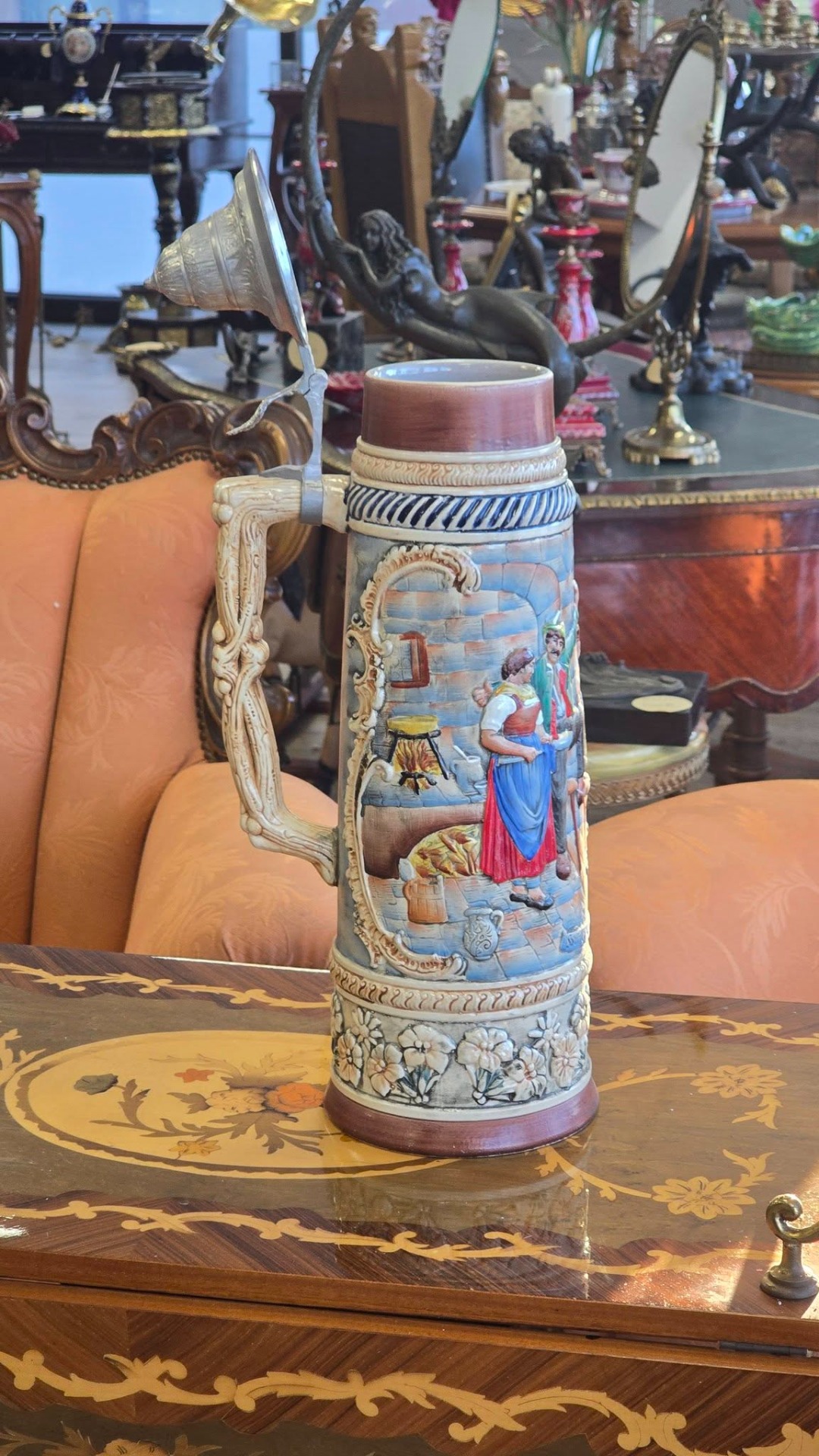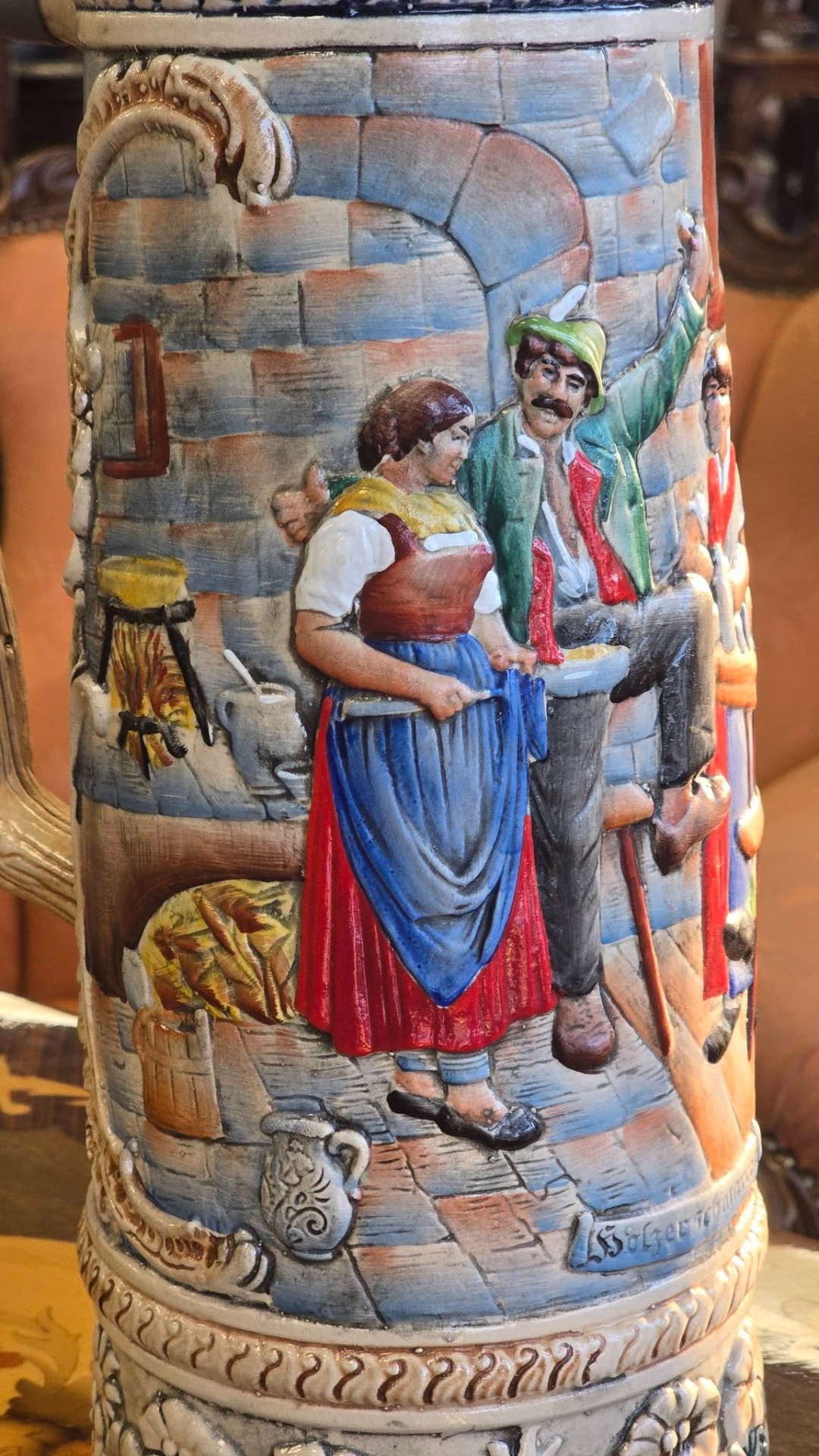 Halbă de bere (Stein) germană, din ceramică cu capac metalic, realizată în relief, exemplu clasic al meșteșugului german de fabricare a Stein-urilor, adesea