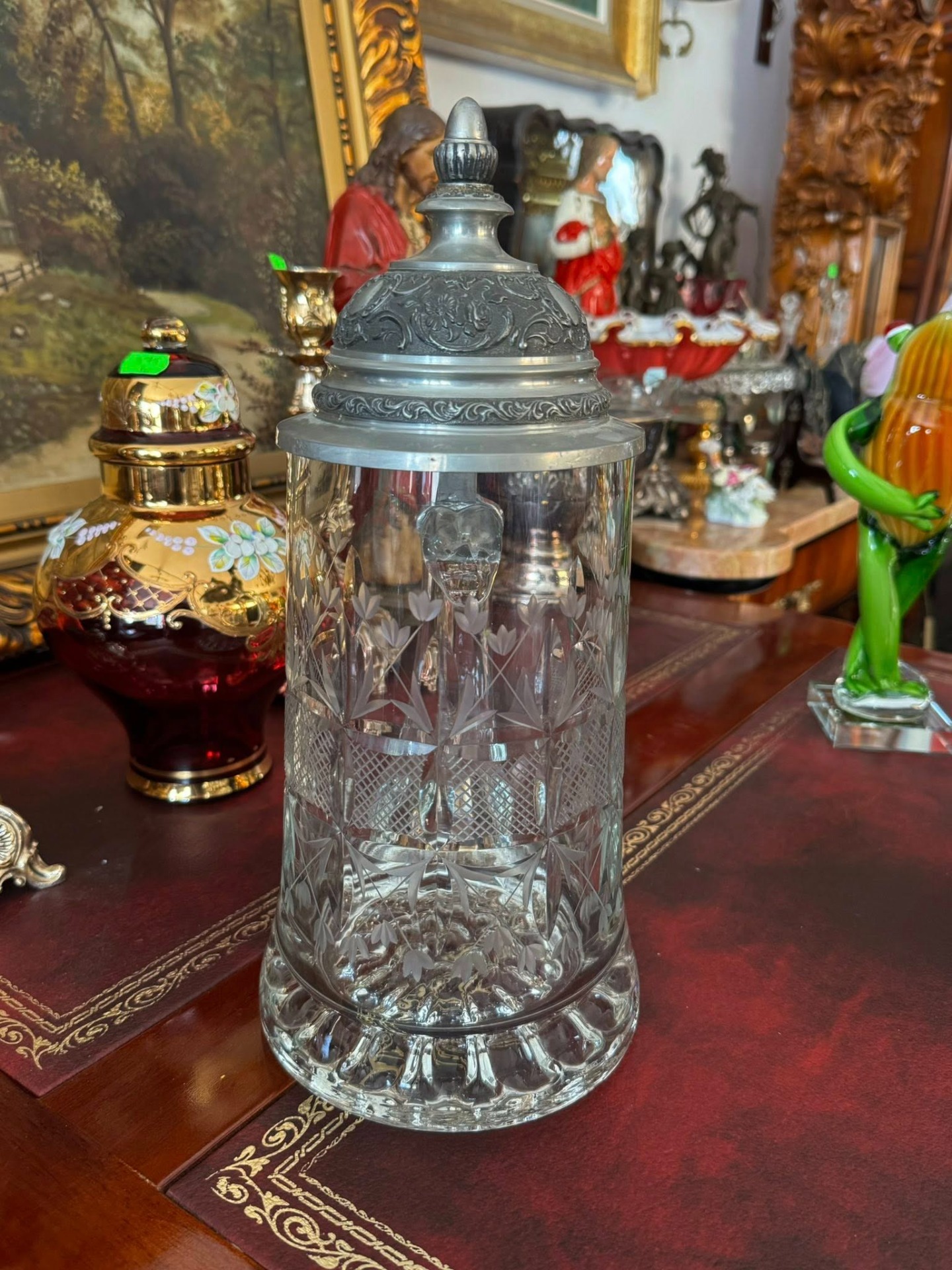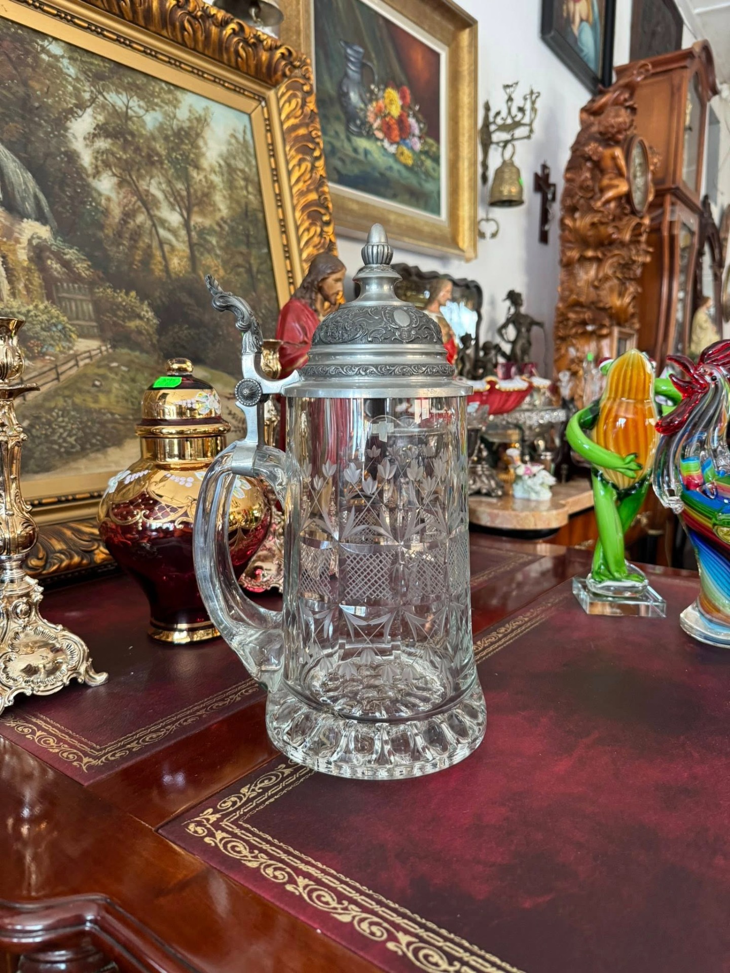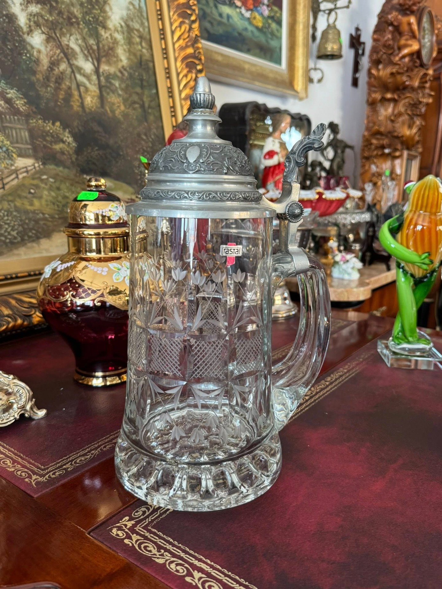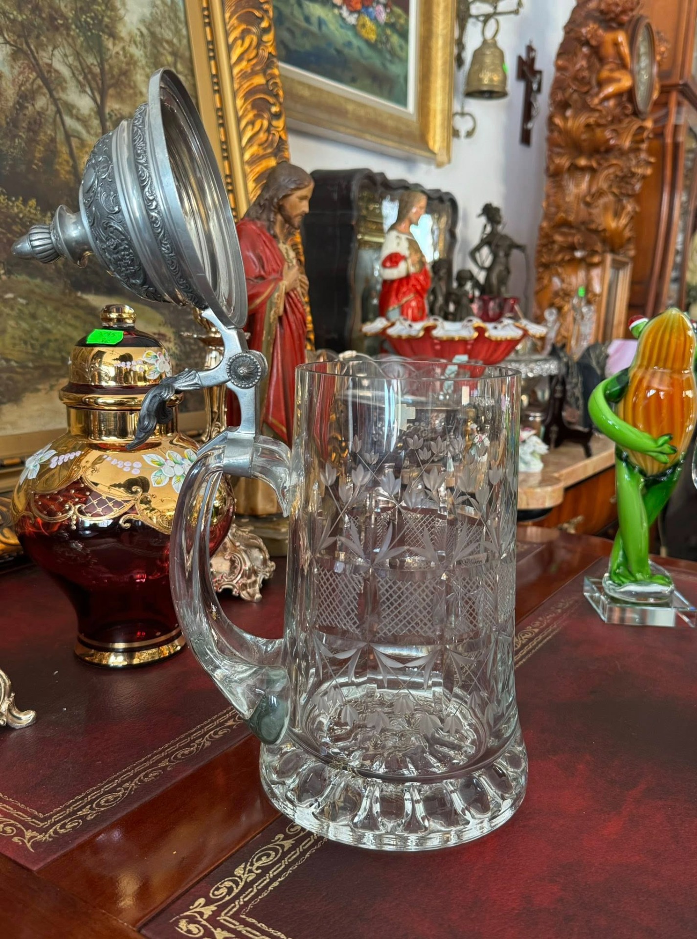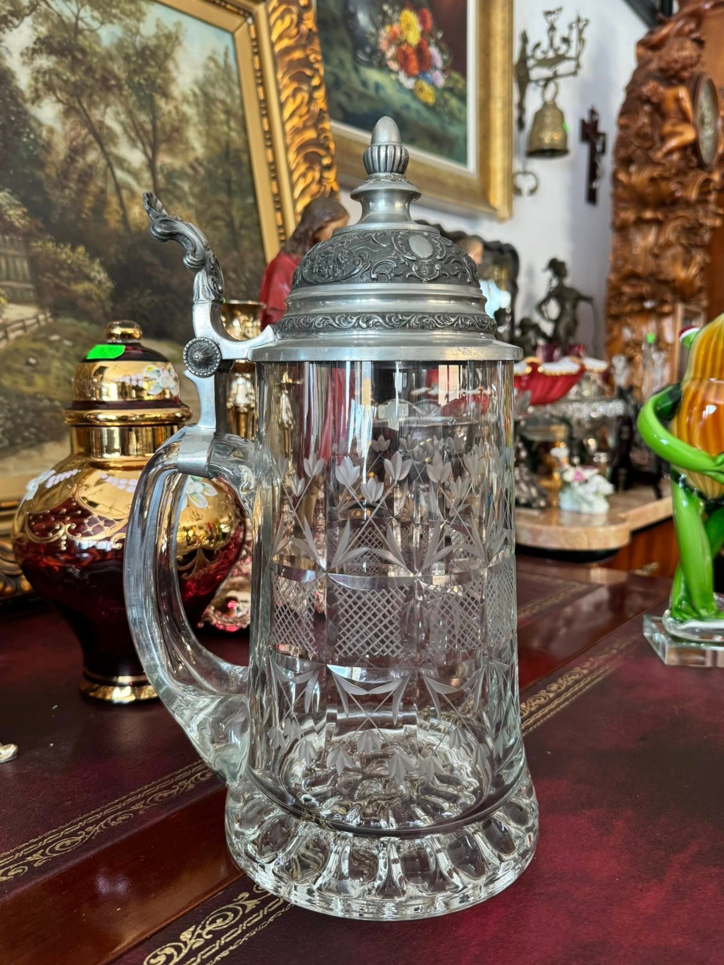 Halbă de bere tradițională (Bierkrug), de proveniență germană, care îmbină eleganța sticlei gravate cu robustețea capacului din cositor. (cca 1960)