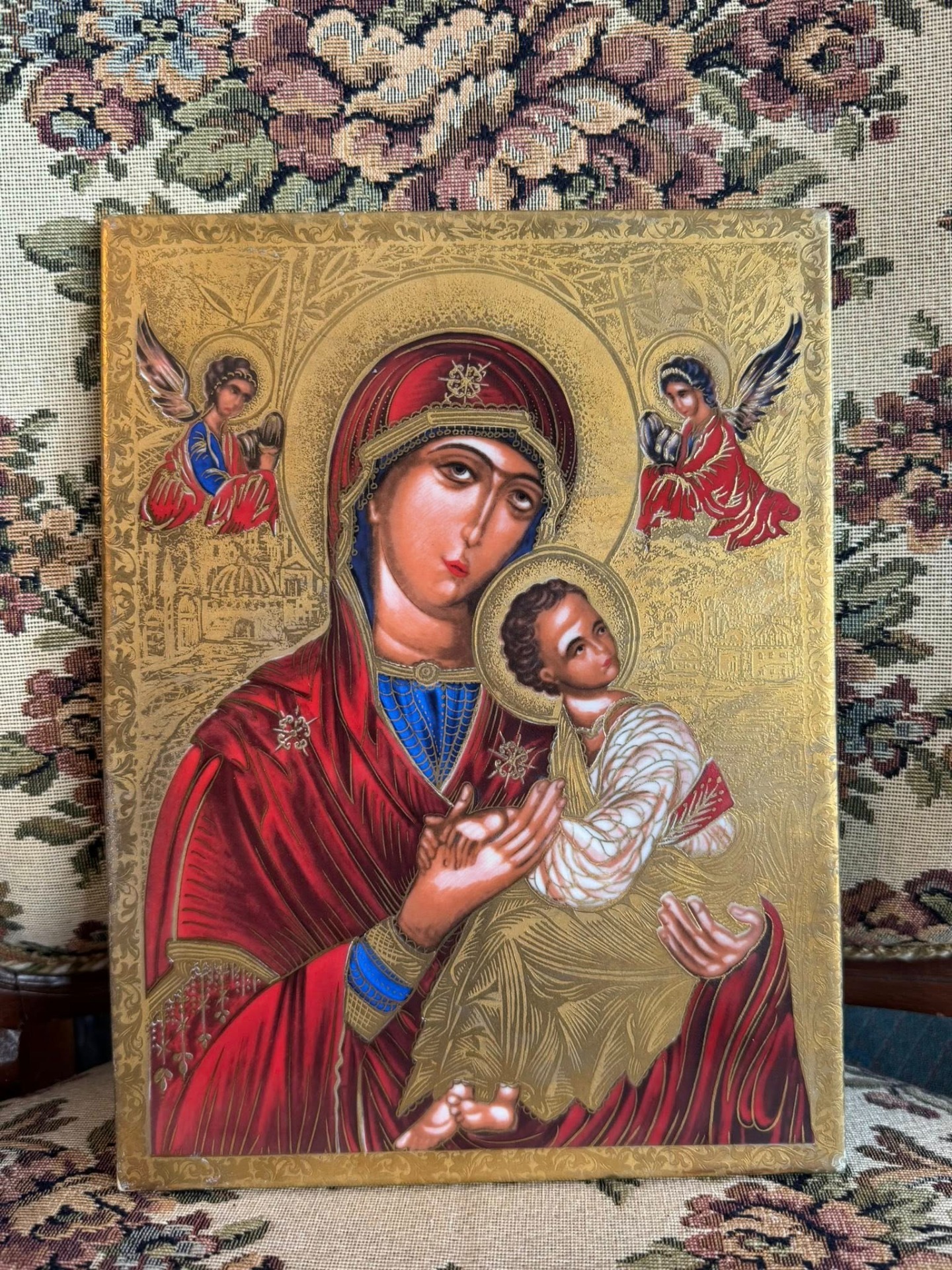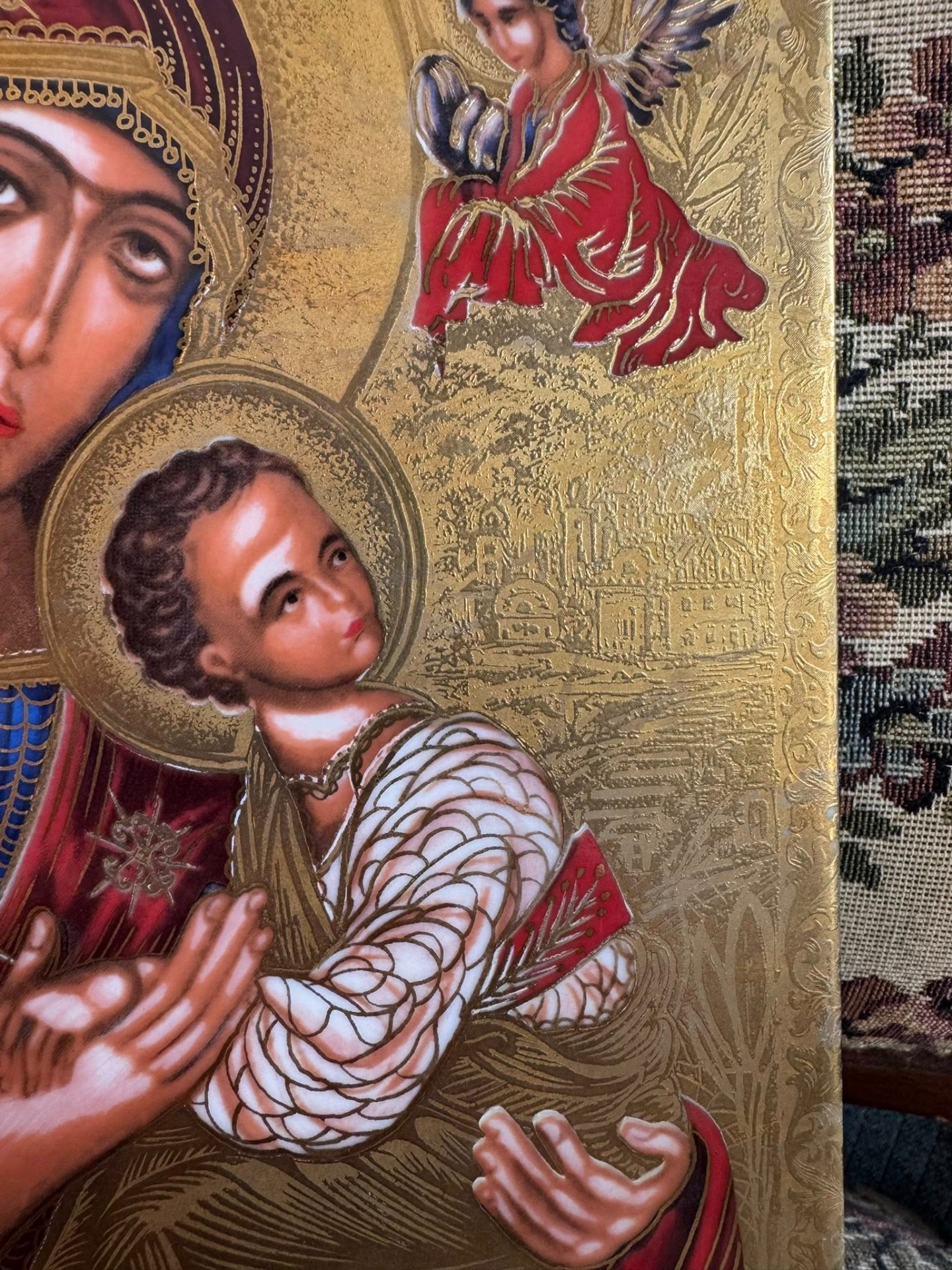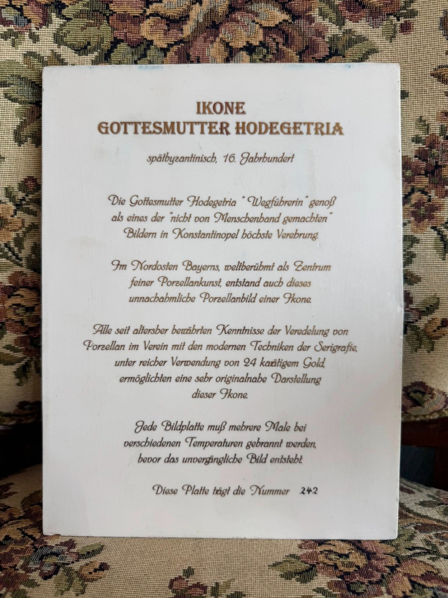 Icoană bizantină din pe placă de porțelan. A fost realizată în nord-estul Bavariei, folosind tehnici avansate de serigrafie și aur de 24 de carate.