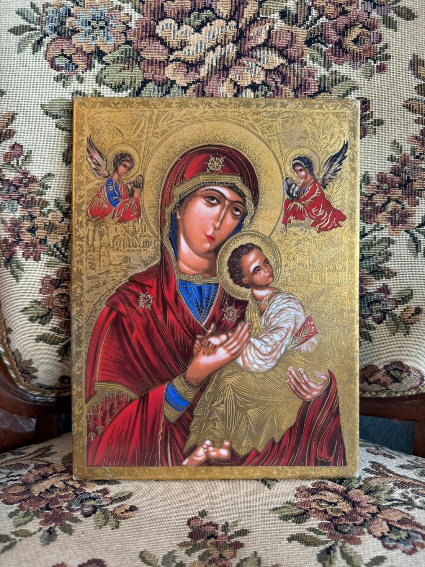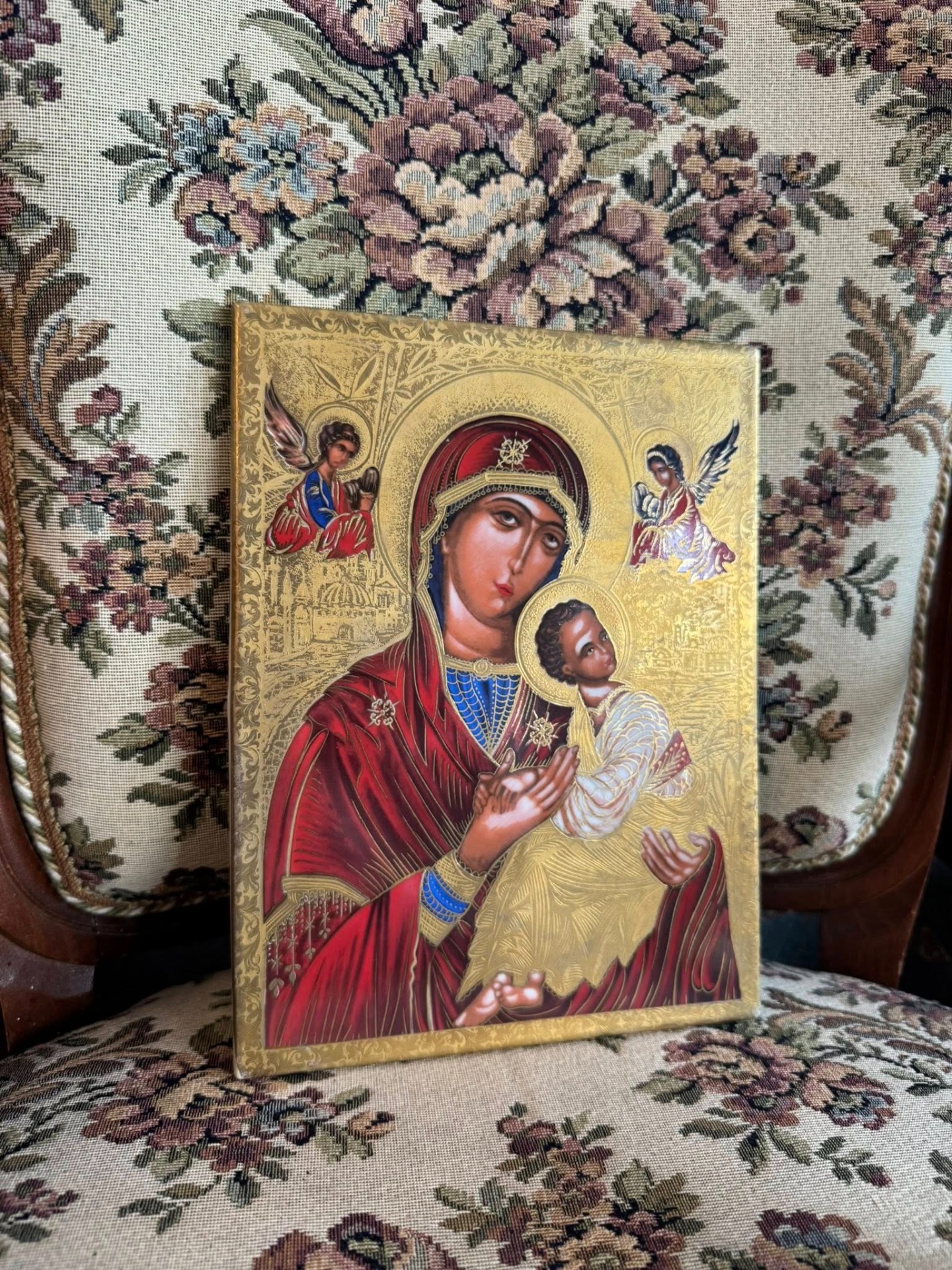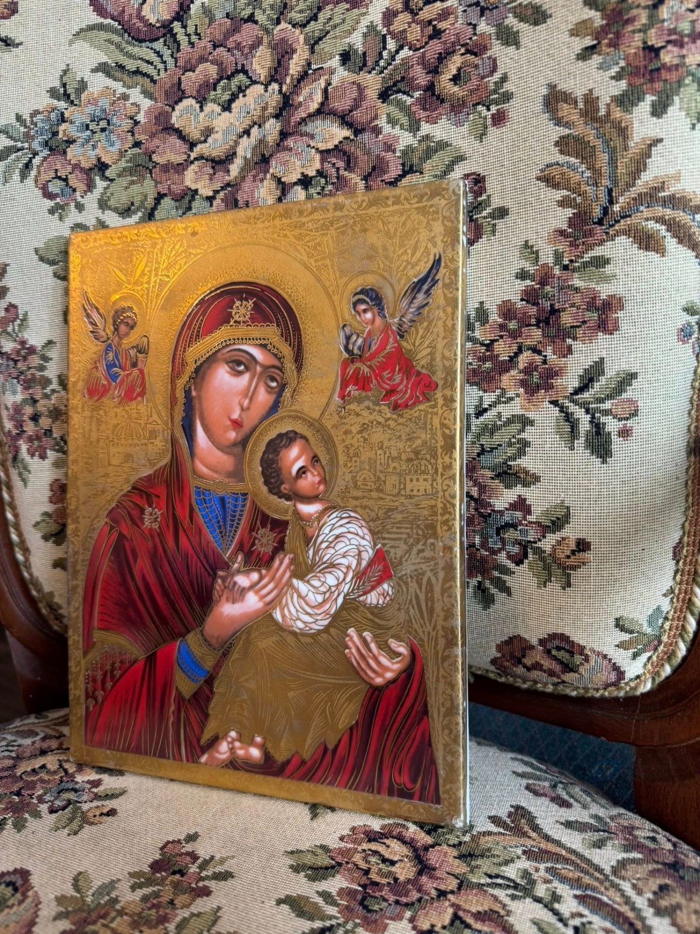 Icoană bizantină din pe placă de porțelan. A fost realizată în nord-estul Bavariei, folosind tehnici avansate de serigrafie și aur de 24 de carate.