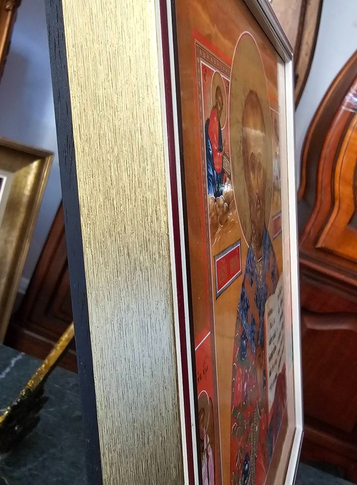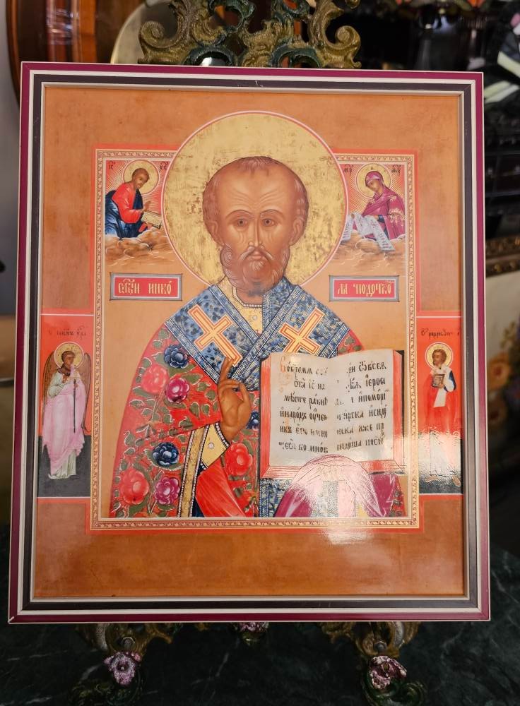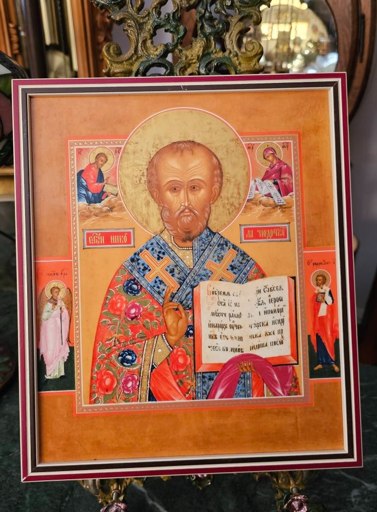 Confecționată cu atenție deosebită, icoană redă în detaliu imaginea Sfântului Nicolae, episcopul din Lykia, venerat pentru bunătatea și credința sa. Inscripțiile sunt în limba slavonă, iar designul urmează stilul tradițional bizantin, cu detalii aurii și culori vii.