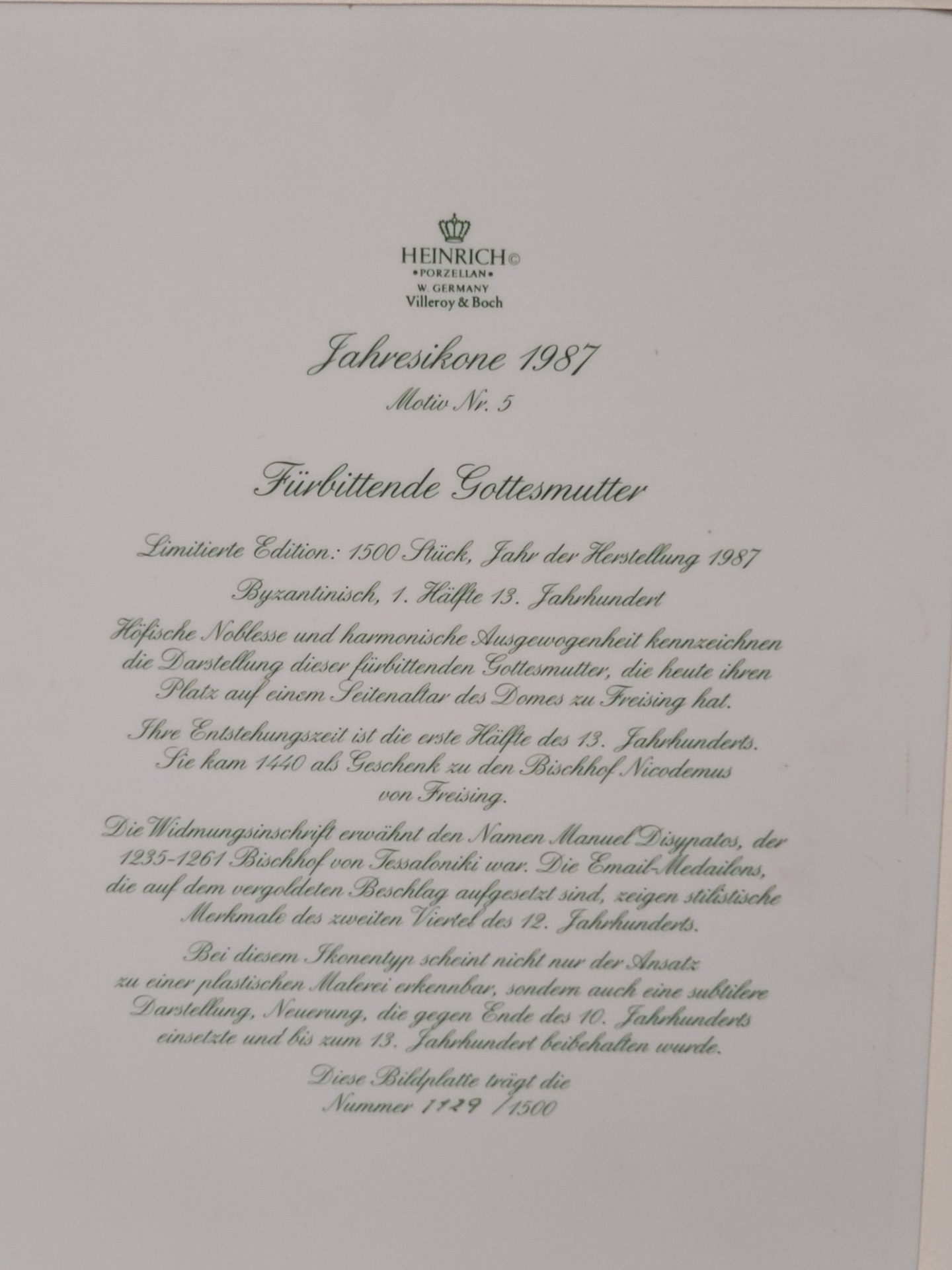 Icoană "Făcătoarea de Minuni a Maicii Domnului", pe porțelan - Ediție Limitată Heinrich, Villeroy & Boch (1987).