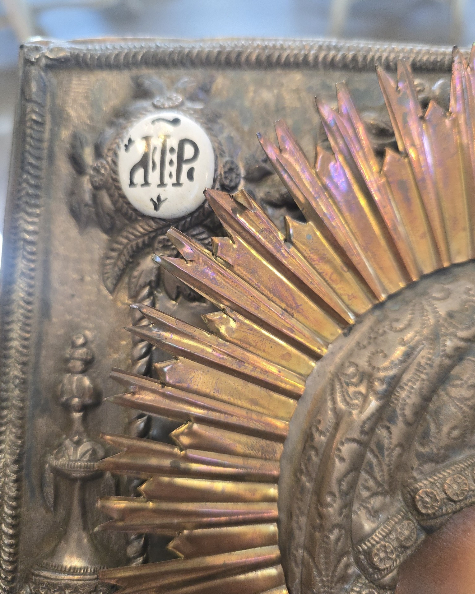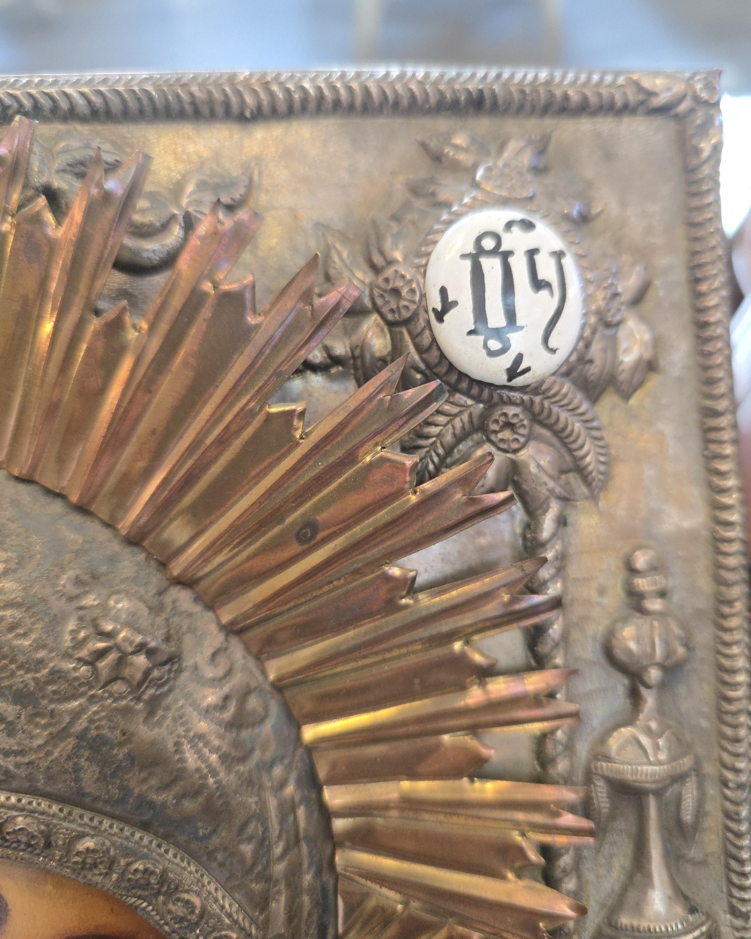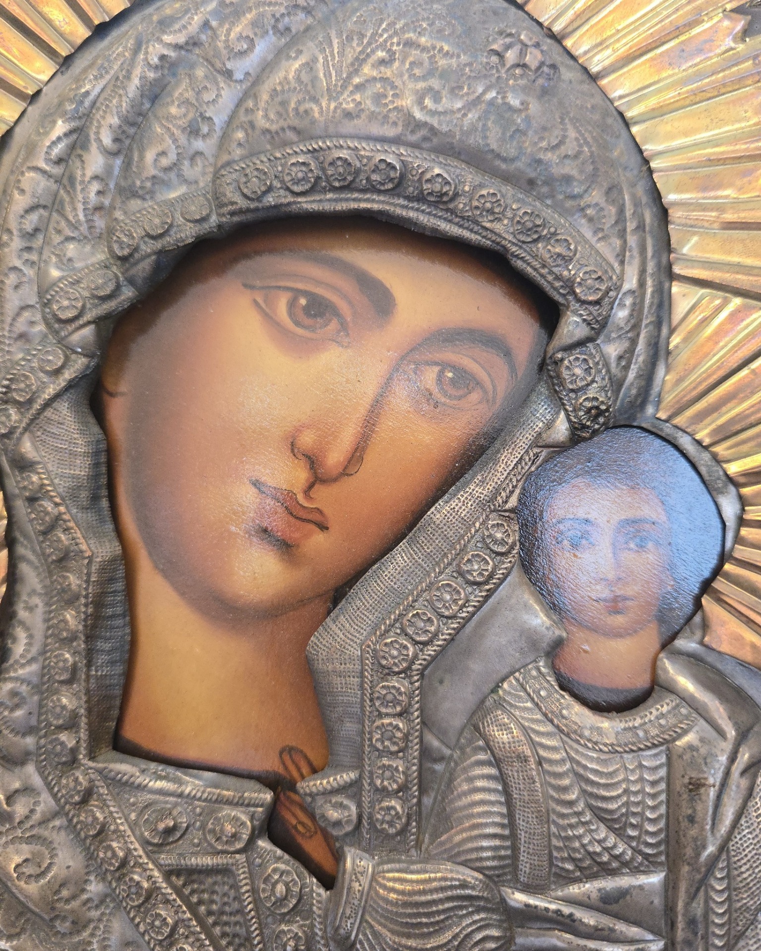 o piesă de artă religioasă deosebită, realizată de celebrul atelier polonez Stopwar, ce se remarcă prin oclazul metalic minuțios lucrat cu motive florale și un nimb radiant spectaculos, totul fiind finisat cu o patină antichizată ce oferă obiectului o prezență nobilă și atemporală, ideală pentru a deveni punctul central al unui colț de rugăciune sau un cadou de suflet cu o estetică rafinată.