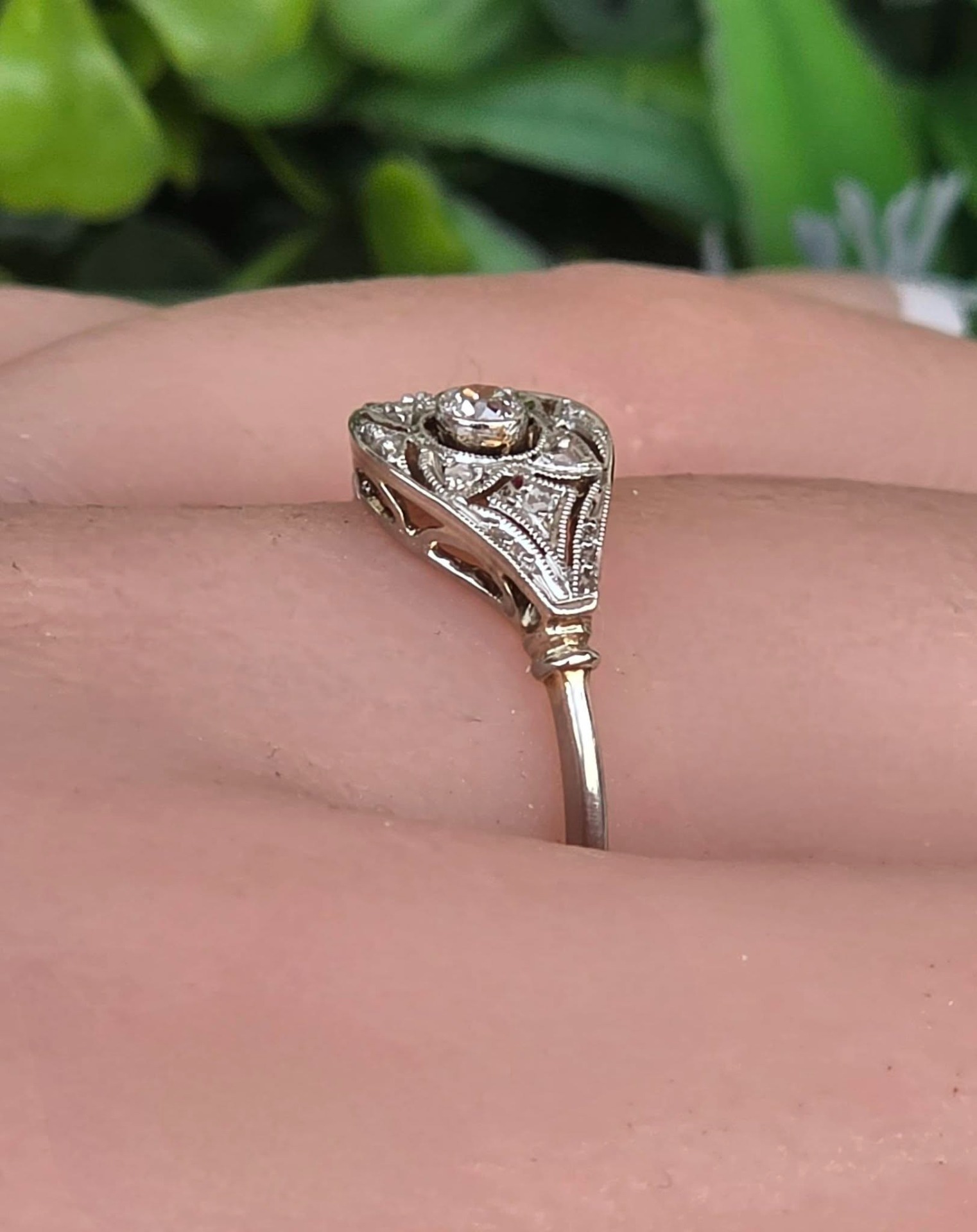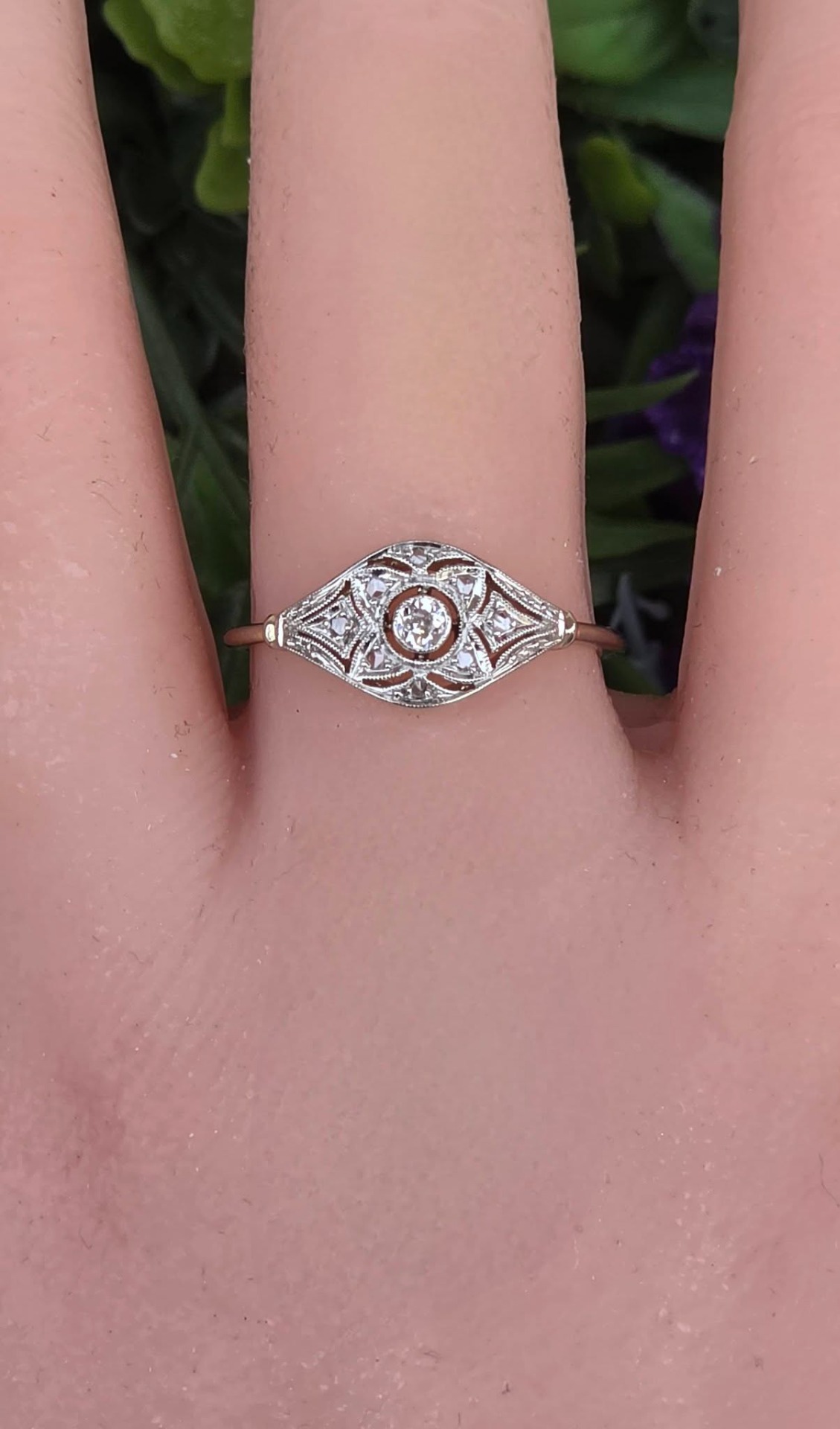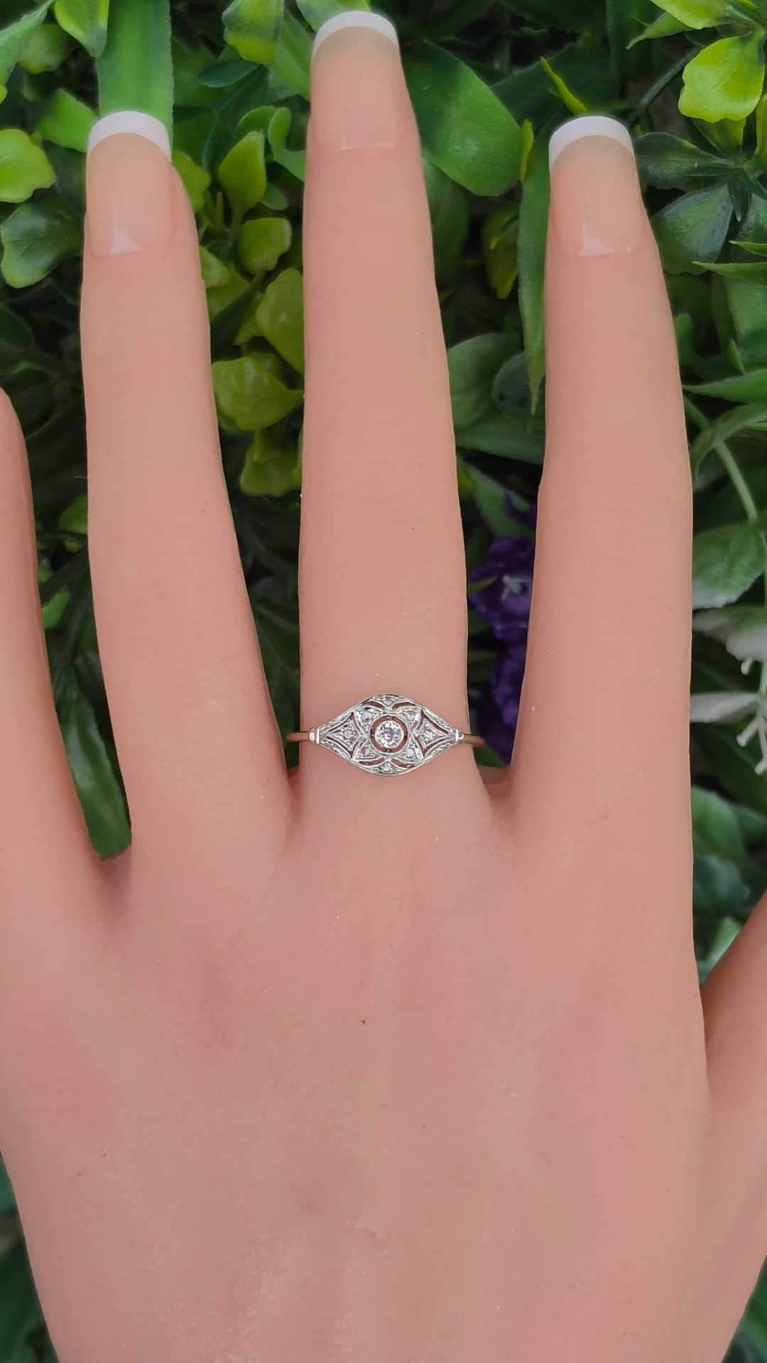 Inel Art Deco autentic, de colecție, din aur de 18K și platină, cu 9 diamante naturale, unul central "Old European cut" și 8 diamante de accent "rose-cut", design de tip "navette" cu decupaje filigranate și detalii de tip "milgrain" (anii 1920-1930, Marsilia, Franța).