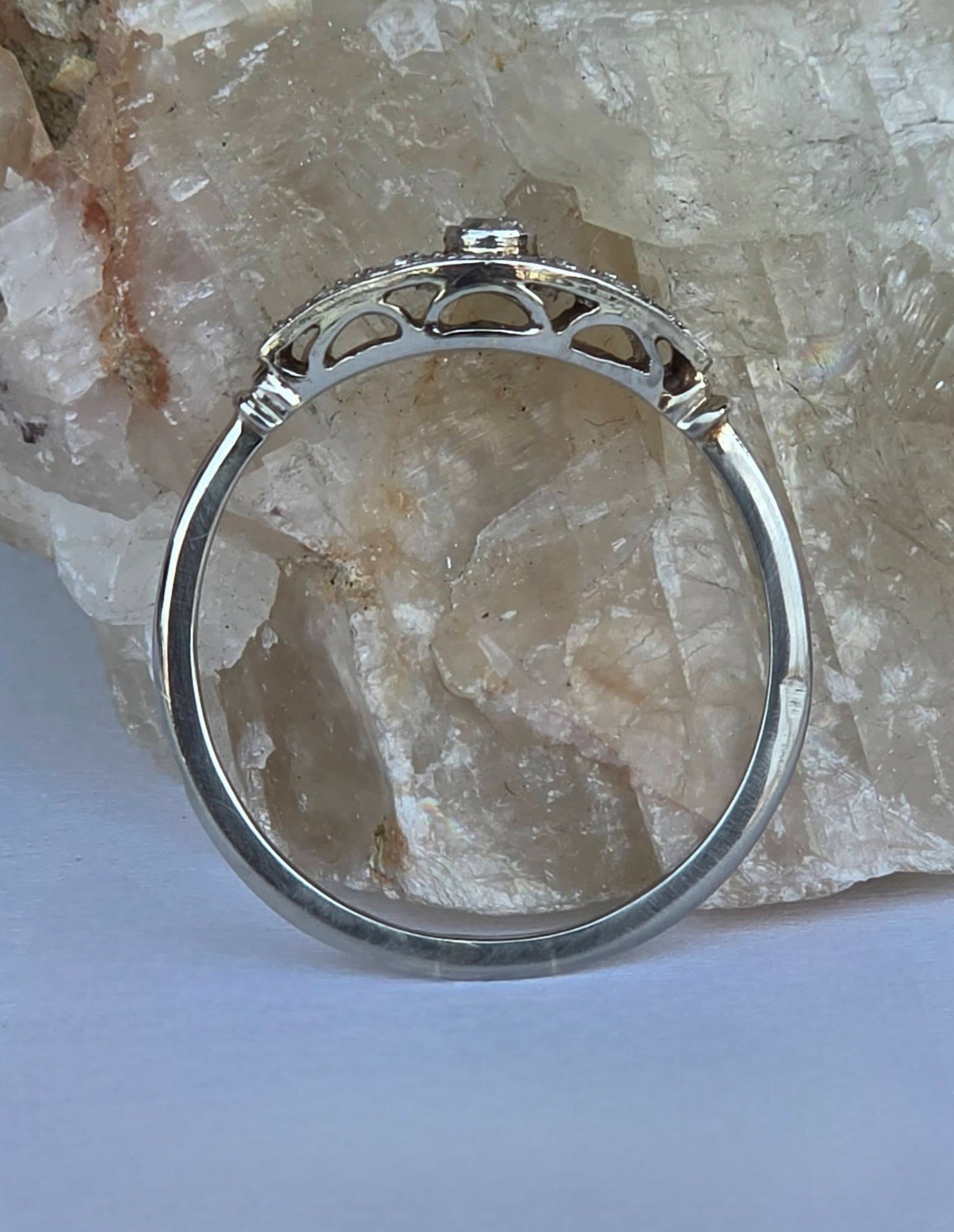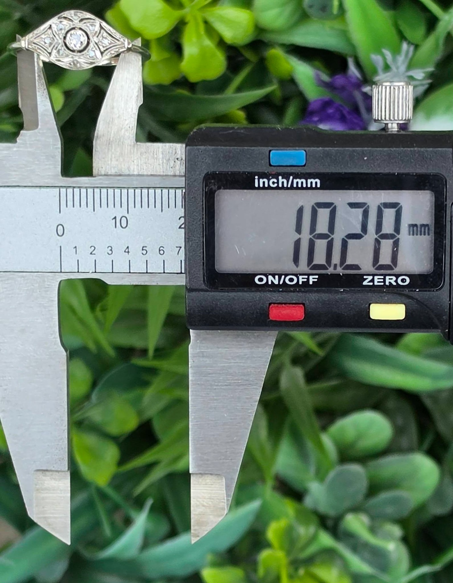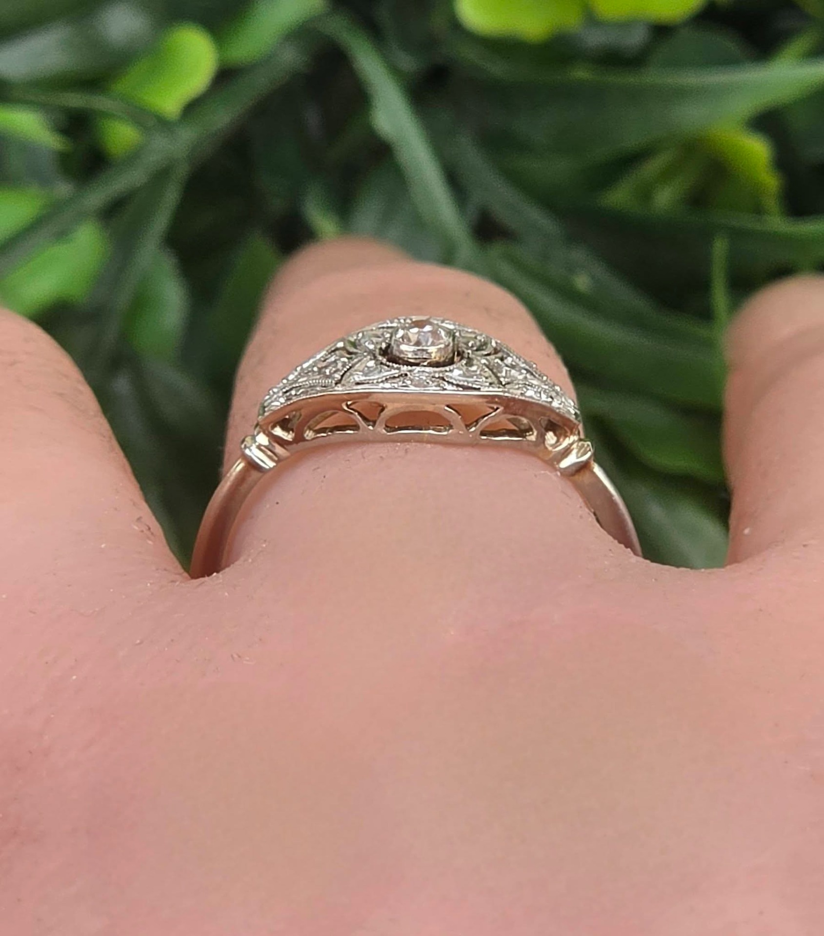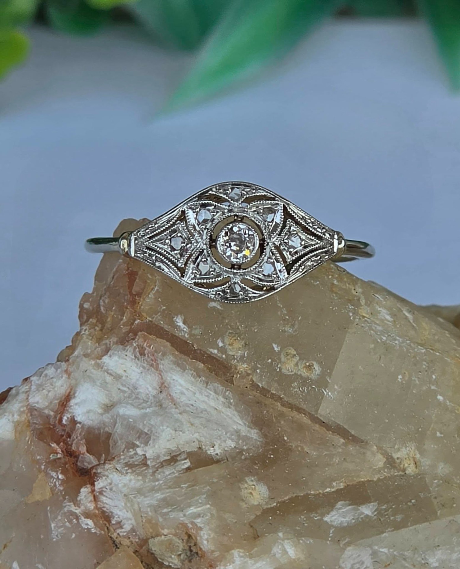 Inel Art Deco autentic, de colecție, din aur de 18K și platină, cu 9 diamante naturale, unul central "Old European cut" și 8 diamante de accent "rose-cut", design de tip "navette" cu decupaje filigranate și detalii de tip "milgrain" (anii 1920-1930, Marsilia, Franța).