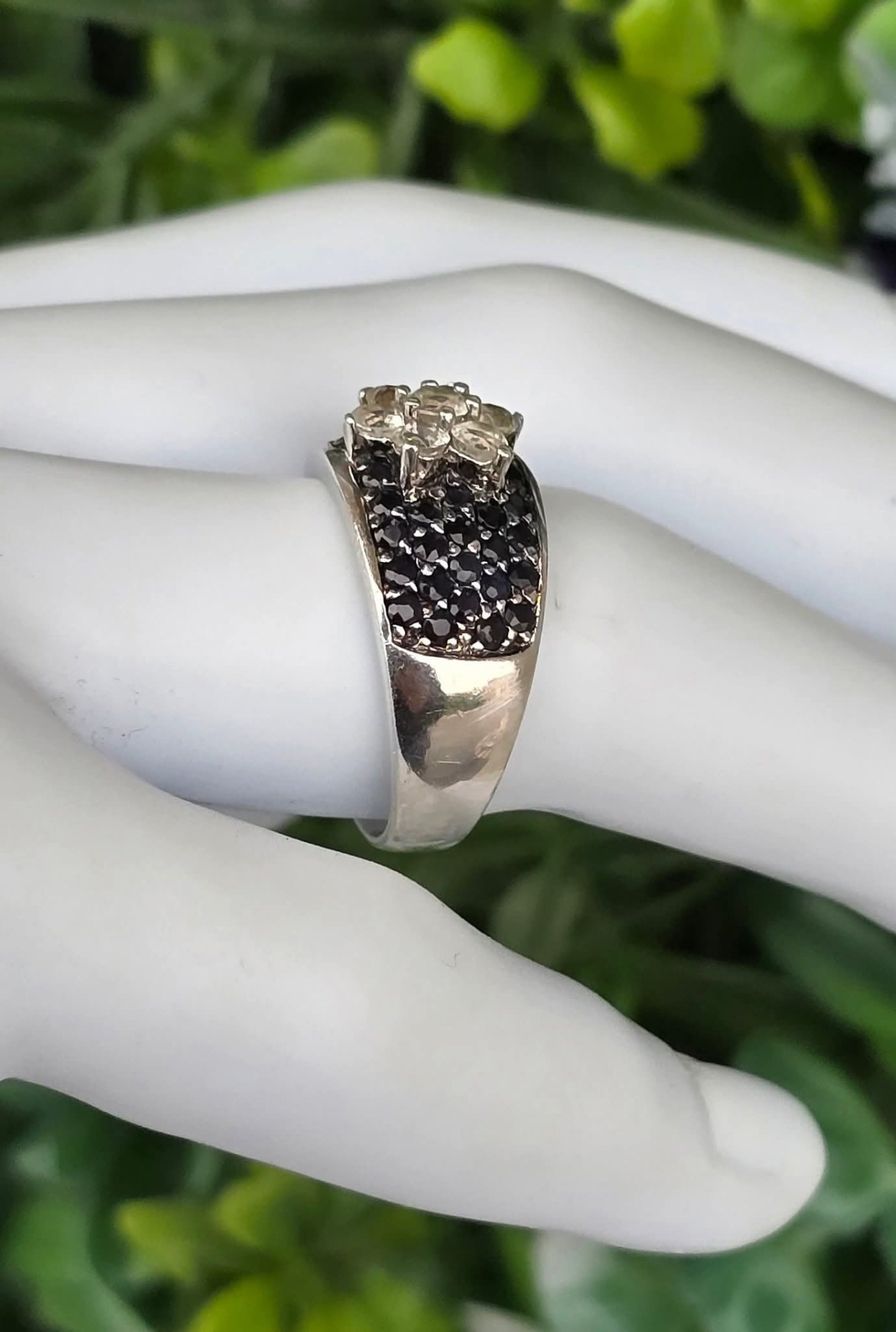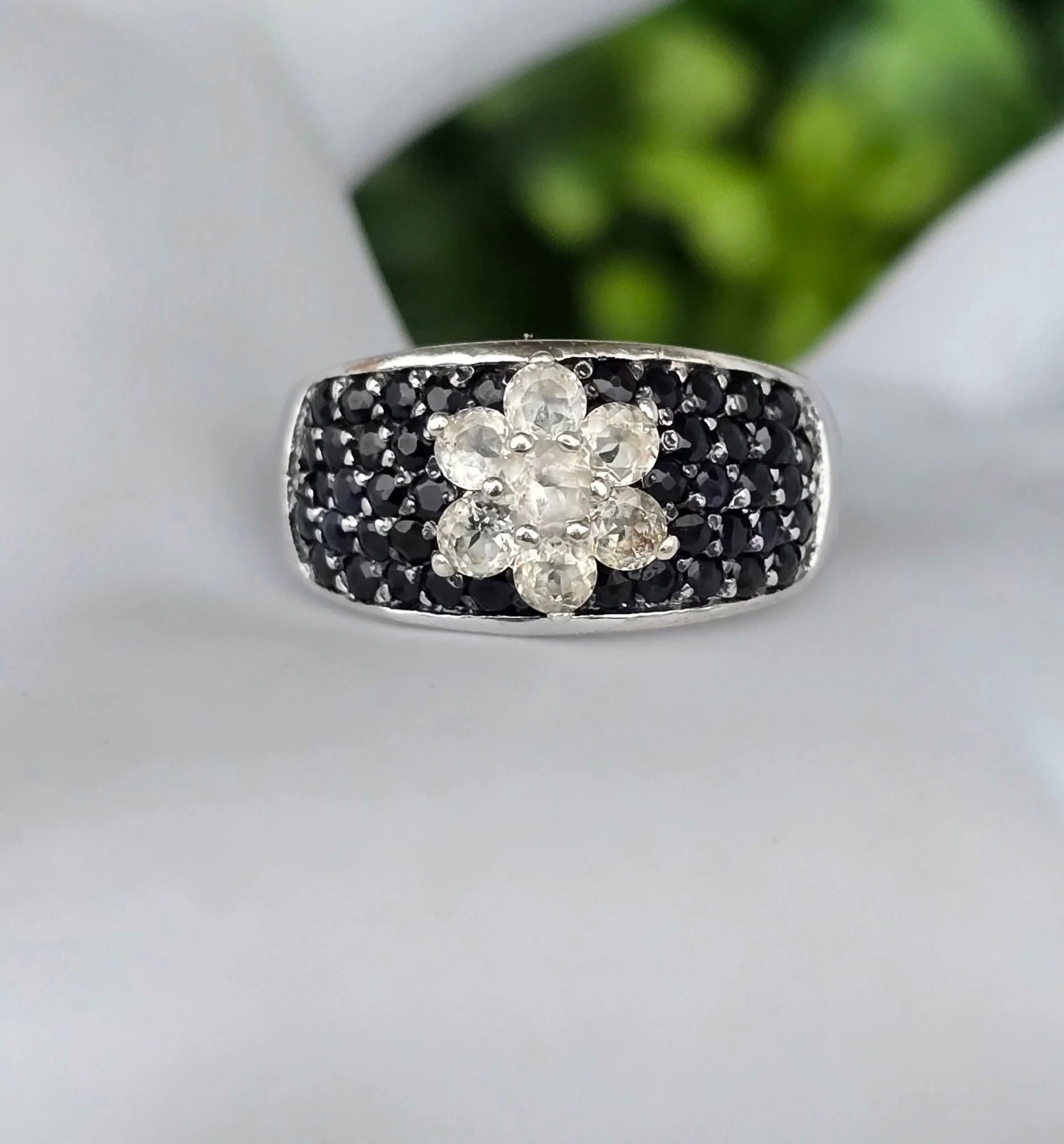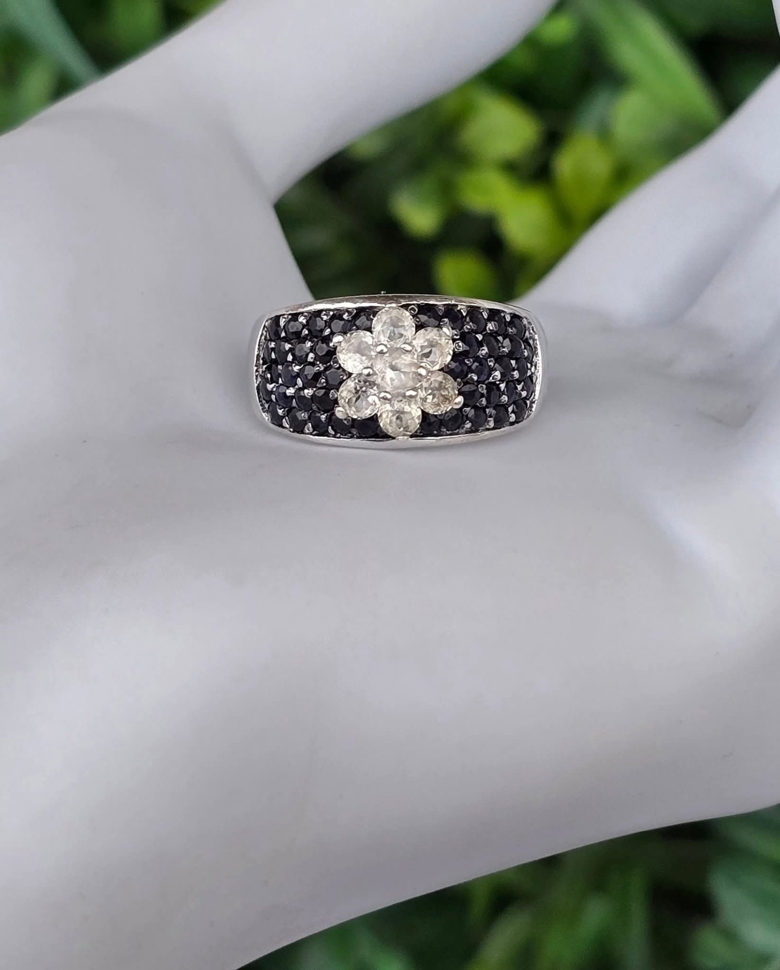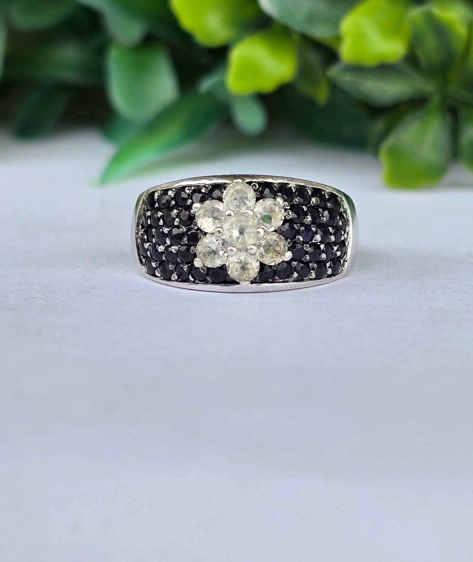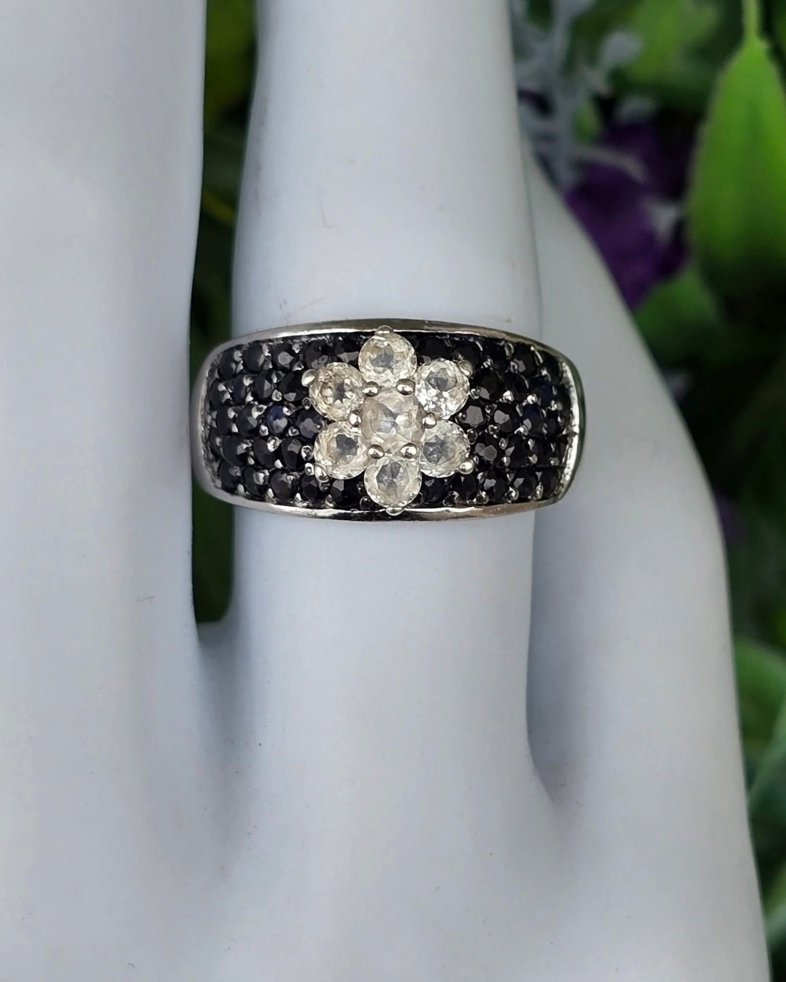 Inel "cocktail" vechi, din argint, cu 7 topaze albe și "pavé" din 44 safire "dark-blue" naturale.
