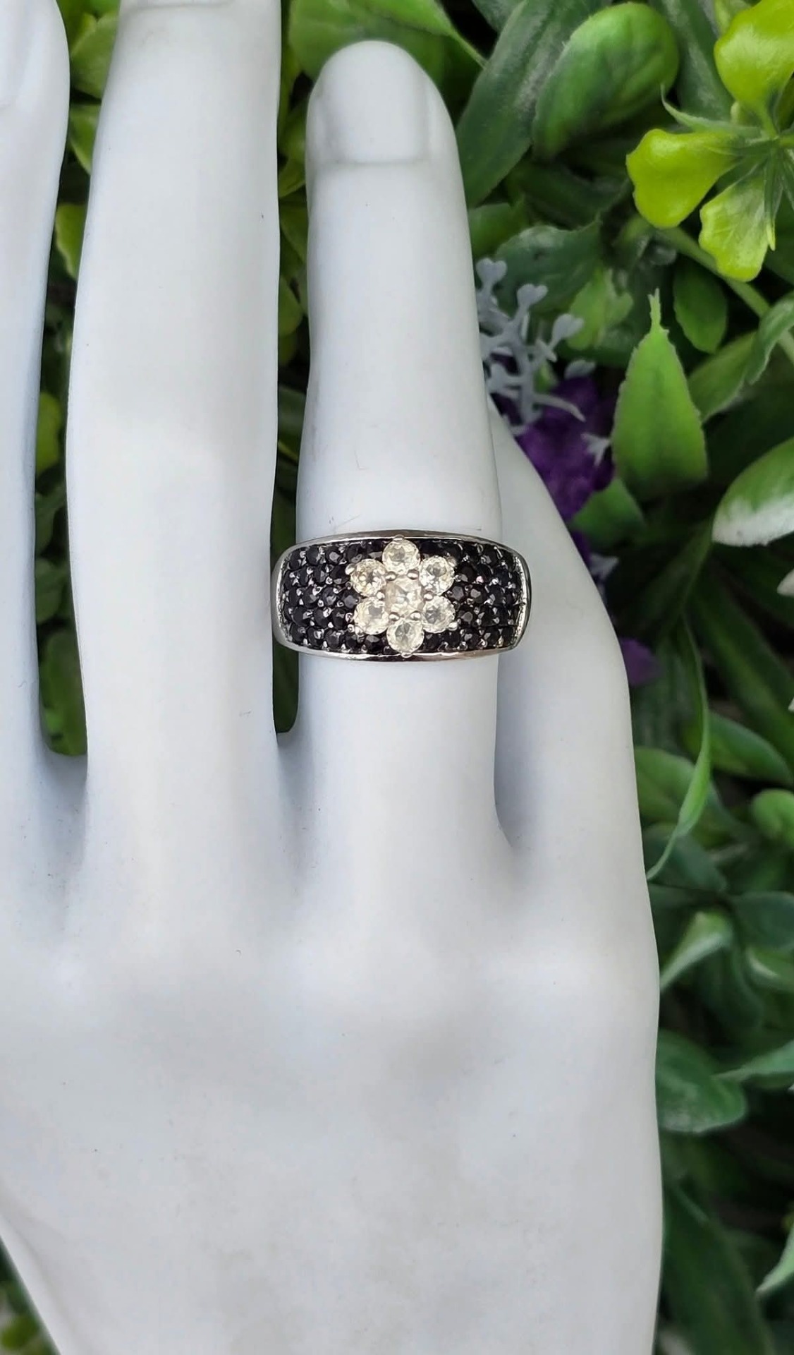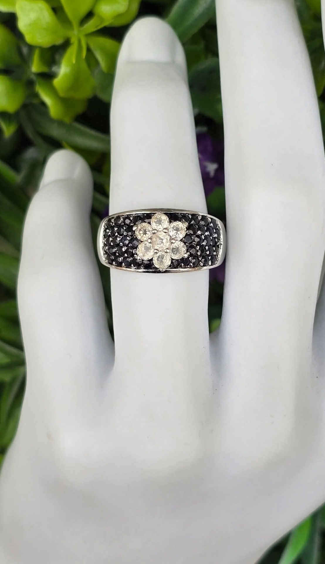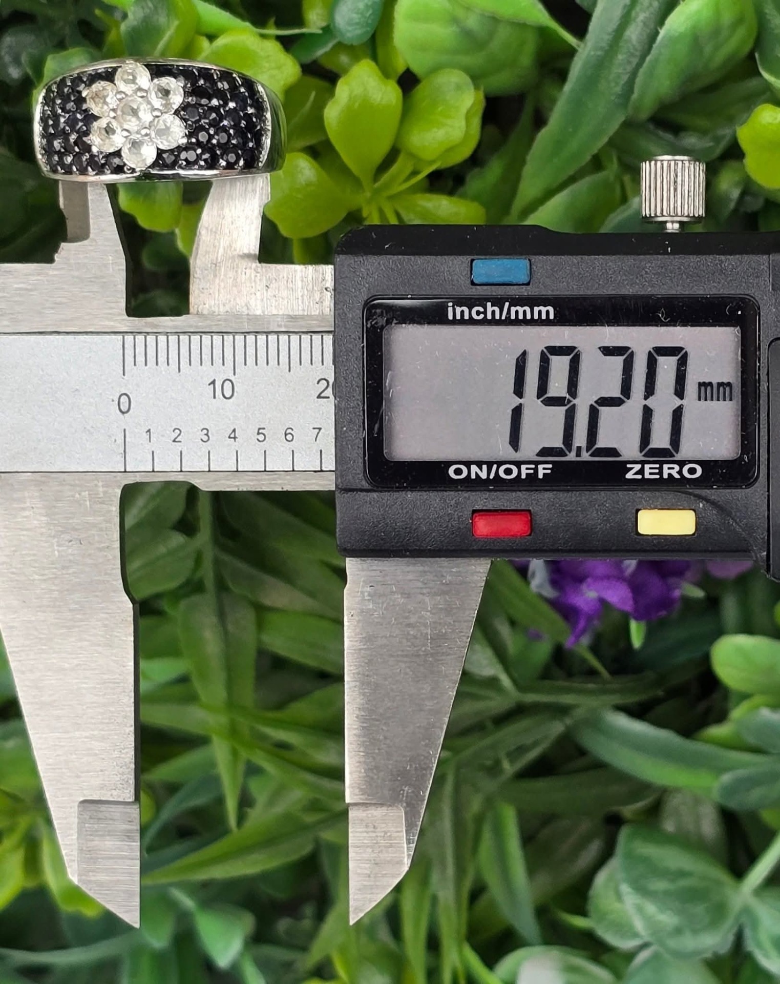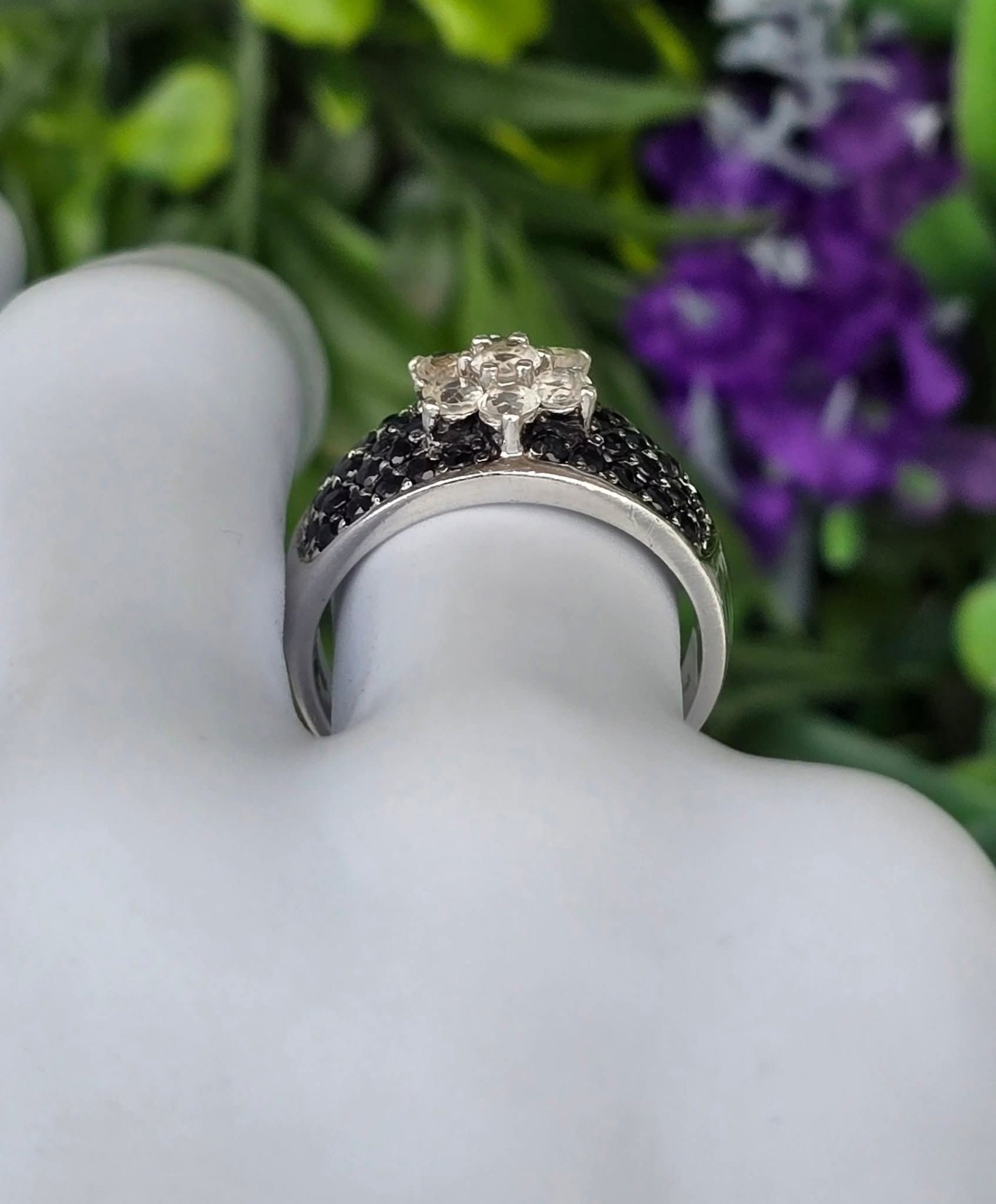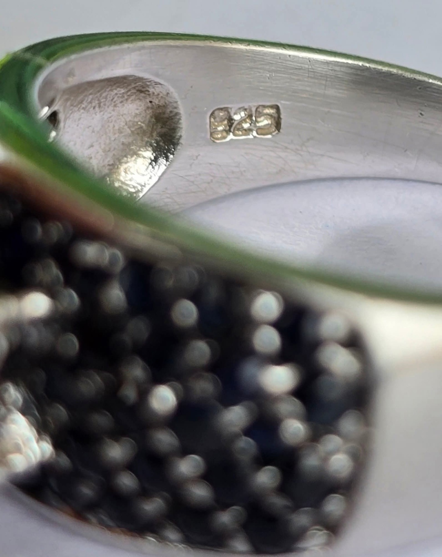 Inel "cocktail" vechi, din argint, cu 7 topaze albe și "pavé" din 44 safire "dark-blue" naturale.