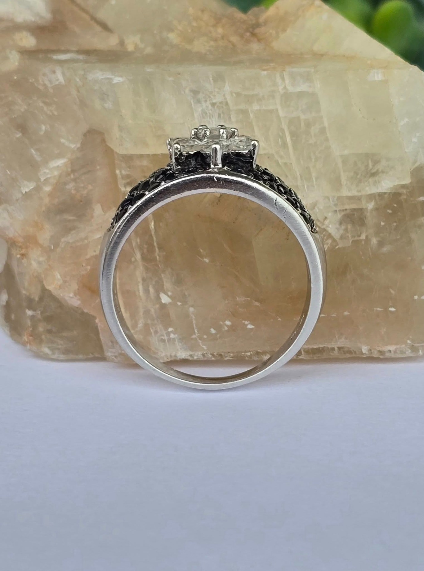 Inel "cocktail" vechi, din argint, cu 7 topaze albe și "pavé" din 44 safire "dark-blue" naturale.